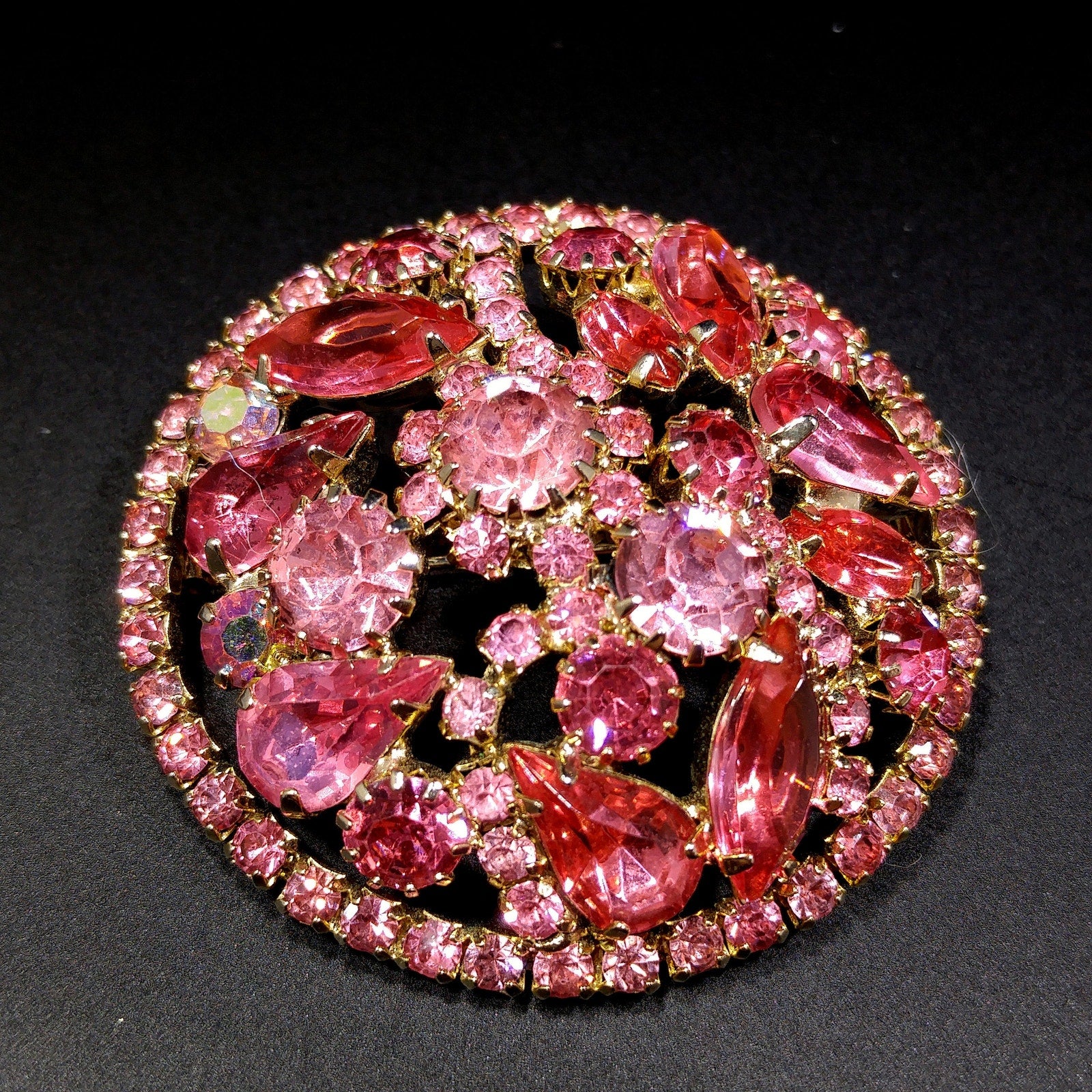 This is a stunning vintage Weiss pink rhinestone brooch and clip-on earring set from the 1960s. The round brooch and matching earrings feature brilliant shades of pink—ranging from soft petal pink to deeper rose and near-red stones—all prong set in bright gold-tone metal. The clip earrings are marked WEISS, a hallmark of quality mid-century costume jewelry.