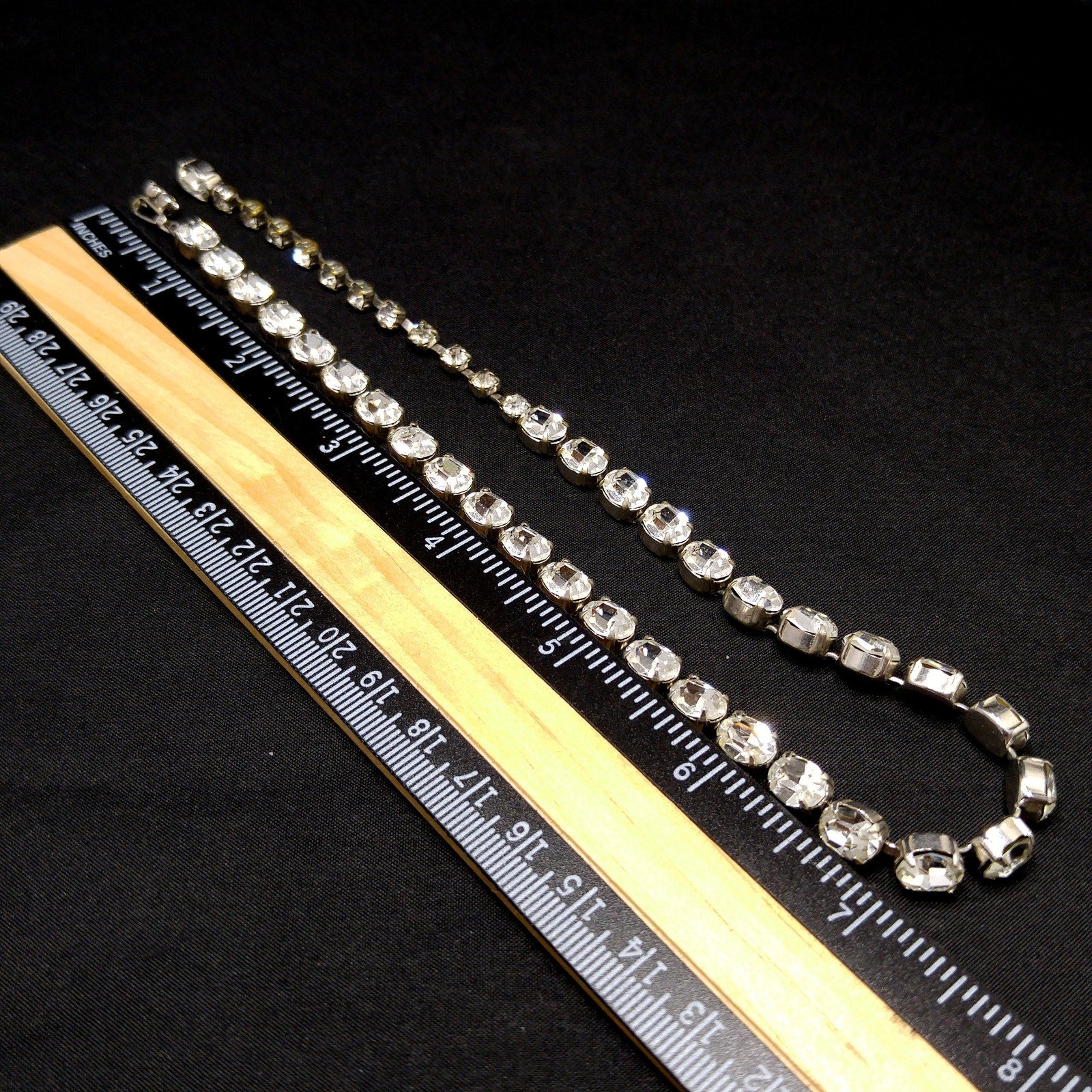 *Description: This is a beautiful Weiss clear rhinestone choker necklace with oval faceted clear rhinestones on a rhodium plated finished, all prong set, and finished with a unique clasp; an alligator clasp with rhinestones on top which can clamp to a number of spaces between the rhinestones giving you an adjustable necklace, from the 1950s or before. This would be a gorgeous necklace at a wedding or any formal event. All rhinestones are present and full of sparkle. This would be a great addition to your vintage jewelry collection or make a great vintage gift!