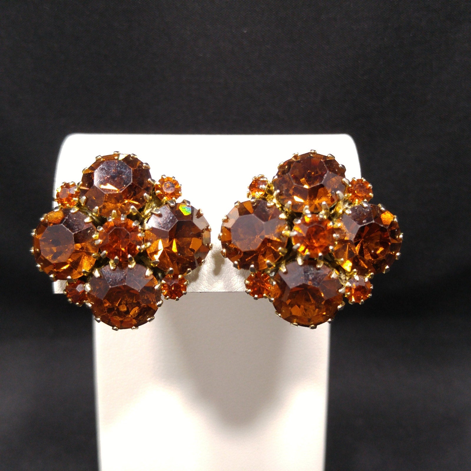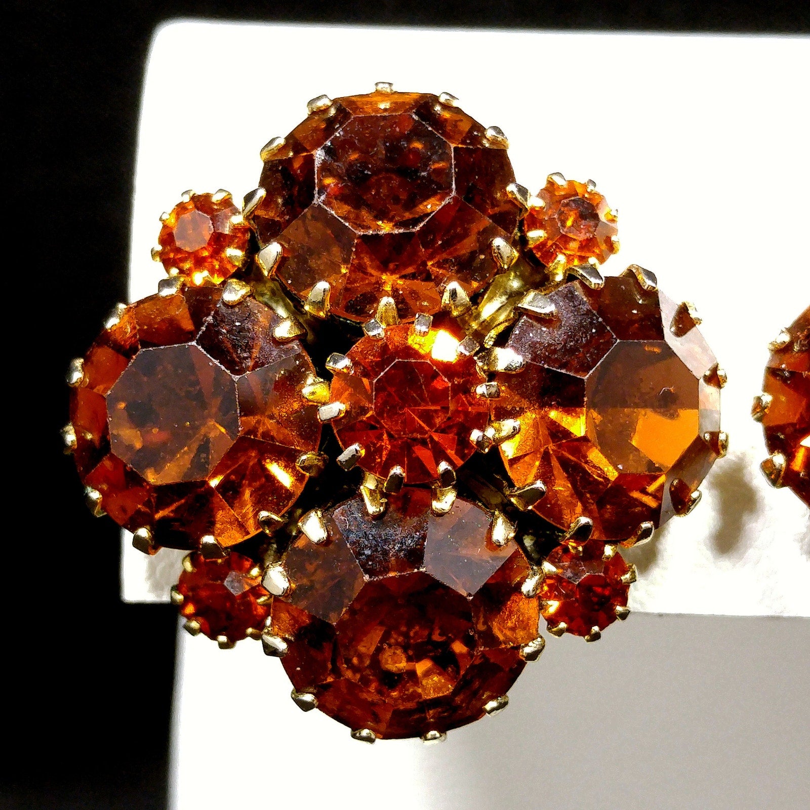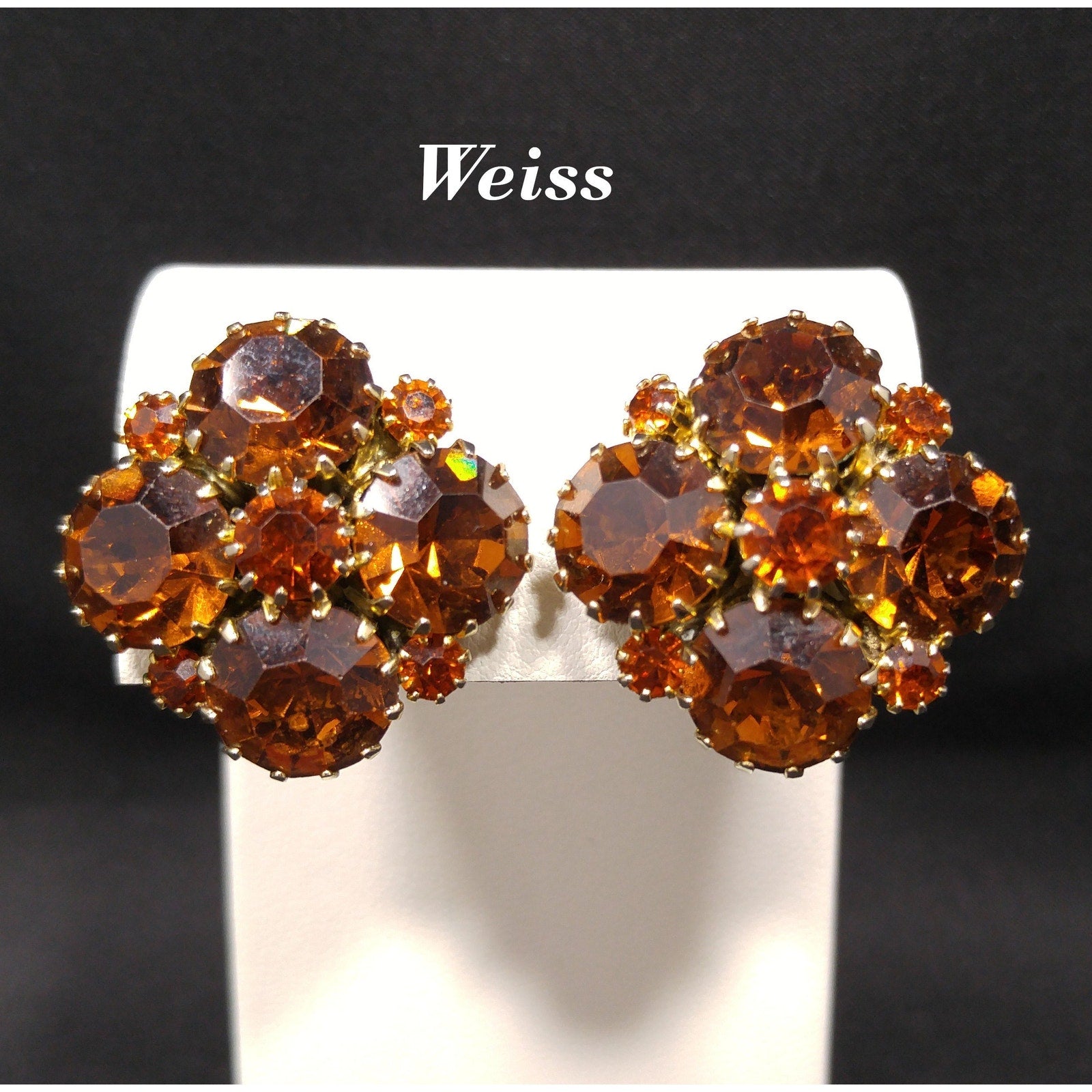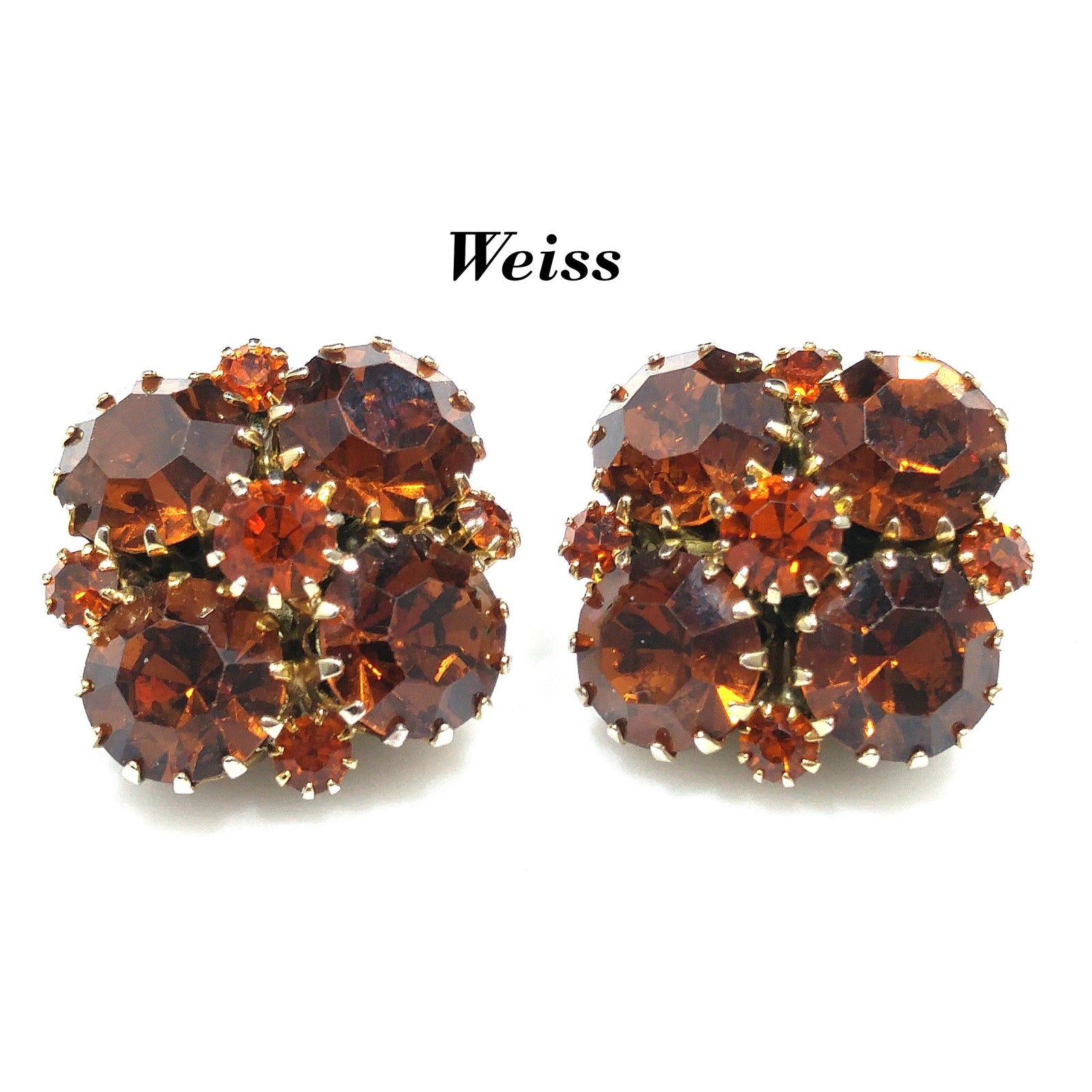 *Description: This is a beautiful pair of Weiss floral earrings in topaz or rootbeer rhinestones. The large chaton cut rhinestones are dog-toothed prong set, holding them securely in place. There is a hint of orange in the center and accent rhinestones. The earrings are set on gold plated backing and were in circulation in the late 1950s to 1960s. This would be a great addition to your vintage jewelry collection or make a great vintage gift!