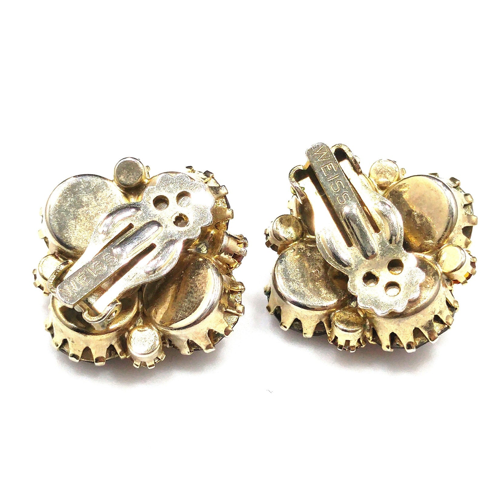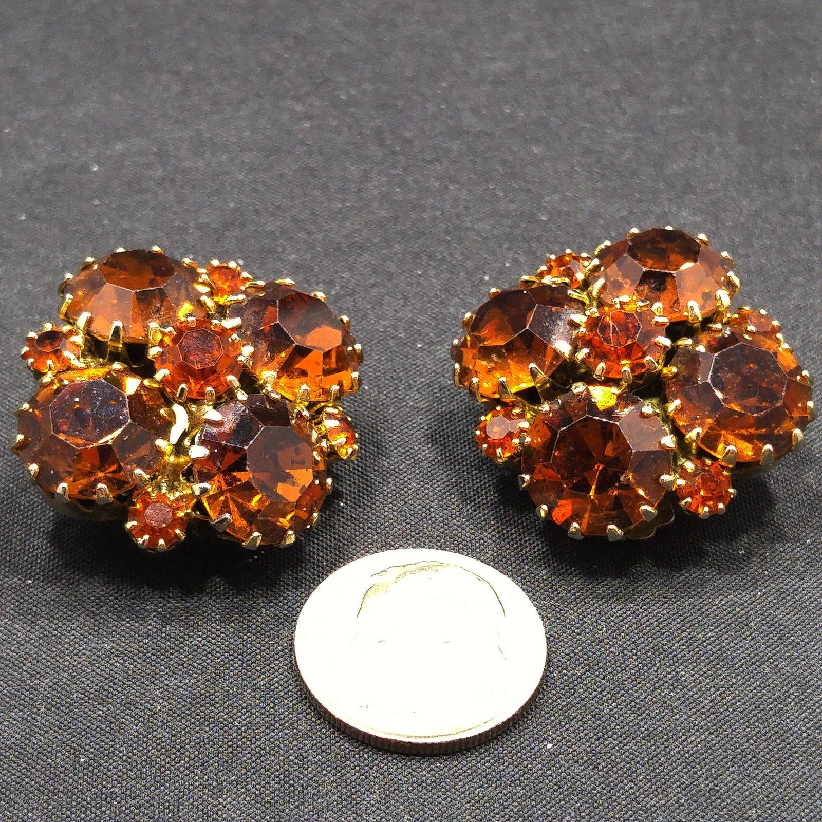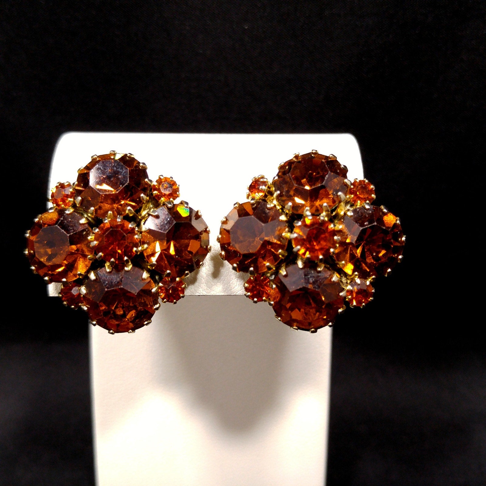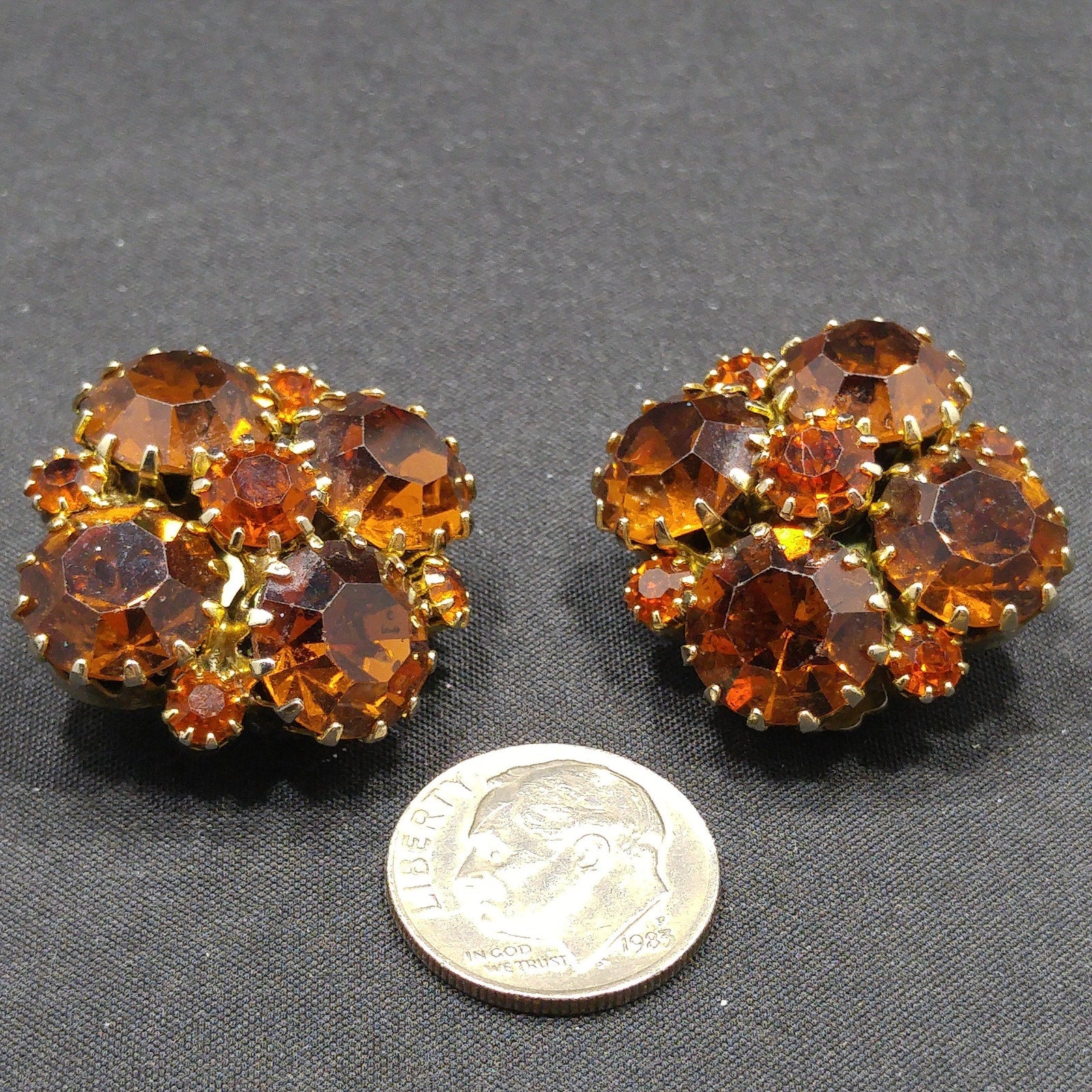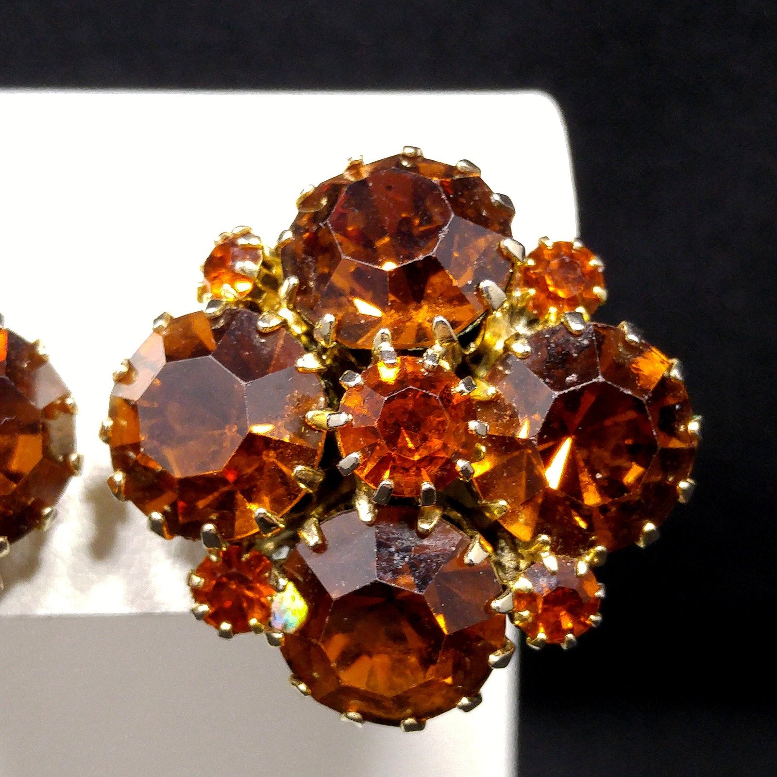 *Description: This is a beautiful pair of Weiss floral earrings in topaz or rootbeer rhinestones. The large chaton cut rhinestones are dog-toothed prong set, holding them securely in place. There is a hint of orange in the center and accent rhinestones. The earrings are set on gold plated backing and were in circulation in the late 1950s to 1960s. This would be a great addition to your vintage jewelry collection or make a great vintage gift!