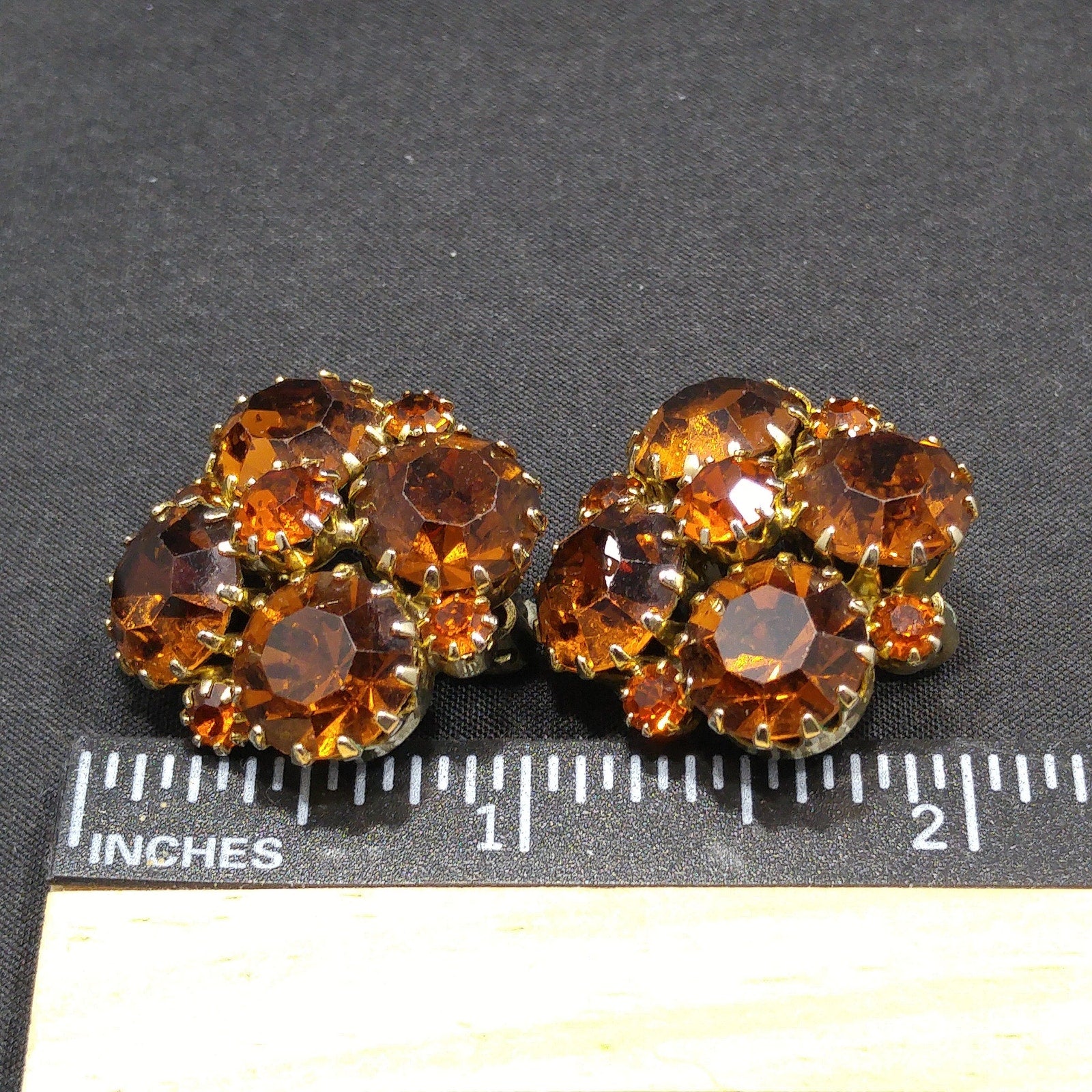 Weiss Topaz Rootbeer Rhinestone Clip Earrings, Gold Plated, Floral Design, 1960s Vintage
