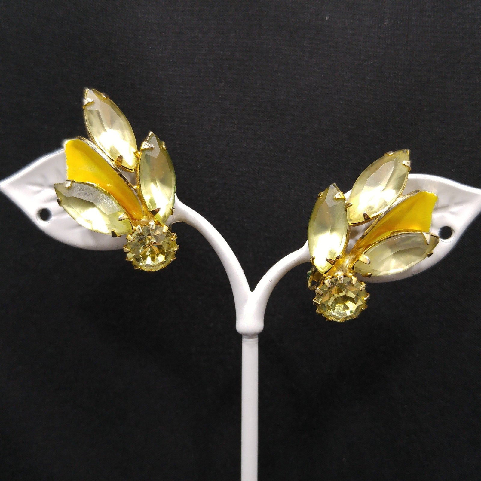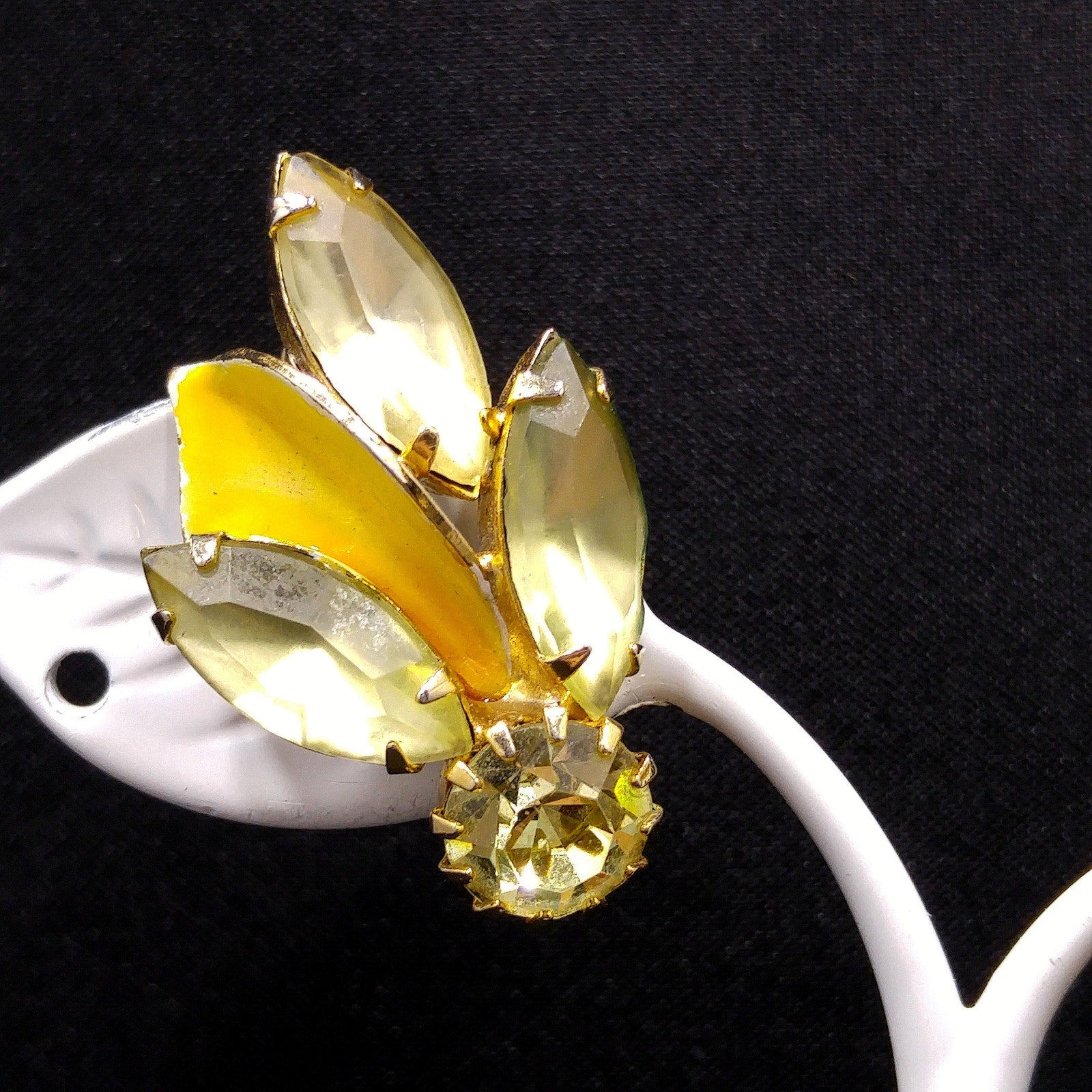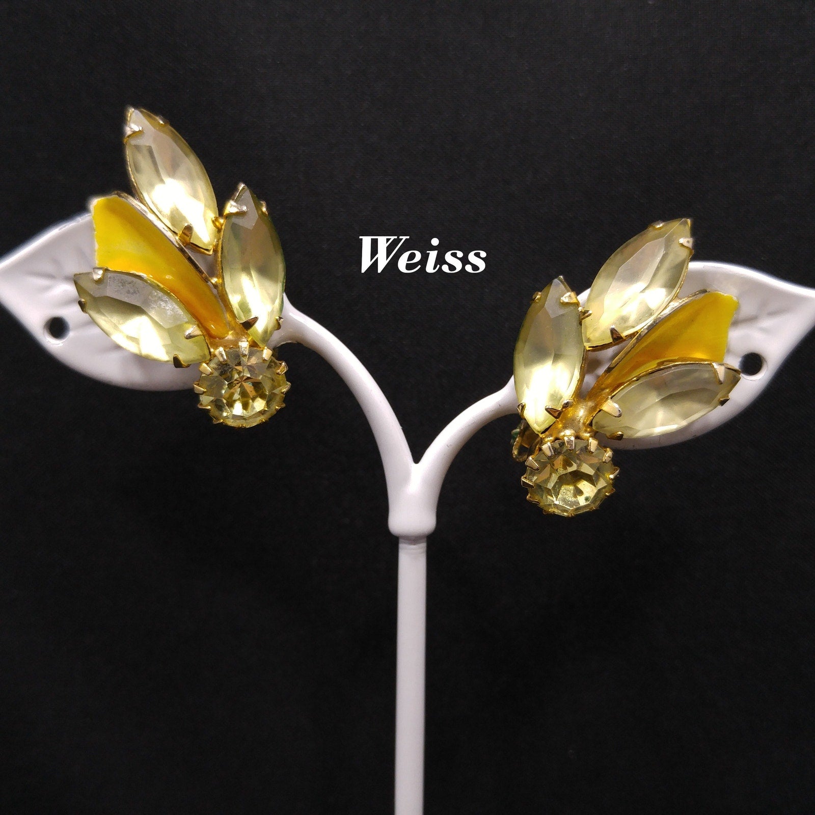 *Description: This is a beautiful mid-century pair of Weiss floral clip on earrings with a jonquil rhinestone center and leaves in yellow enamel with petals in frosty light yellow marquise cut rhinestones. The earrings are gold plated and are signed WEISS on the back of each clip. This would be a great addition to your vintage jewelry collection or make a great vintage gift!