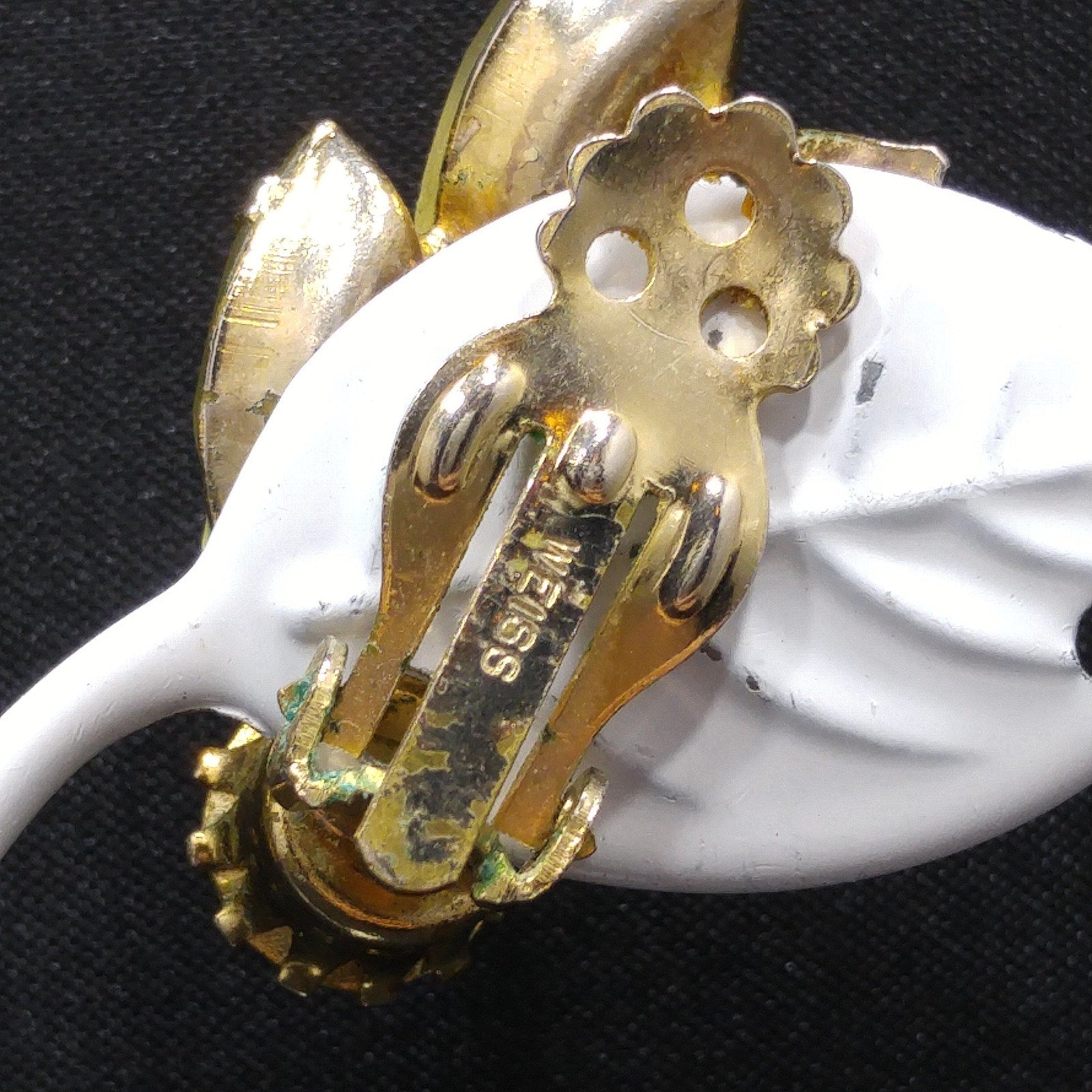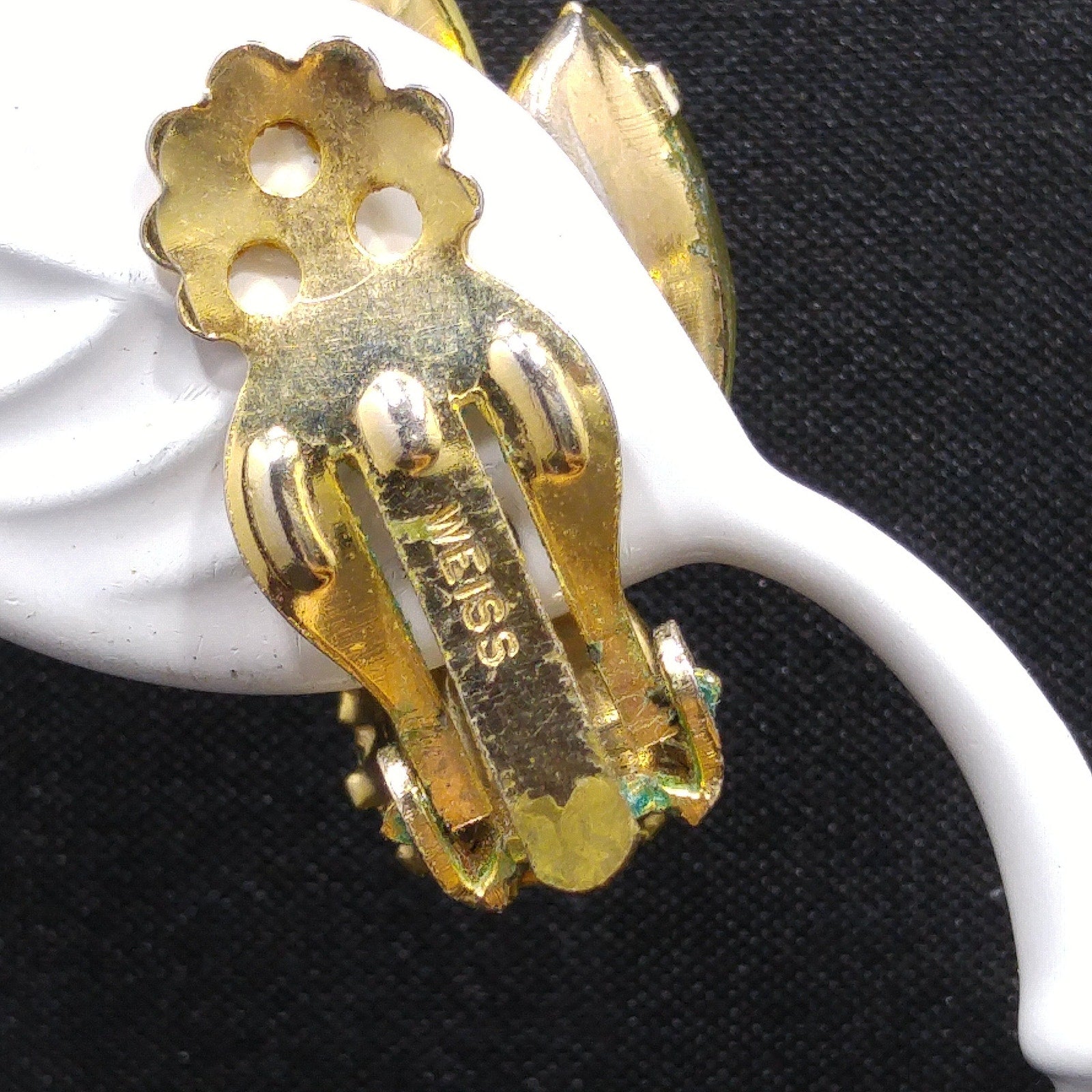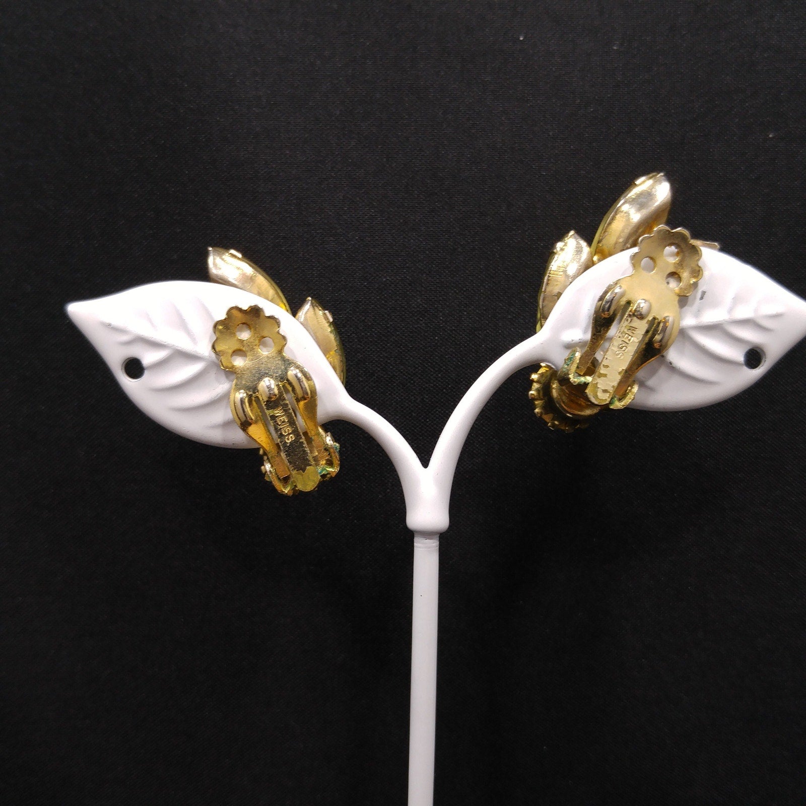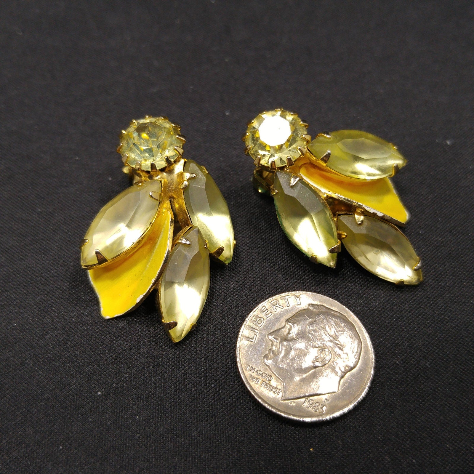 *Description: This is a beautiful mid-century pair of Weiss floral clip on earrings with a jonquil rhinestone center and leaves in yellow enamel with petals in frosty light yellow marquise cut rhinestones. The earrings are gold plated and are signed WEISS on the back of each clip. This would be a great addition to your vintage jewelry collection or make a great vintage gift!
