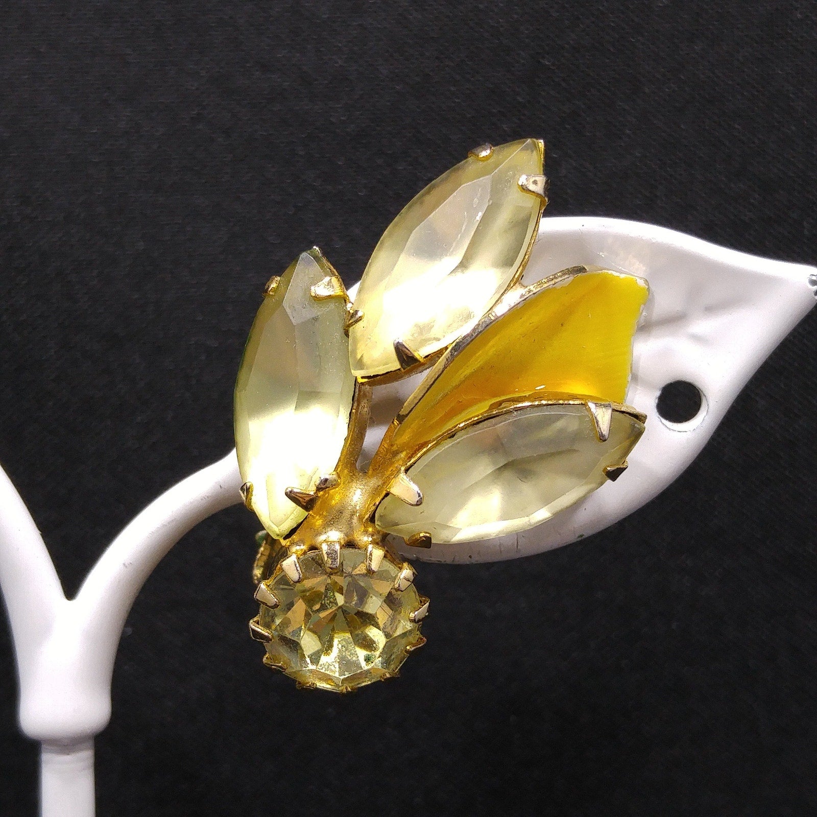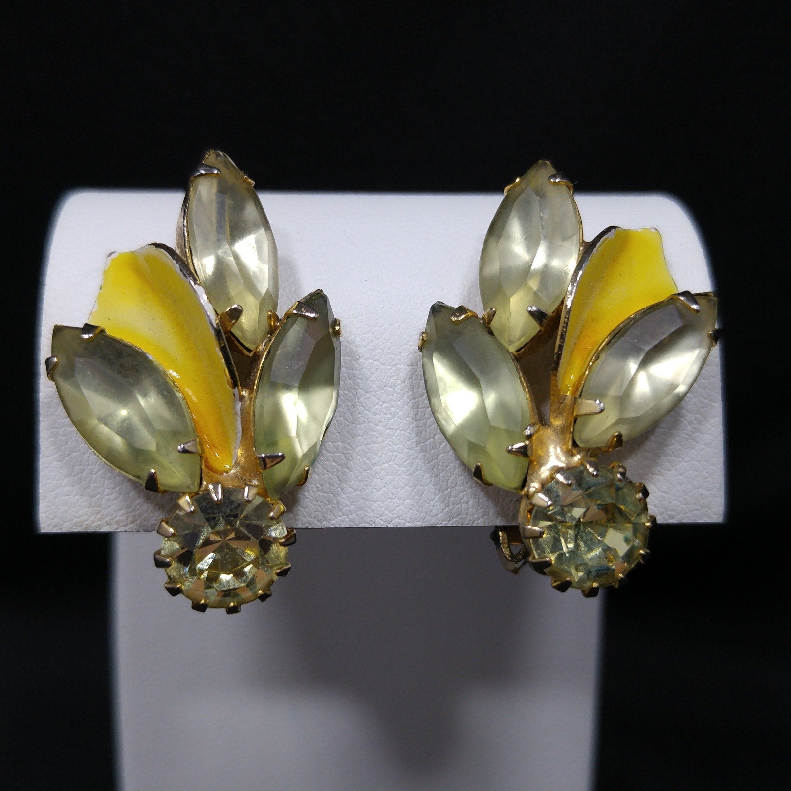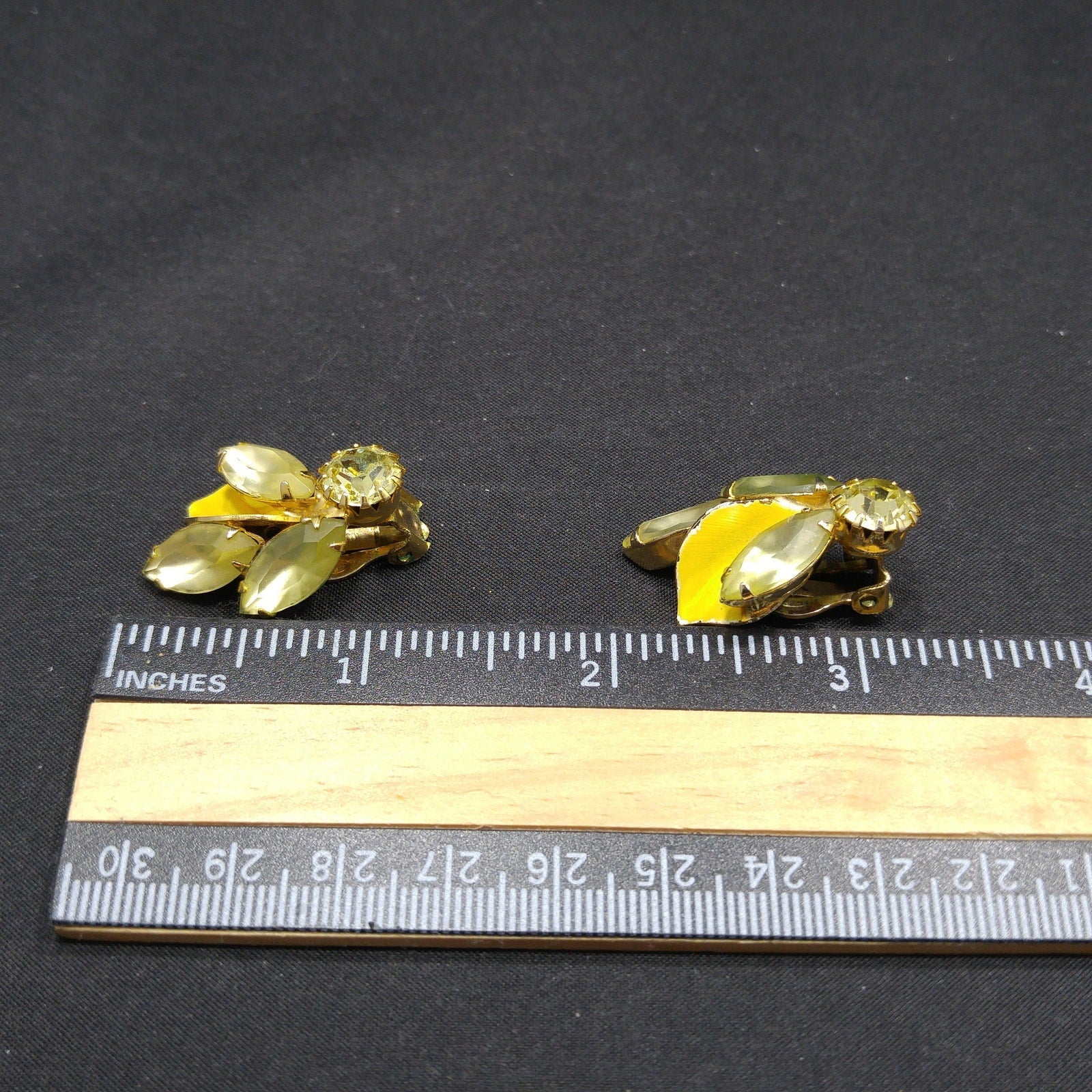 Weiss Yellow Enamel Jonquil Rhinestone Clip Earrings, Gold Plated, 1950s Vintage