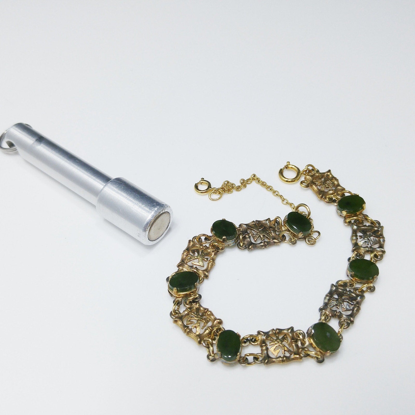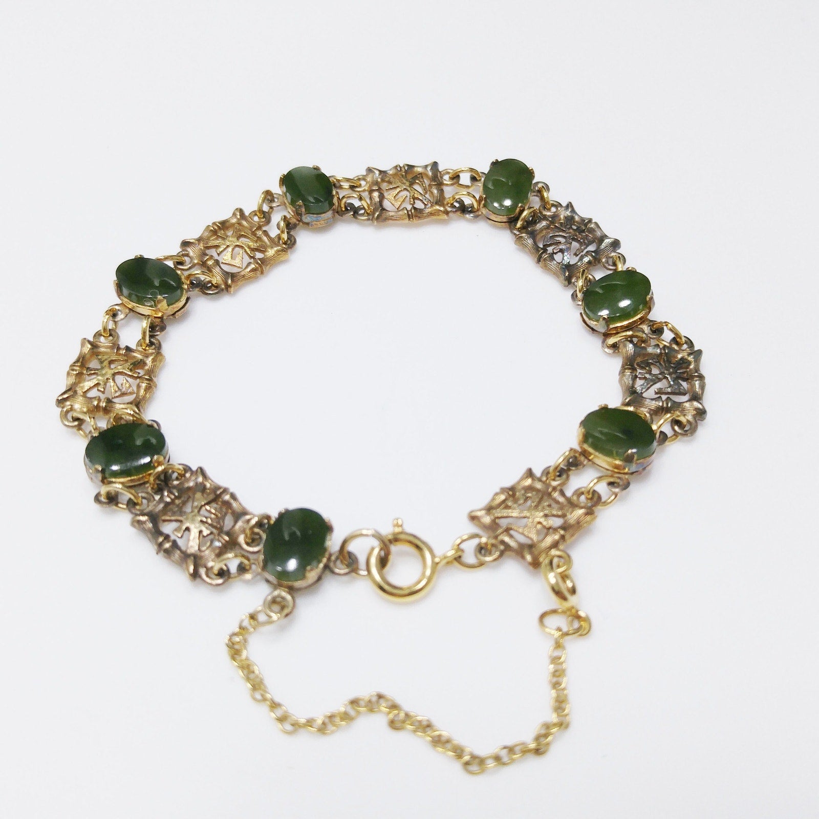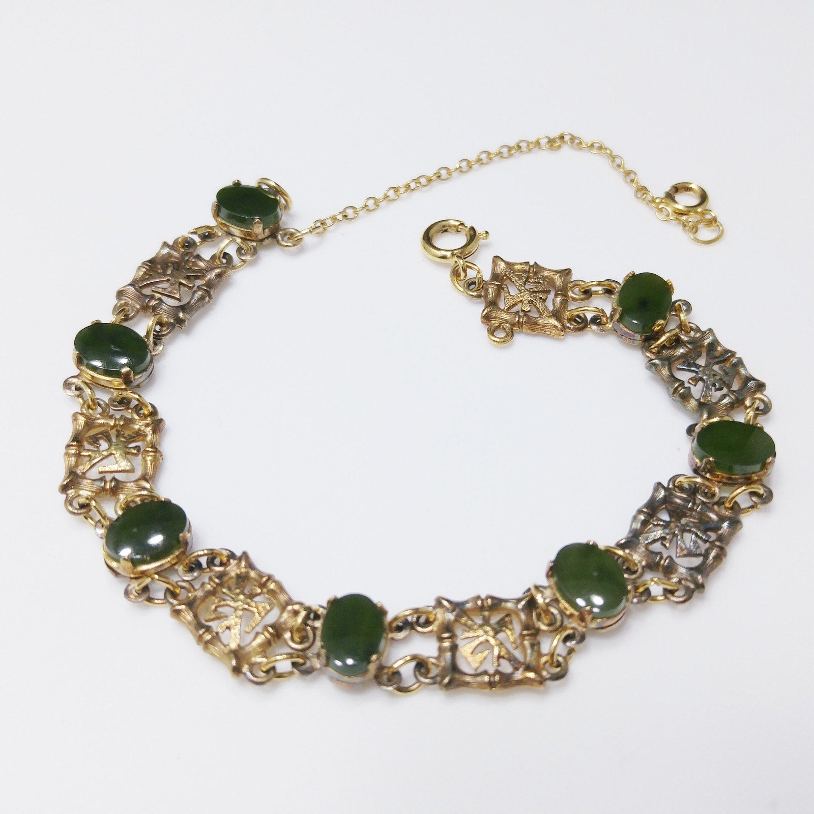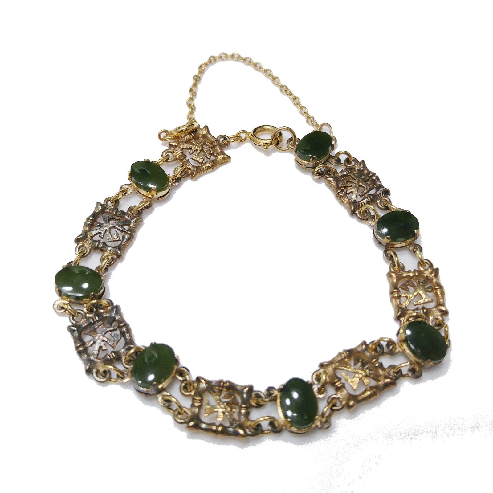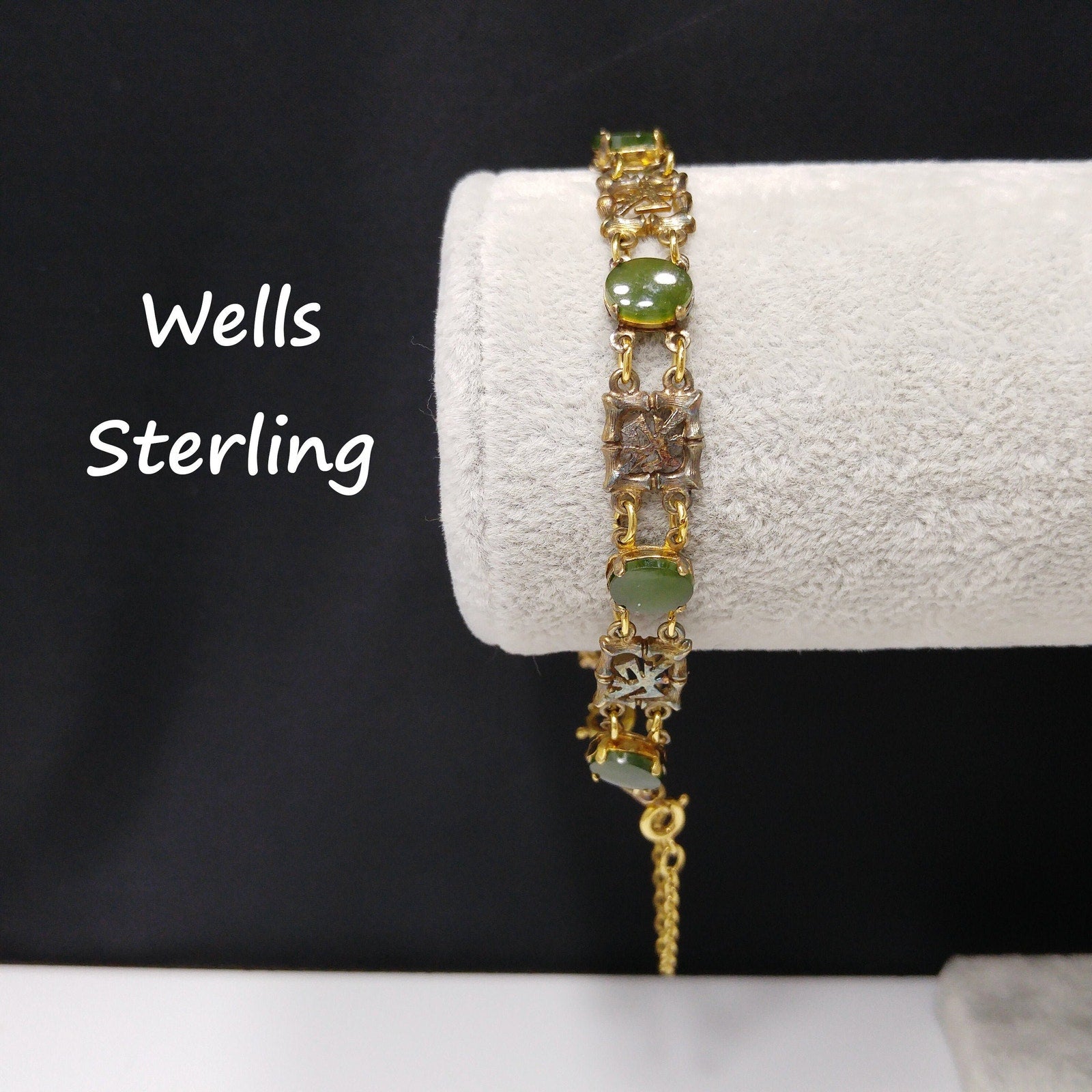 *Description: This is a mid-century bracelet made by Wells Sterling with green gemstones of Chrysoprase. Wells, Inc. was in business in Attleboro, MA from 1922 to 1978. Each of the bamboo & Asian symbol links are signed Wells Ster. Some near the clasp have worn off. The links in between are gold plated and hold the gemstones. I tested the gemstones and they fall into the Chrysoprase, Nephrite, and Emerald area of the Presidium Gem Tester. The spring ring and safety chain are more gold in tone than the rest of the bracelet. I have reviewed others with the same bracelet and they all have this characteristic. I do not know the meaning of the Asian symbol but it is in every other link. This would be a great addition to your vintage jewelry collection or make a great vintage gift!