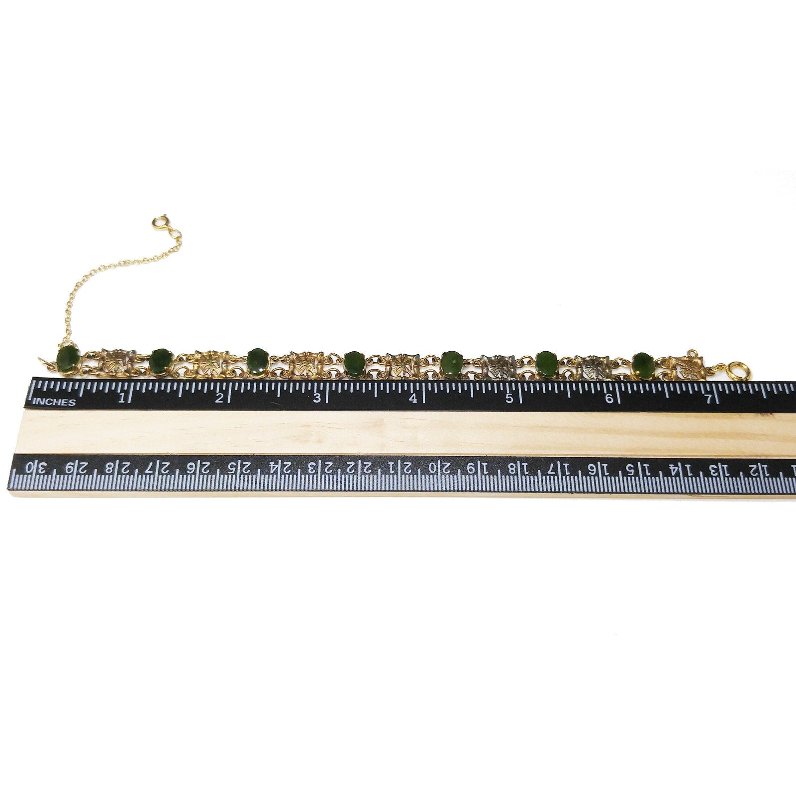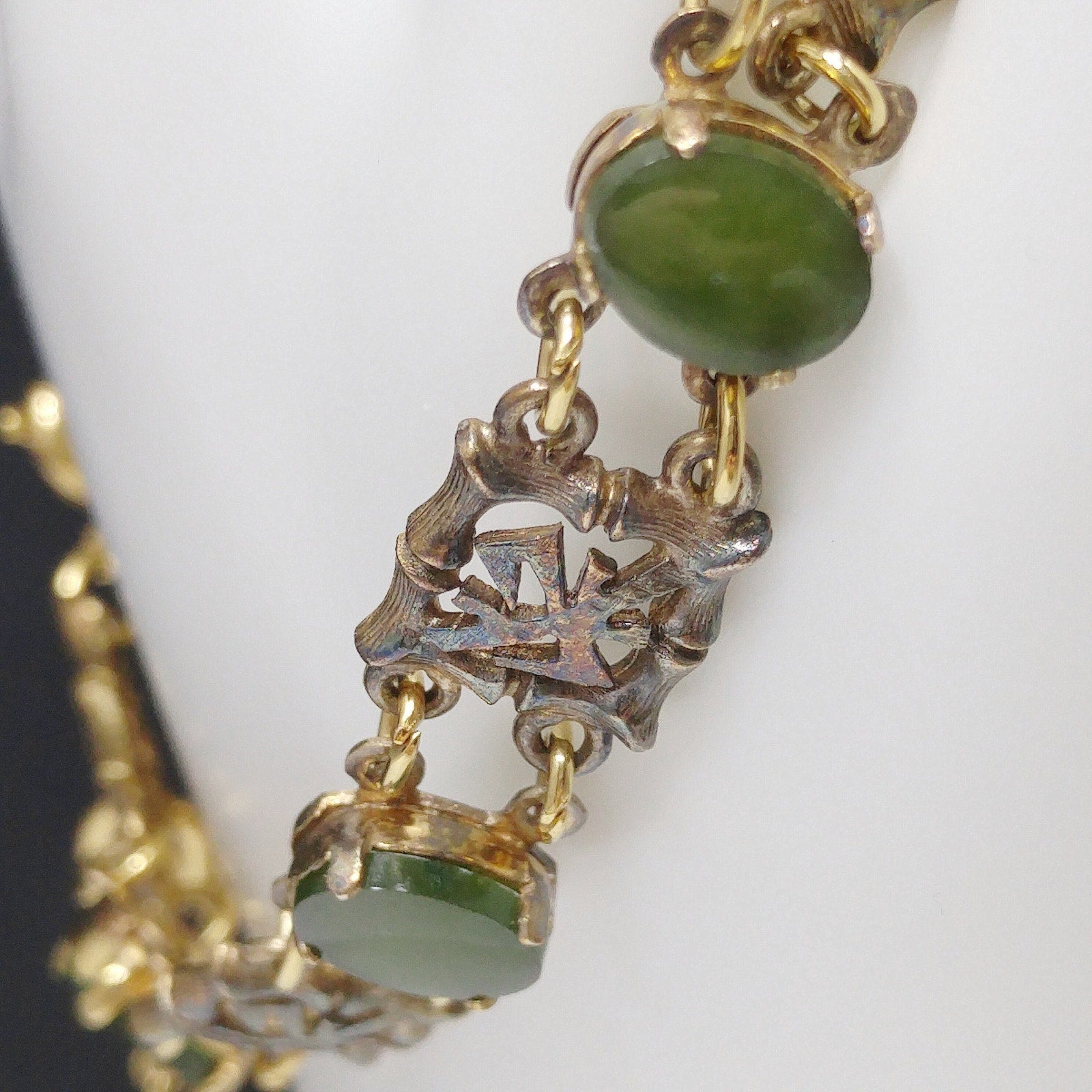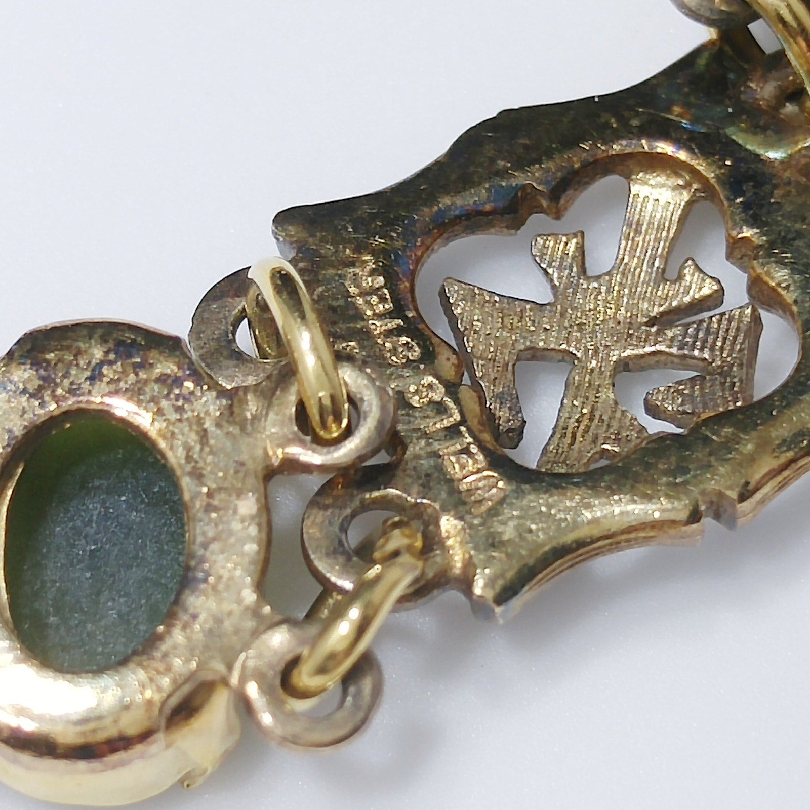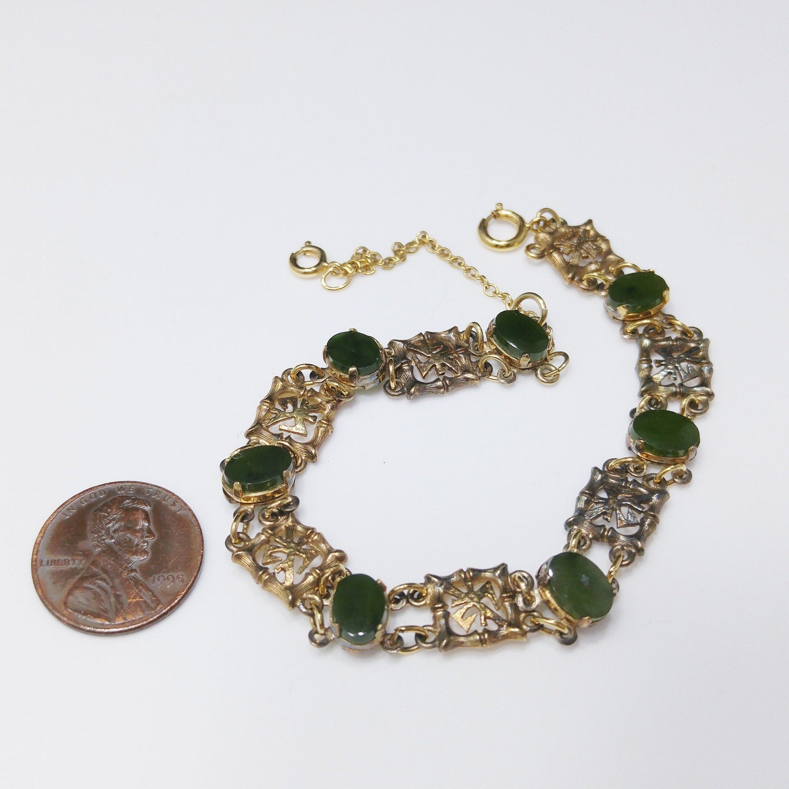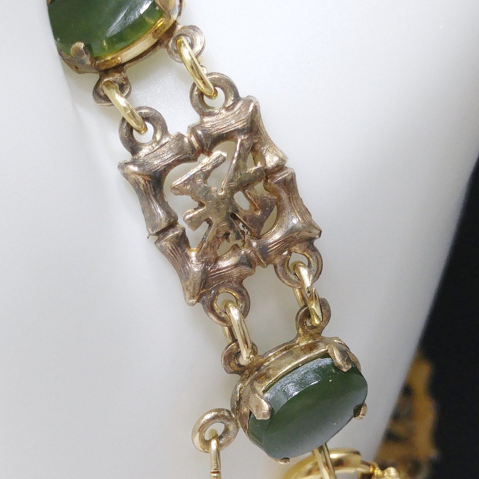 *Description: This is a mid-century bracelet made by Wells Sterling with green gemstones of Chrysoprase. Wells, Inc. was in business in Attleboro, MA from 1922 to 1978. Each of the bamboo & Asian symbol links are signed Wells Ster. Some near the clasp have worn off. The links in between are gold plated and hold the gemstones. I tested the gemstones and they fall into the Chrysoprase, Nephrite, and Emerald area of the Presidium Gem Tester. The spring ring and safety chain are more gold in tone than the rest of the bracelet. I have reviewed others with the same bracelet and they all have this characteristic. I do not know the meaning of the Asian symbol but it is in every other link. This would be a great addition to your vintage jewelry collection or make a great vintage gift!