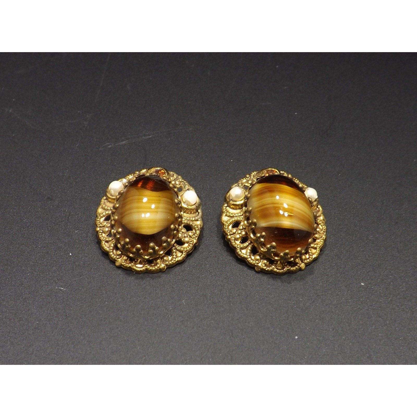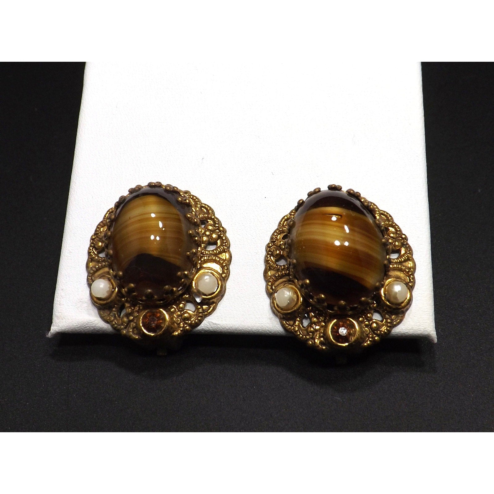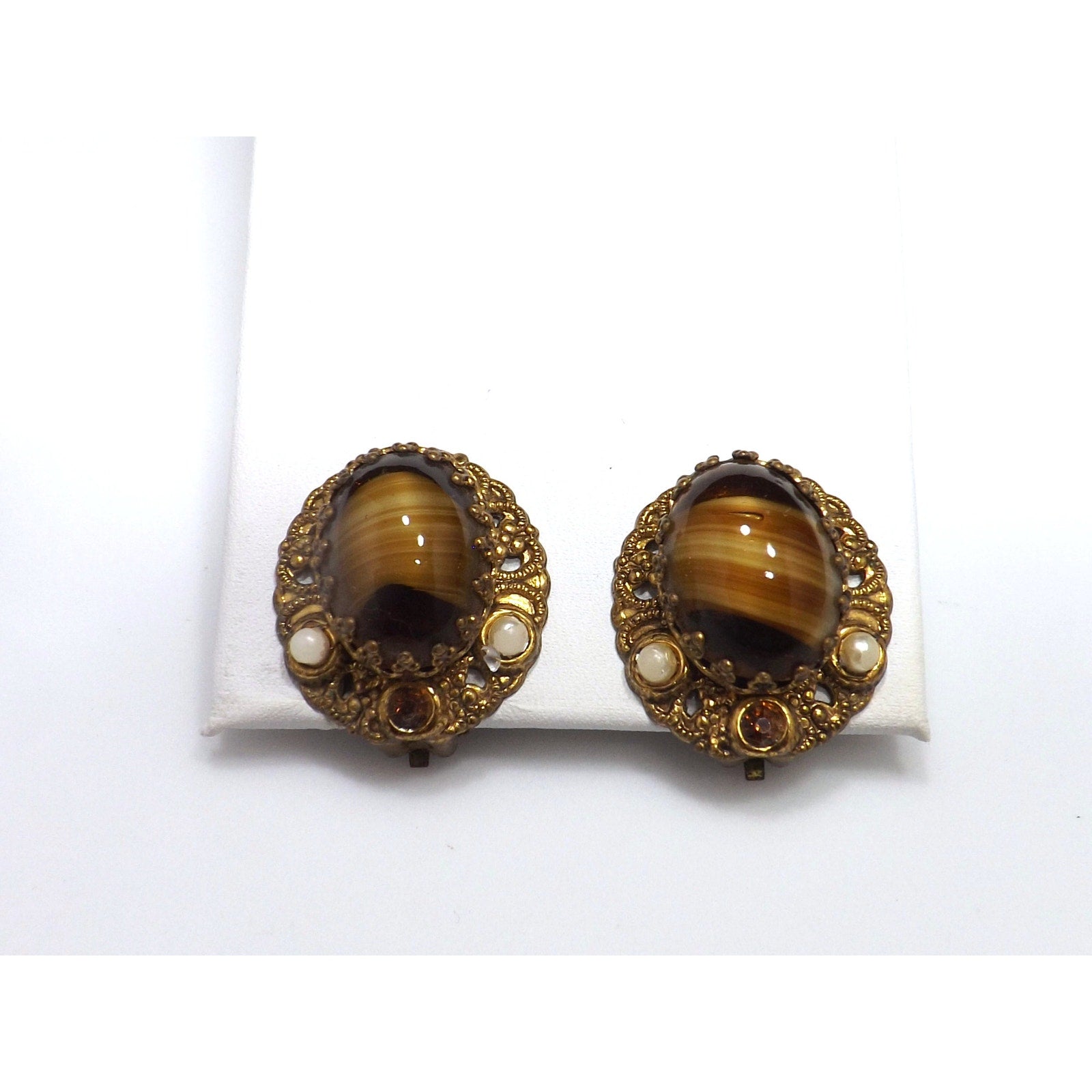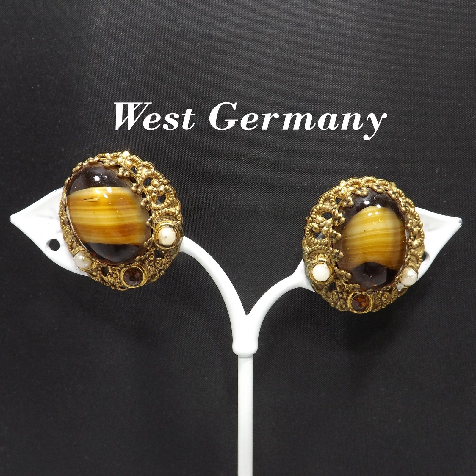 *Description: This is a beautiful pair of West Germany art glass topaz swirl cabochon clip on earrings from the 1950s. The filigree background is oval in shape and holds the center cabochon with special designed prongs. The art glass is accented with a topaz rhinestone and two white beads. This would be a great addition to your vintage jewelry collection or make a great vintage gift!