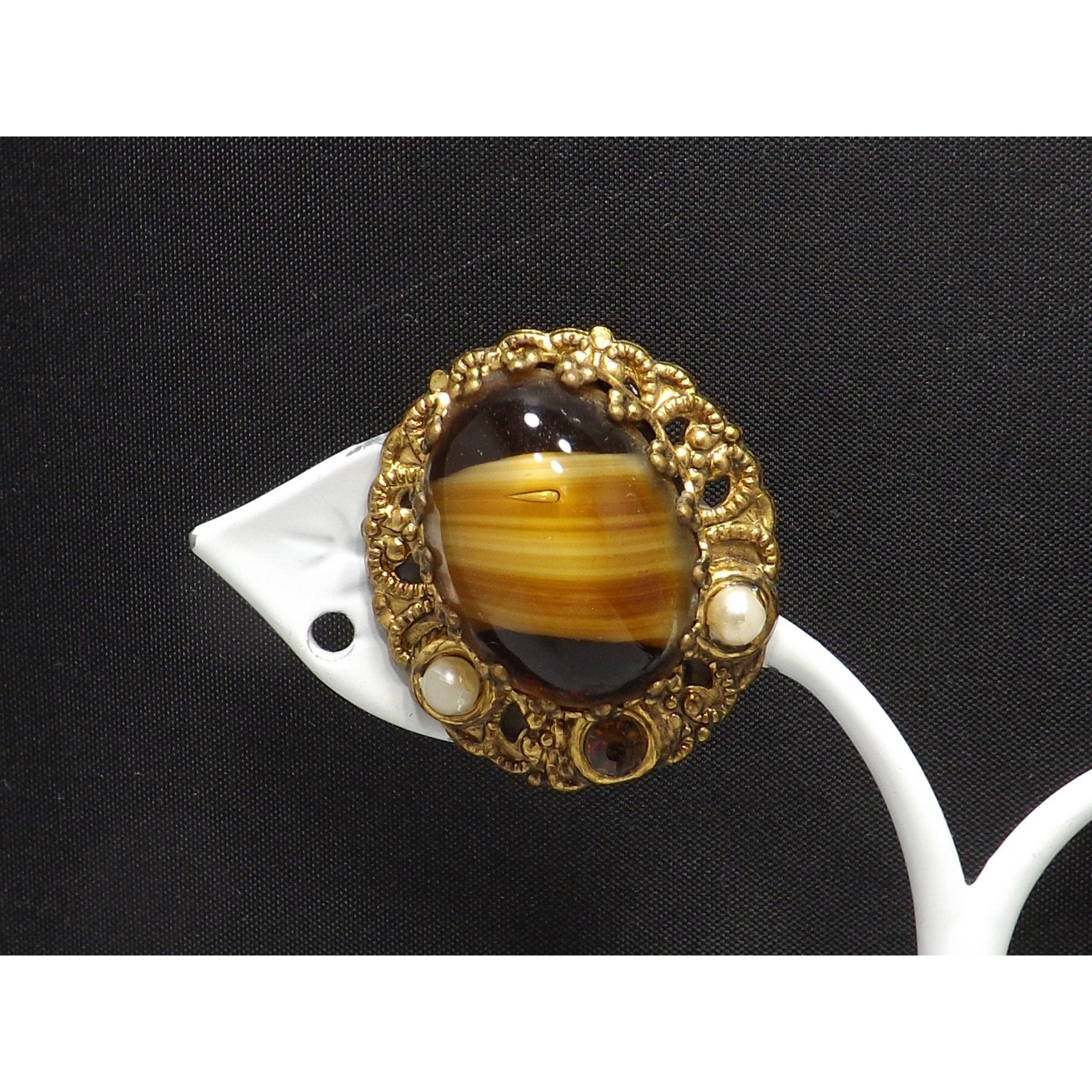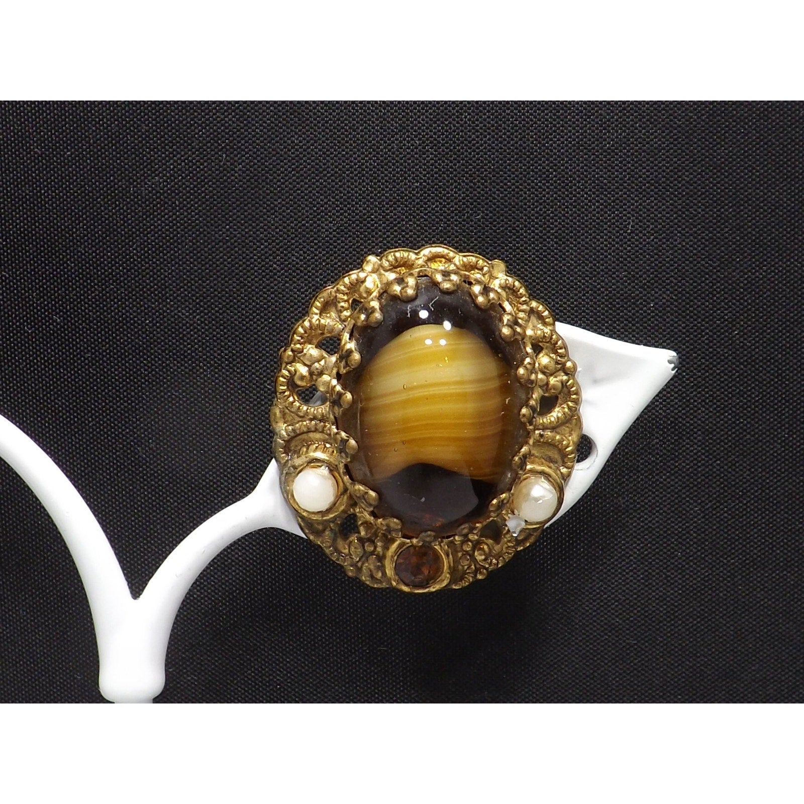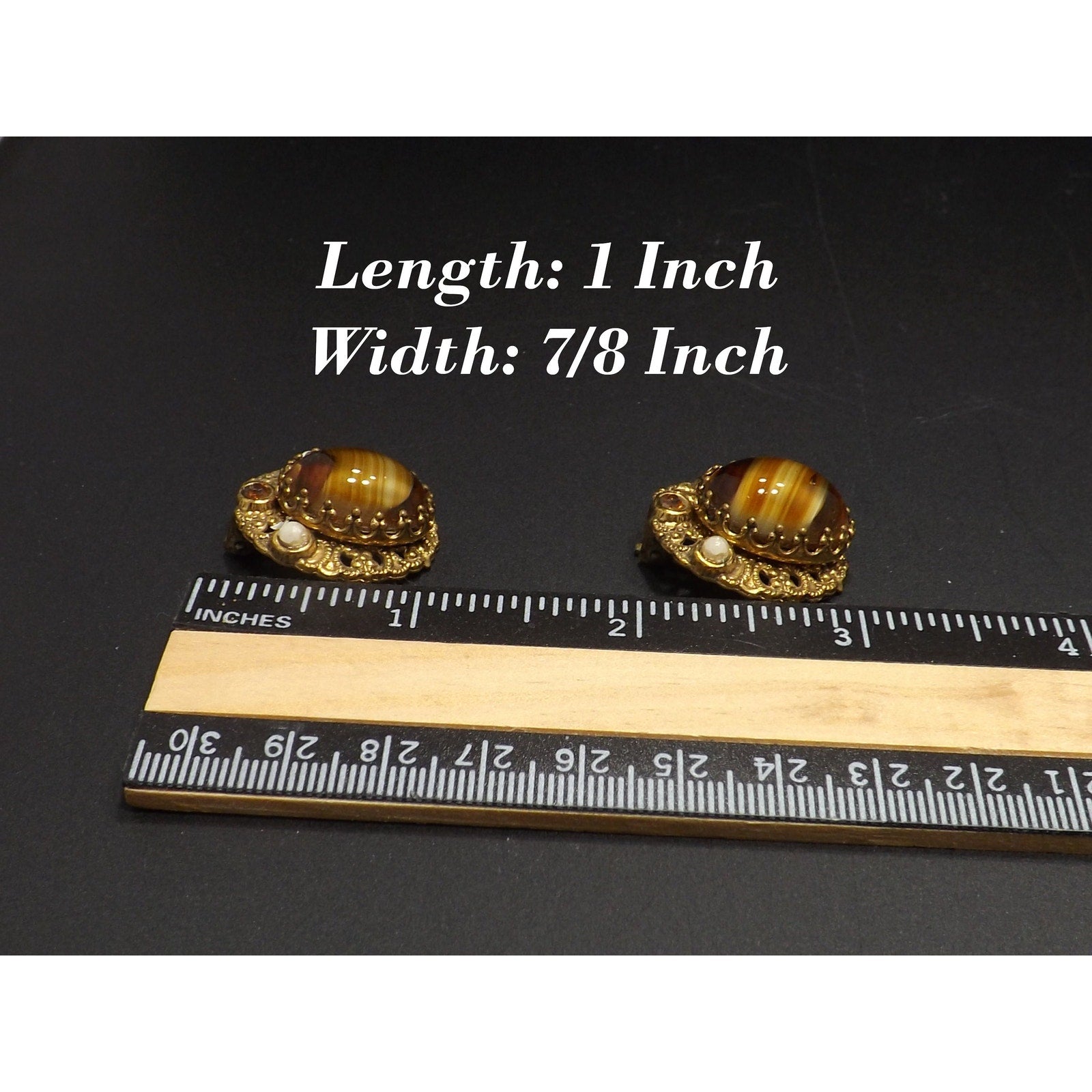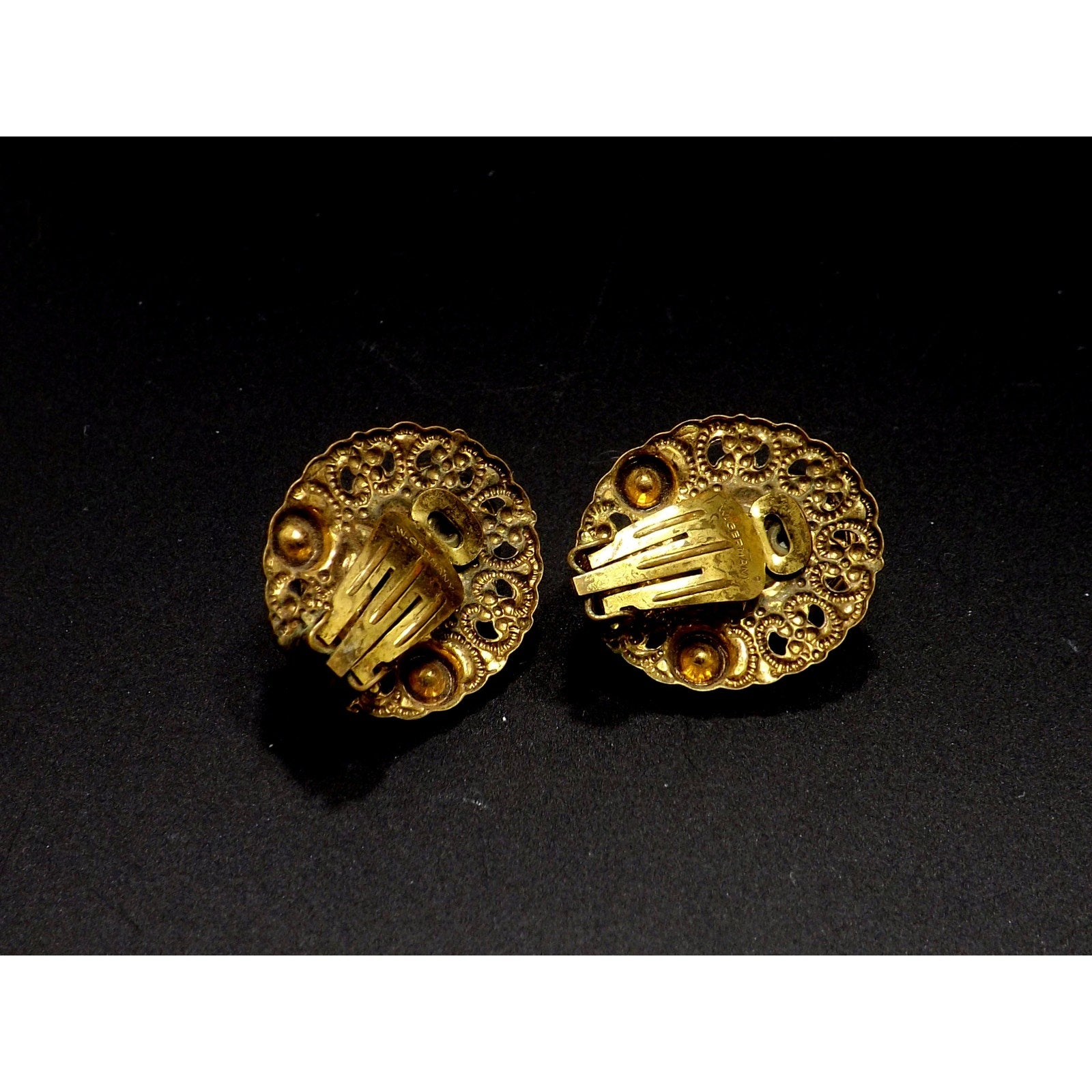 *Description: This is a beautiful pair of West Germany art glass topaz swirl cabochon clip on earrings from the 1950s. The filigree background is oval in shape and holds the center cabochon with special designed prongs. The art glass is accented with a topaz rhinestone and two white beads. This would be a great addition to your vintage jewelry collection or make a great vintage gift!