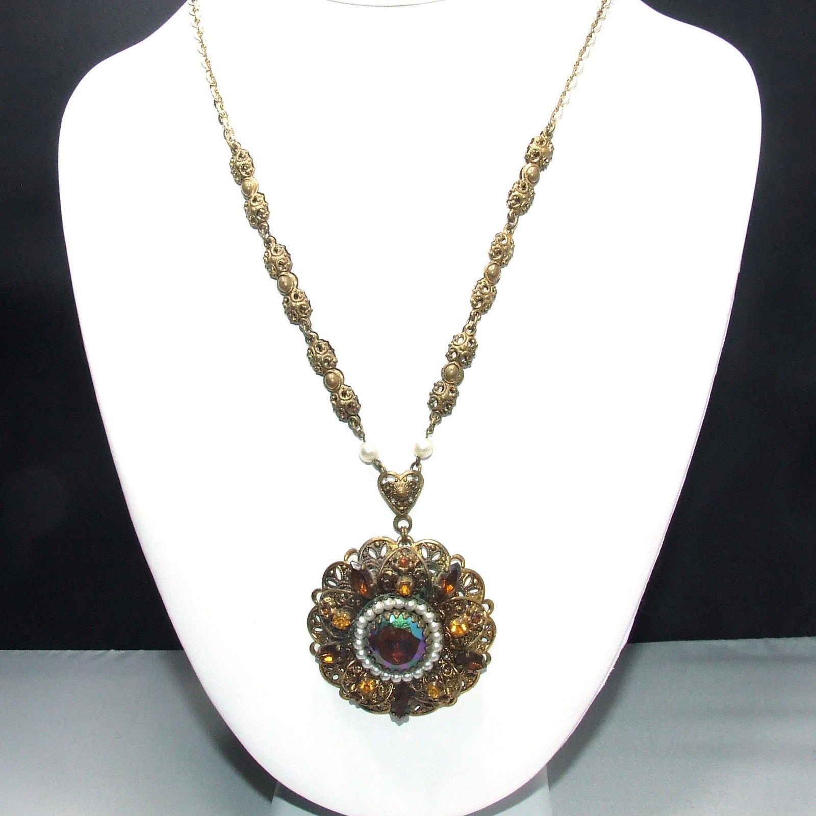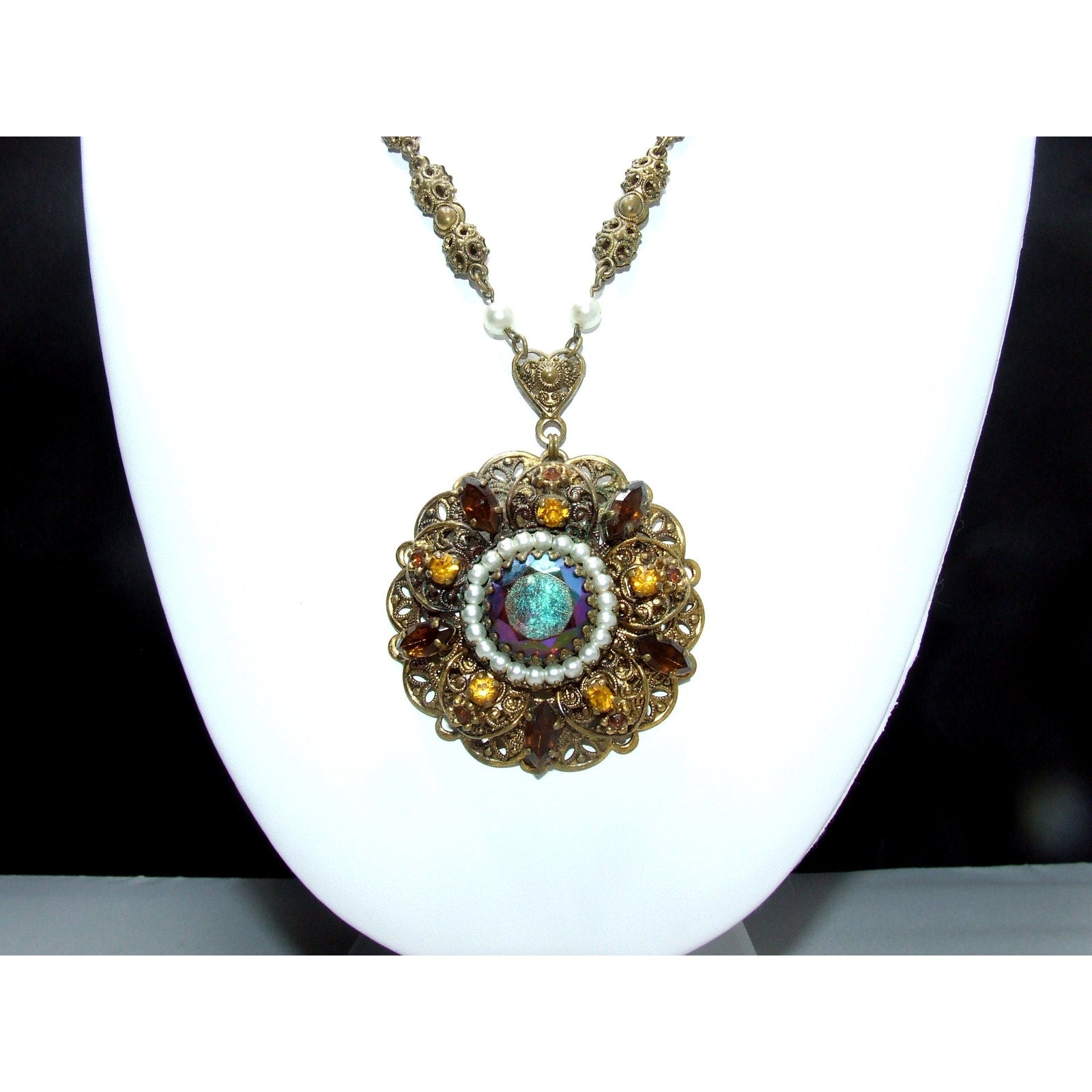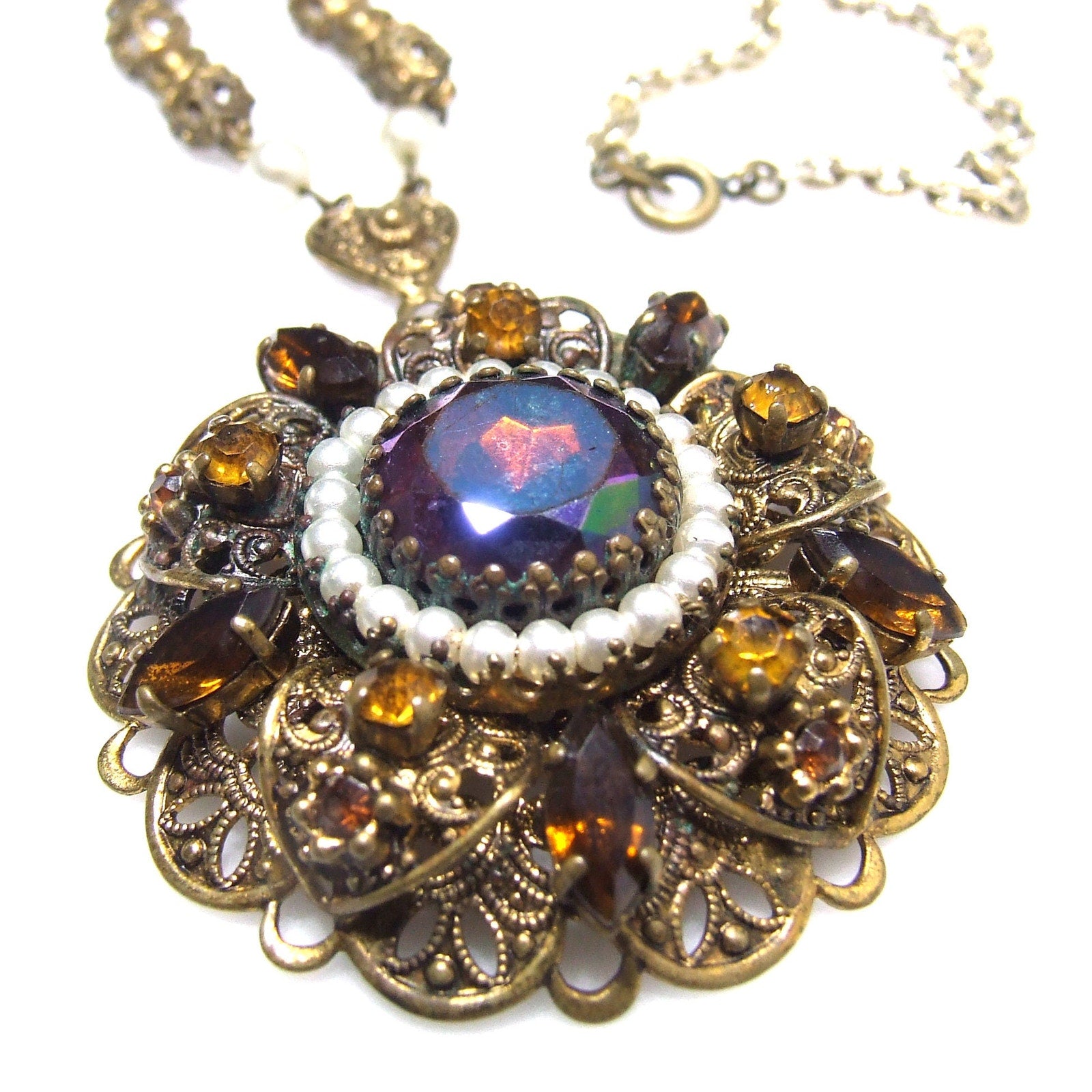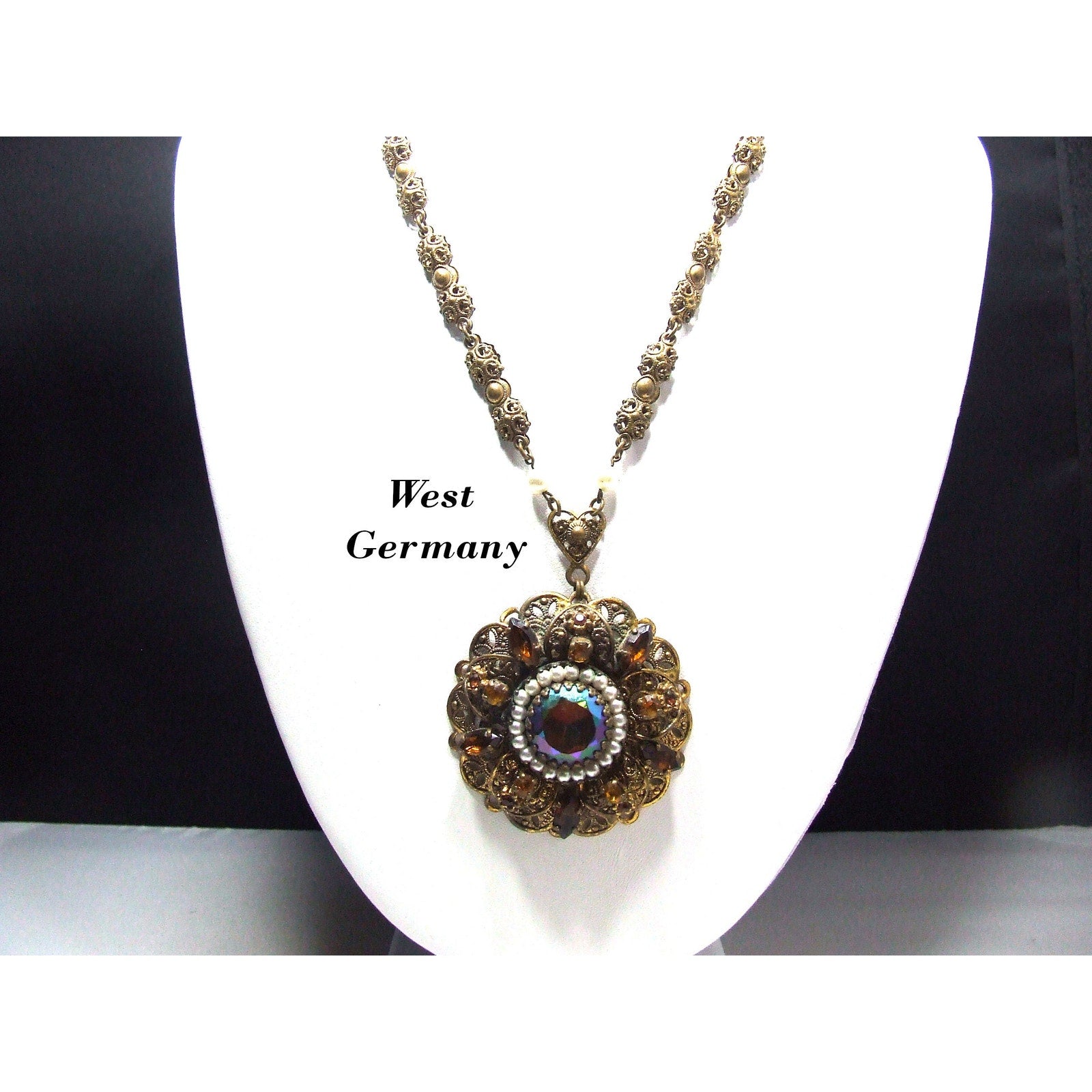 *Description: This is a beautiful West Germany rhinestone filigree necklace from the 1950s. The pendant is in a layered filigree design with a center carnival glass rhinestone, dog-toothed, with a circle of faux pearls. Then there are petals of filigree with light and dark topaz crystal rhinestones on a flat filigree base. The bail is heart shaped and this is where the tubular filigree chain begins with two faux pearls. Near the chain clasp is the ring with Made in Western Germany stamped on one side. The necklace is unique and gorgeous. This would be a great addition to your vintage jewelry collection or make a great vintage gift!