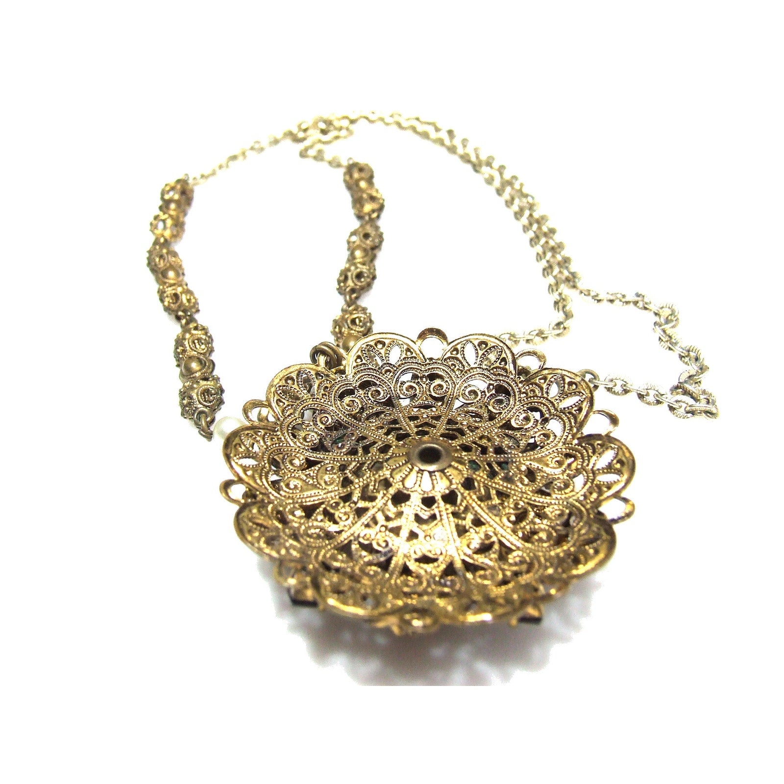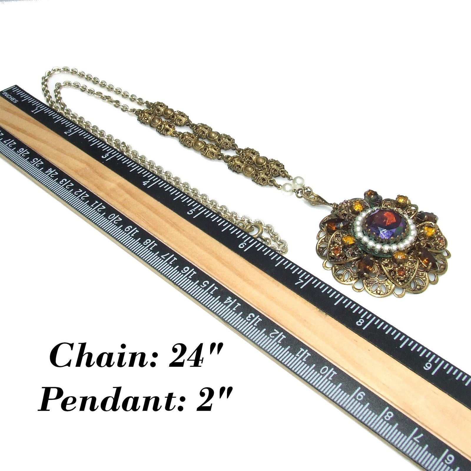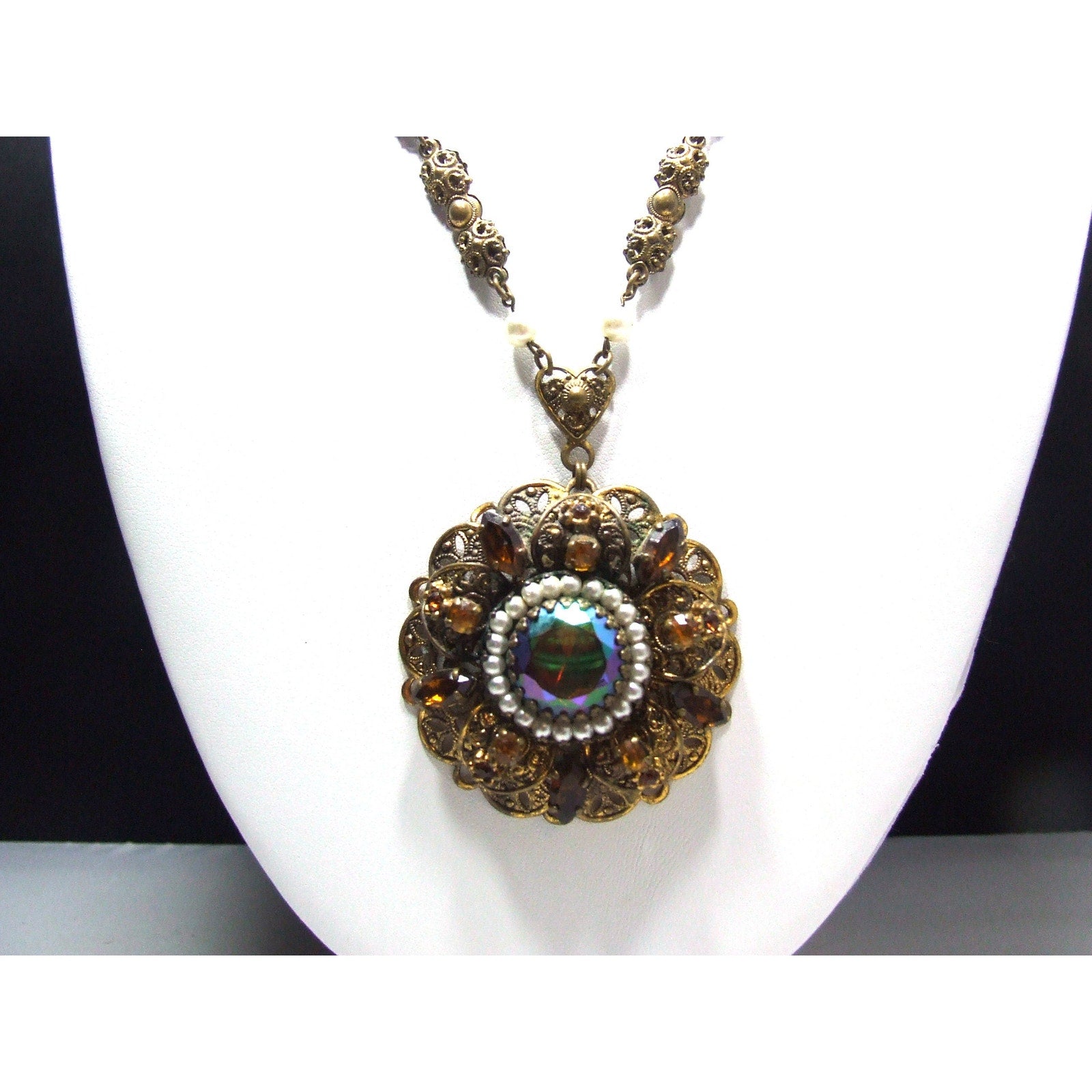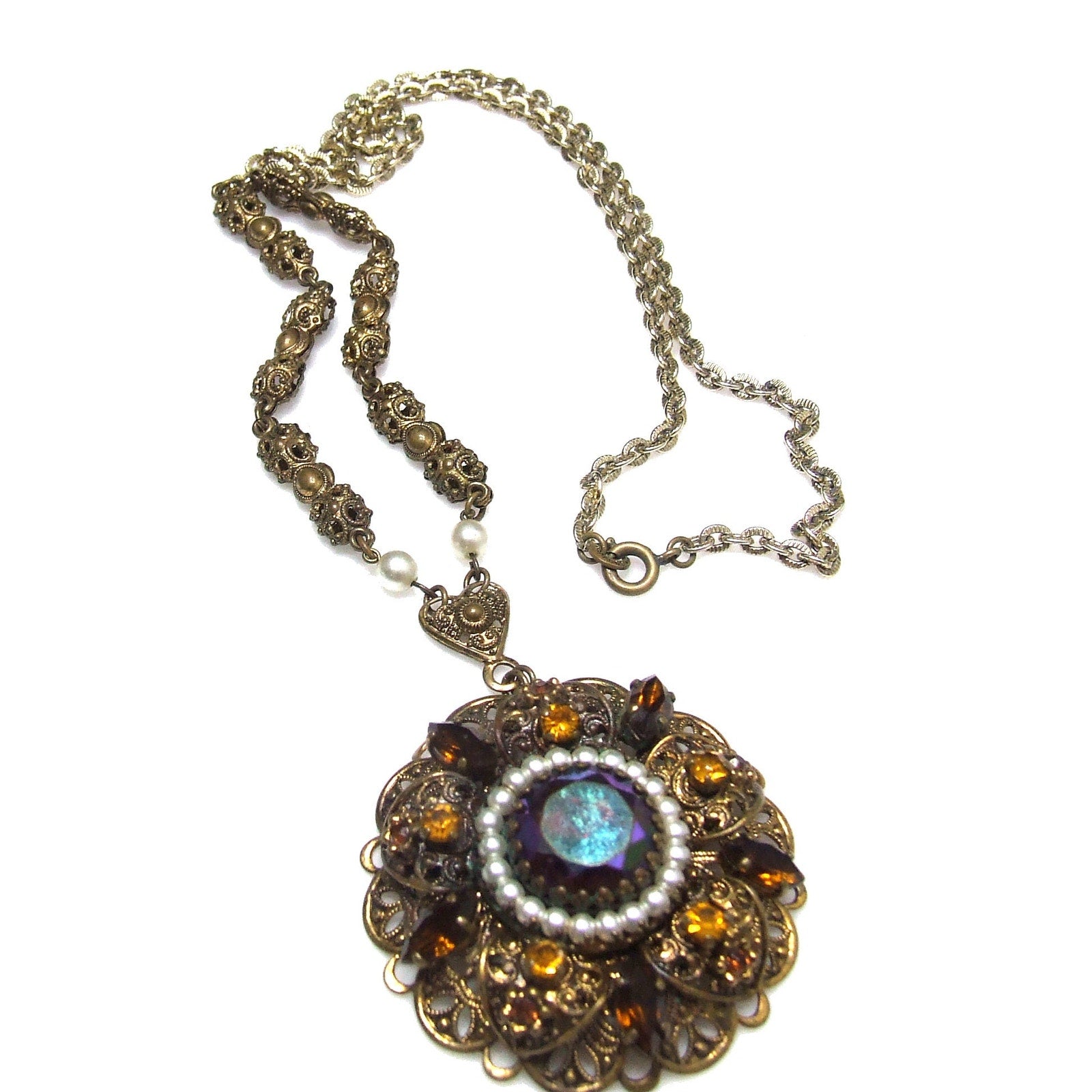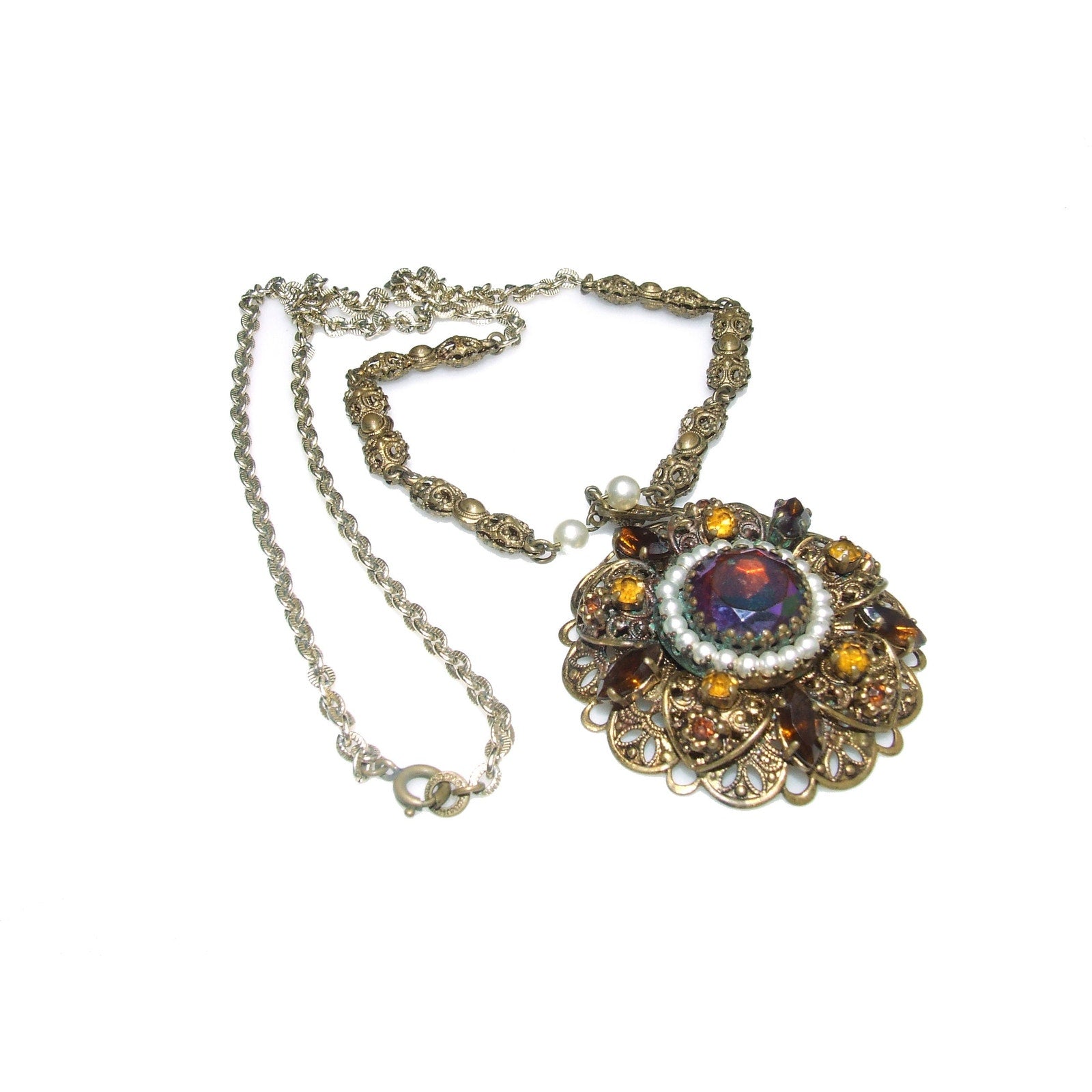 *Description: This is a beautiful West Germany rhinestone filigree necklace from the 1950s. The pendant is in a layered filigree design with a center carnival glass rhinestone, dog-toothed, with a circle of faux pearls. Then there are petals of filigree with light and dark topaz crystal rhinestones on a flat filigree base. The bail is heart shaped and this is where the tubular filigree chain begins with two faux pearls. Near the chain clasp is the ring with Made in Western Germany stamped on one side. The necklace is unique and gorgeous. This would be a great addition to your vintage jewelry collection or make a great vintage gift!