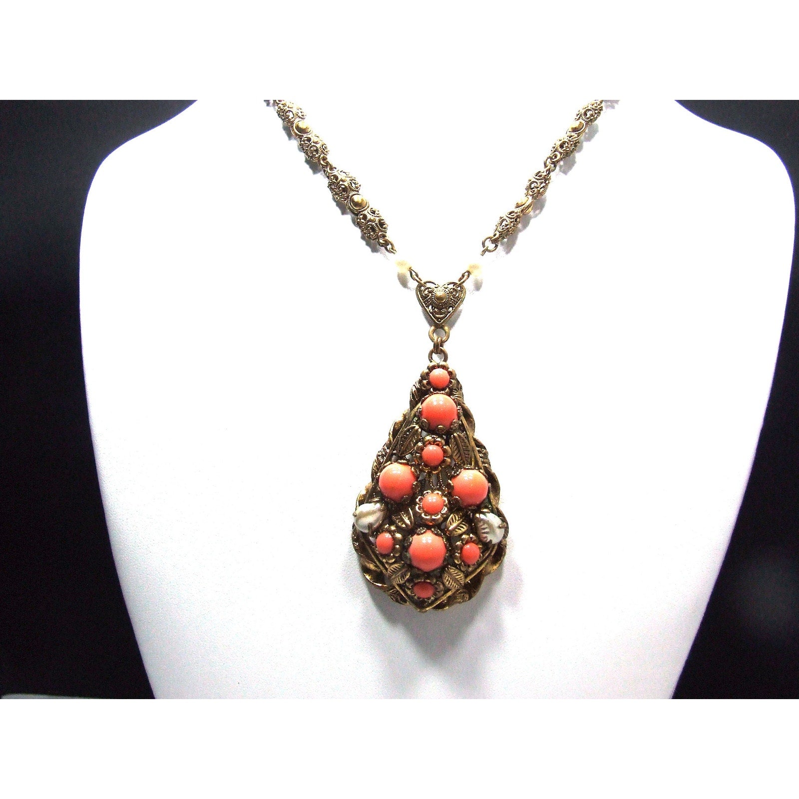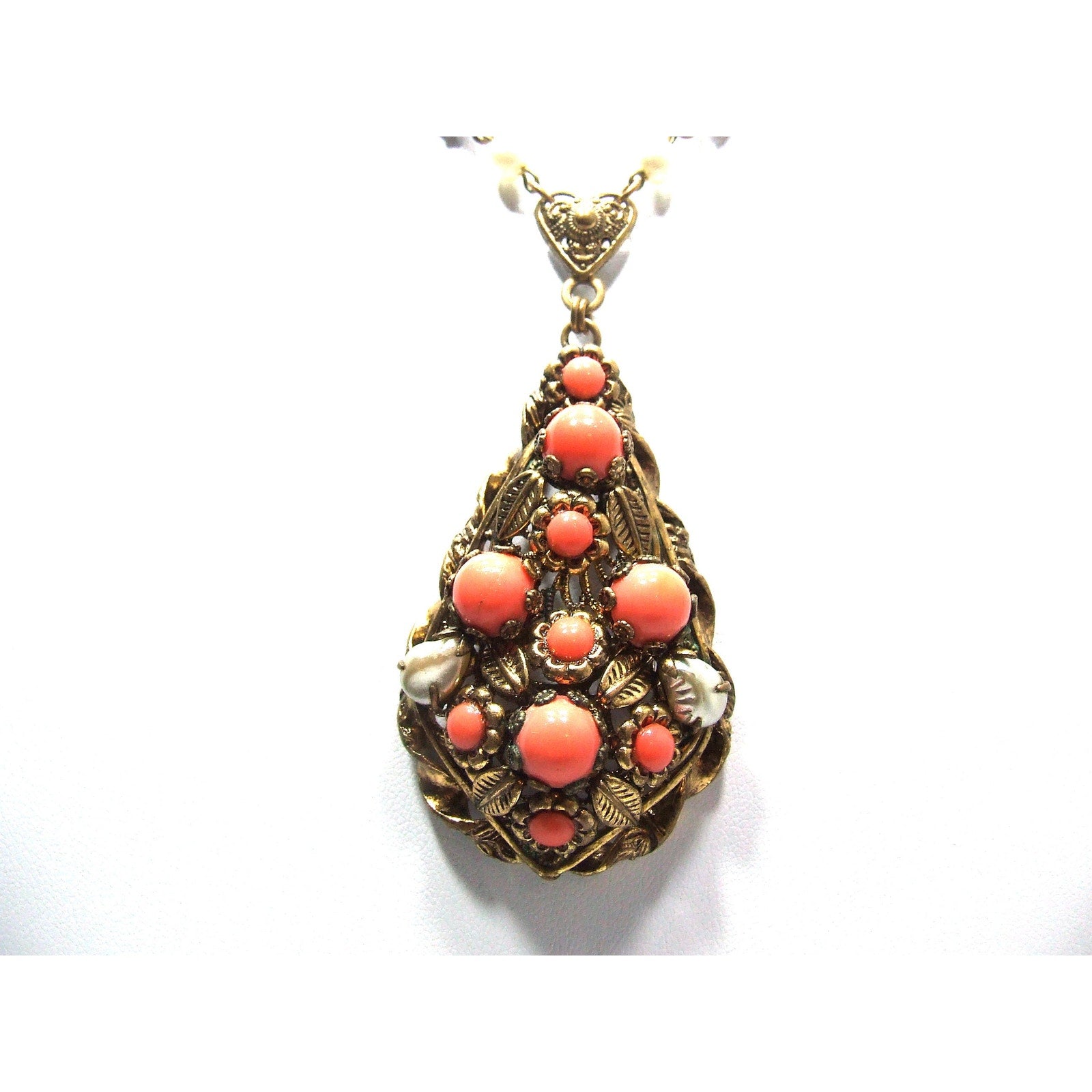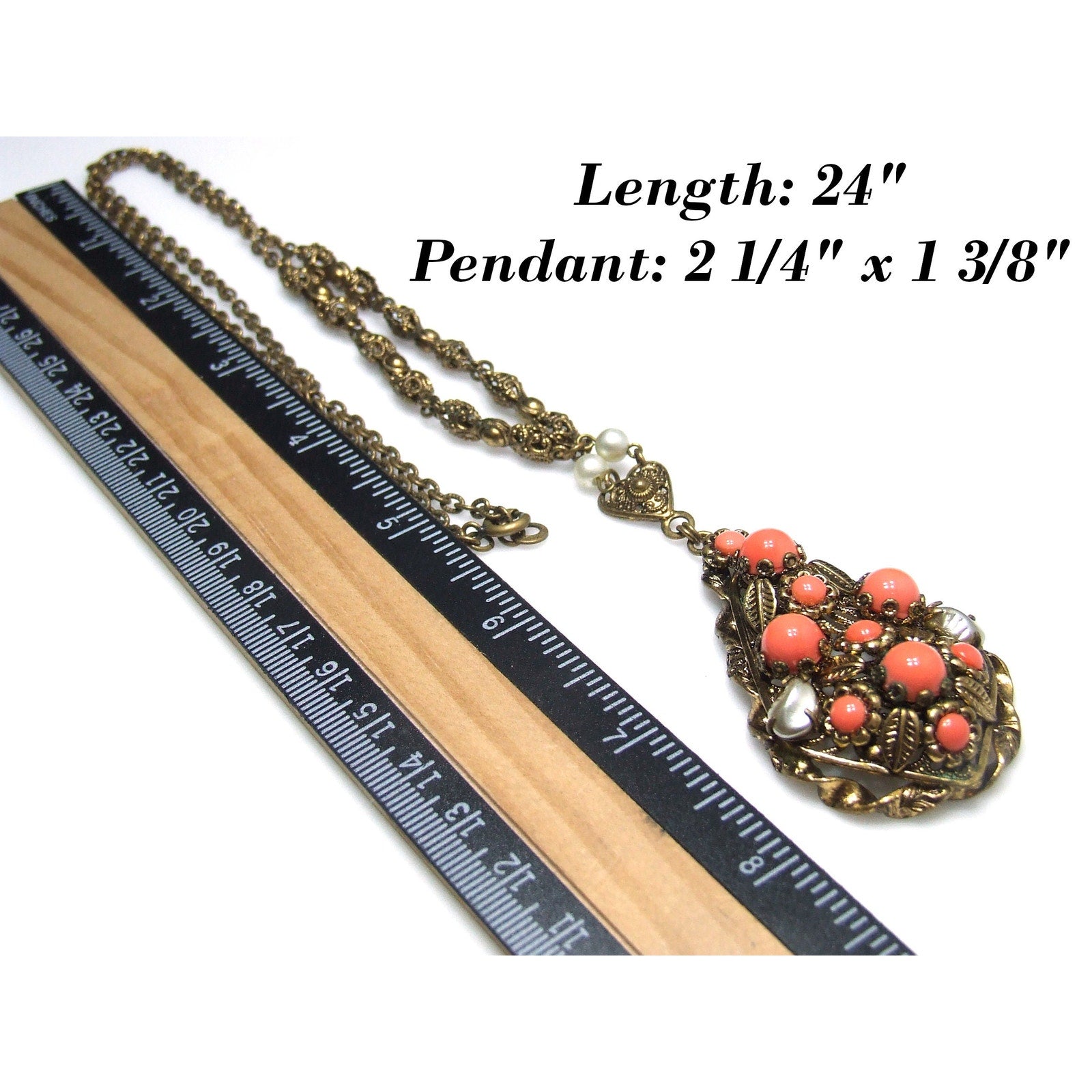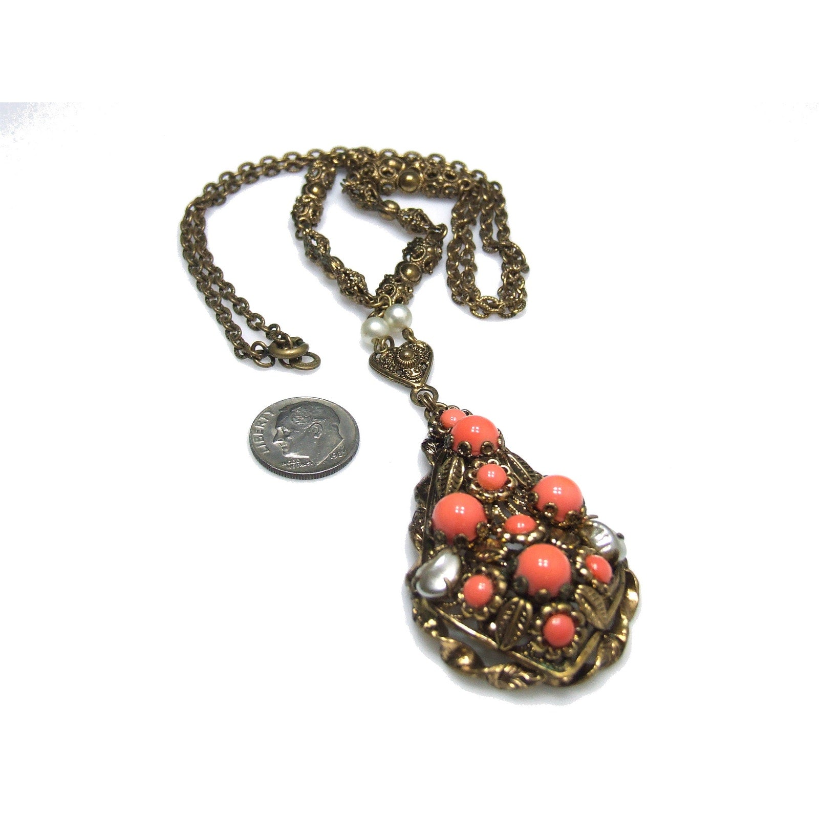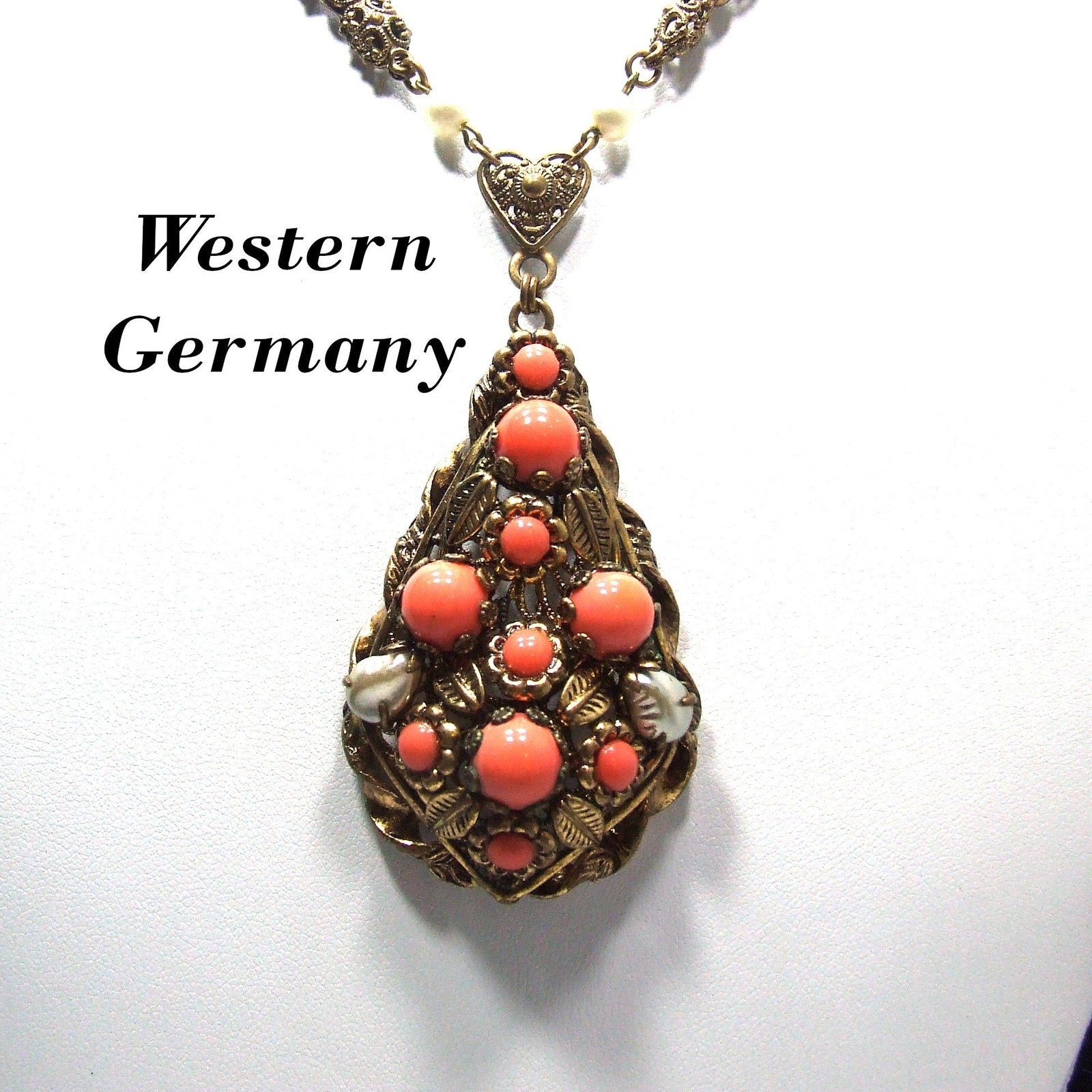 *Description: This is a beautiful Western Germany pendant necklace with filigree layers, orange cabochons, and faux pearls from the 1950s. There are two baby's teeth faux pearls on each side of the pendant. Between the smaller orange cabochons are gold tone leaves. The bail is heart shaped and this is where the tubular filigree chain begins with two faux pearls. Near the chain clasp is the ring with Made in Western Germany stamped on one side. The necklace is unique and gorgeous. This would be a great addition to your vintage jewelry collection or make a great vintage gift!