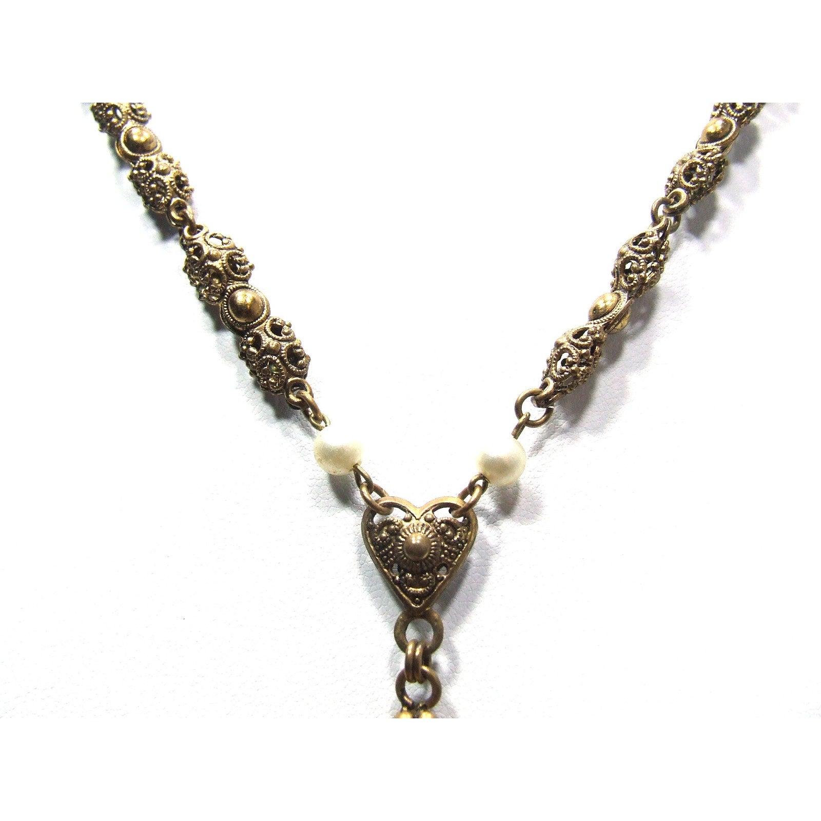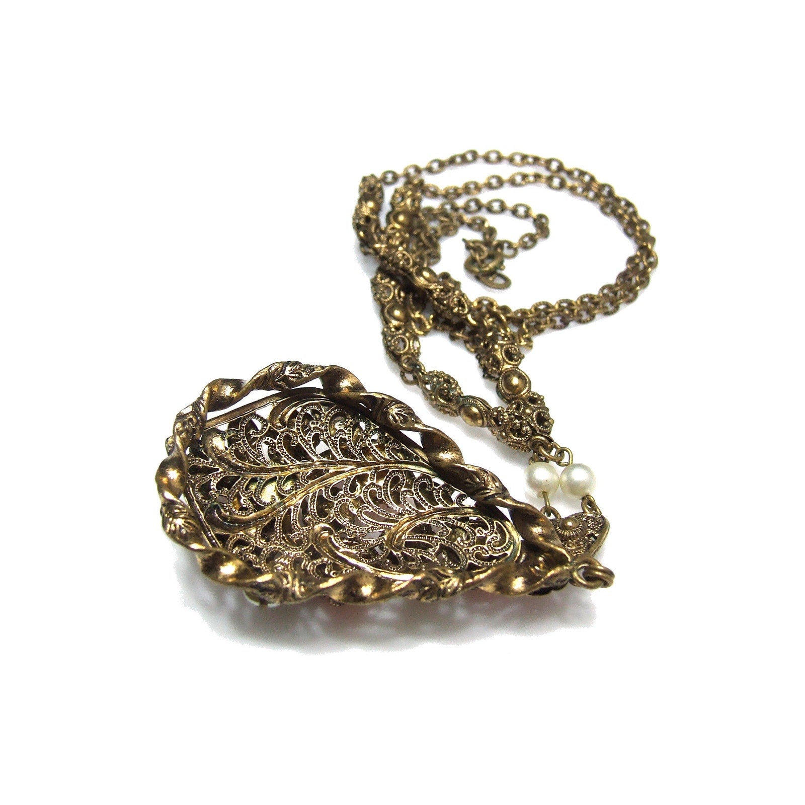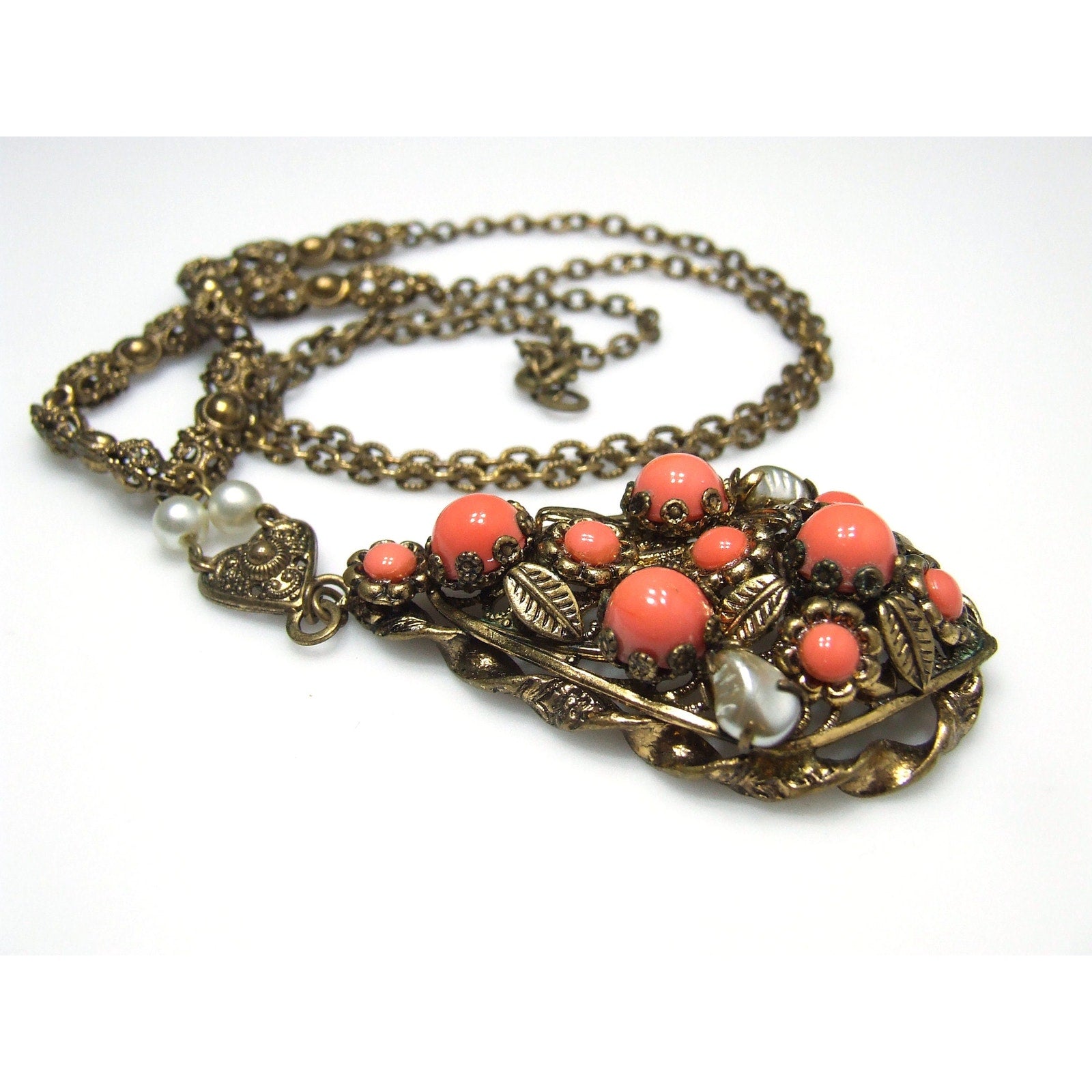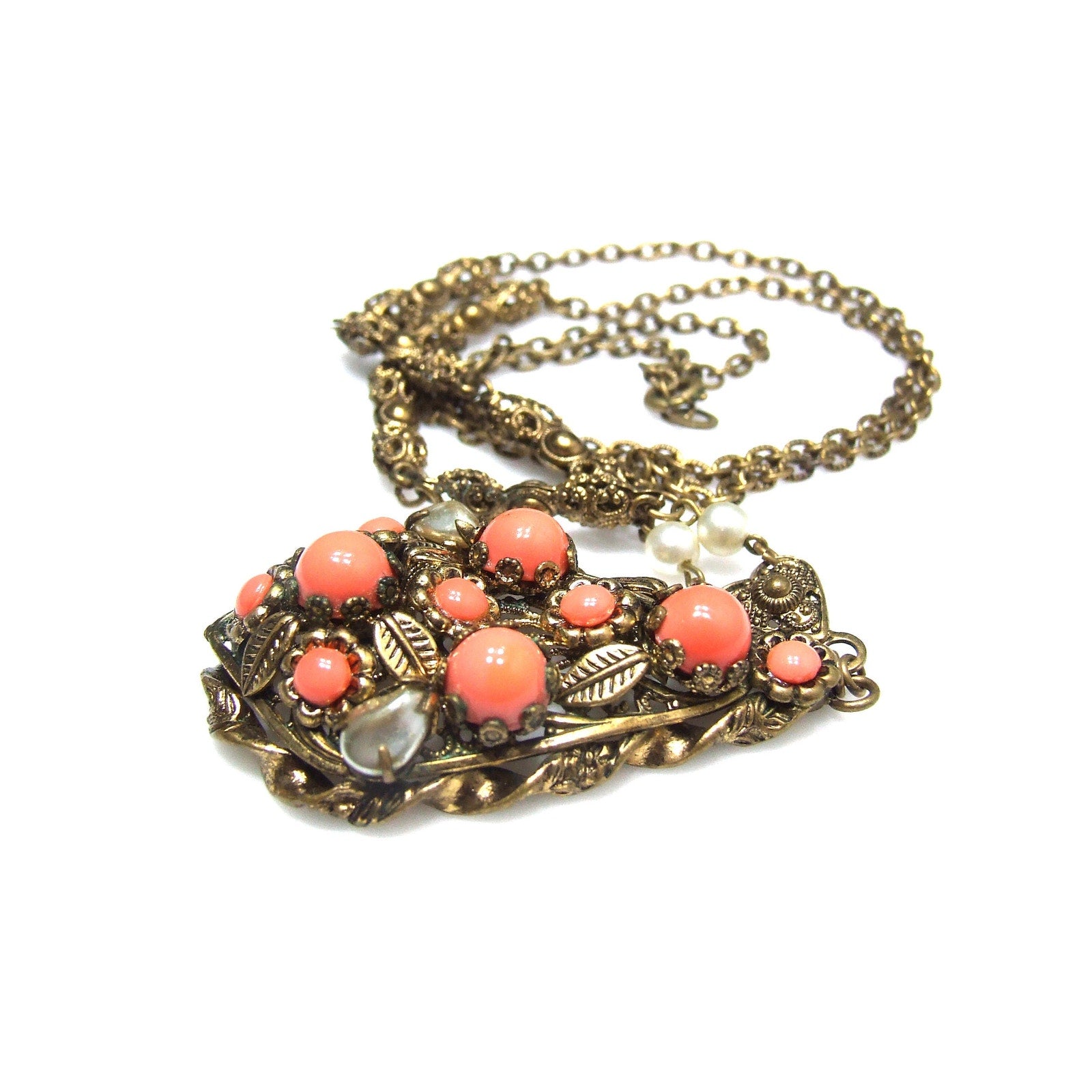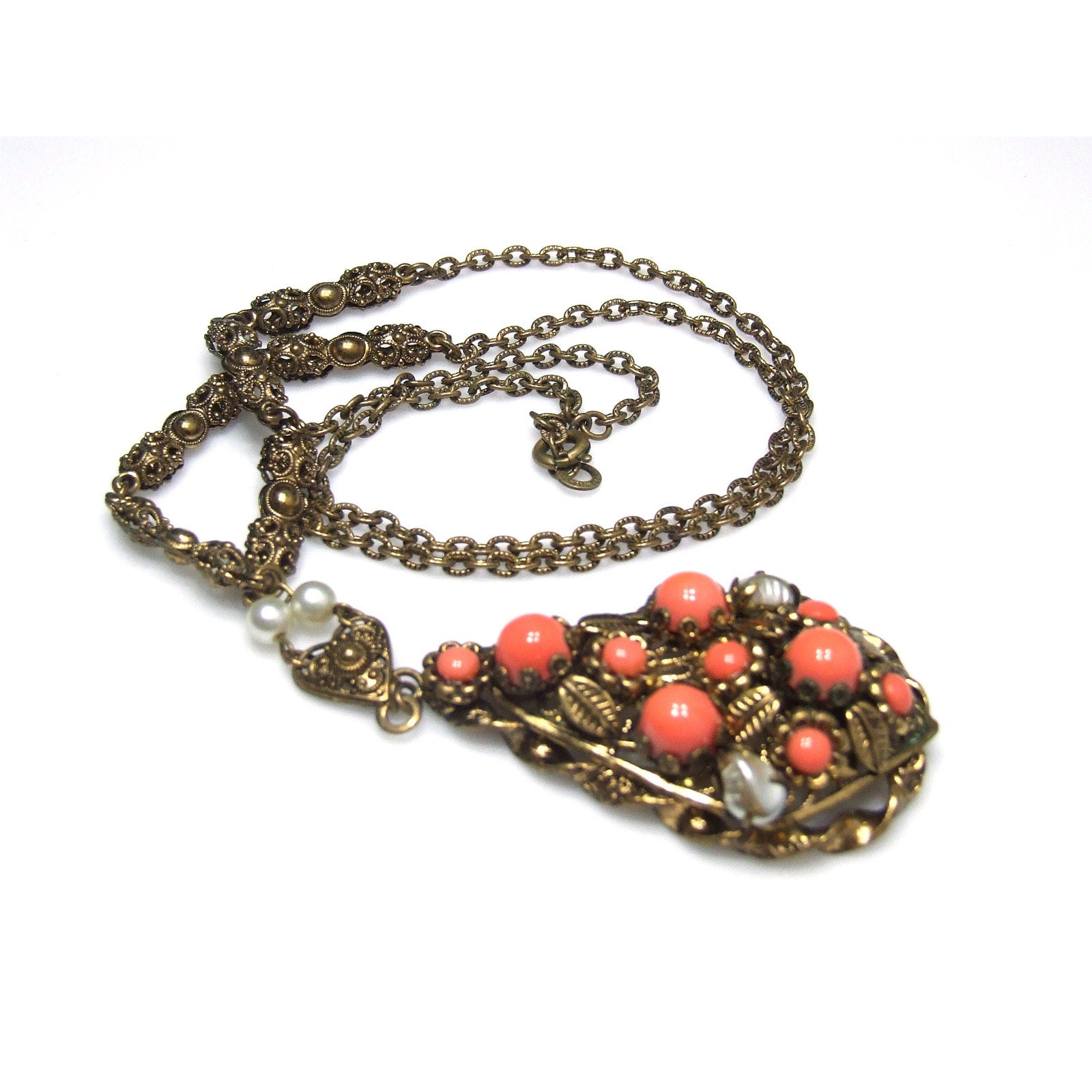 *Description: This is a beautiful Western Germany pendant necklace with filigree layers, orange cabochons, and faux pearls from the 1950s. There are two baby's teeth faux pearls on each side of the pendant. Between the smaller orange cabochons are gold tone leaves. The bail is heart shaped and this is where the tubular filigree chain begins with two faux pearls. Near the chain clasp is the ring with Made in Western Germany stamped on one side. The necklace is unique and gorgeous. This would be a great addition to your vintage jewelry collection or make a great vintage gift!