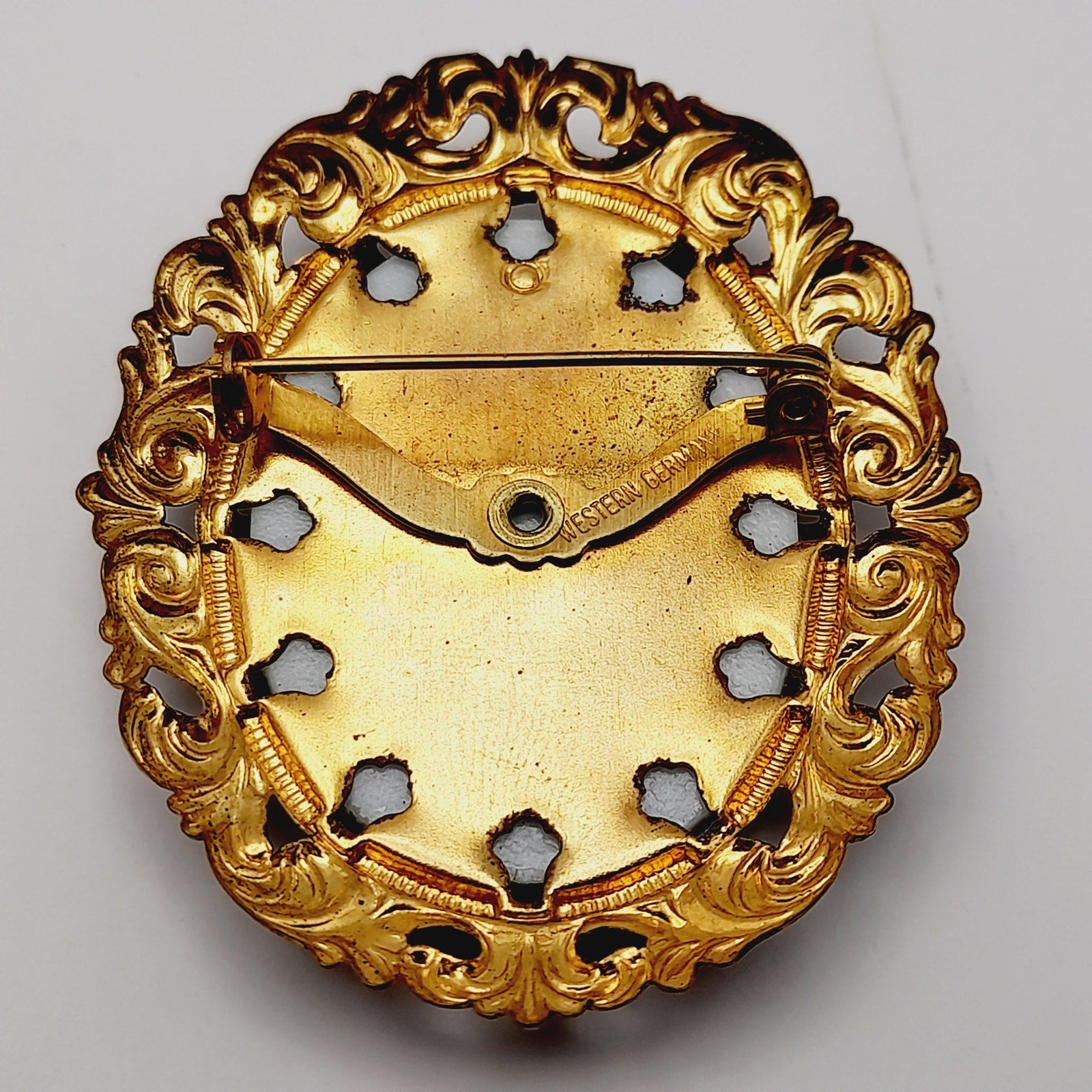 West Germany Vintage Brooch Earrings Twin Pins Set, Portrait Transfer Glass Gold Tone