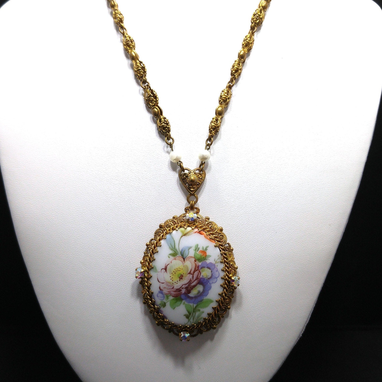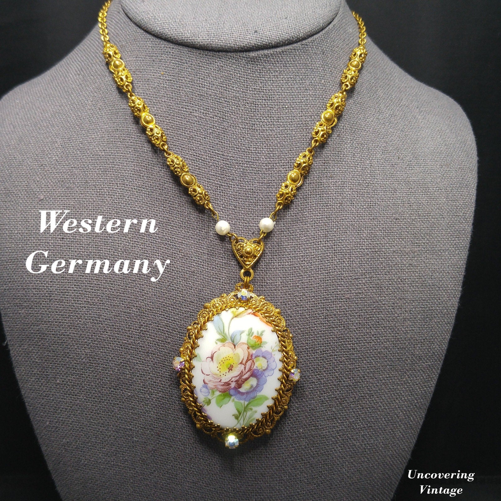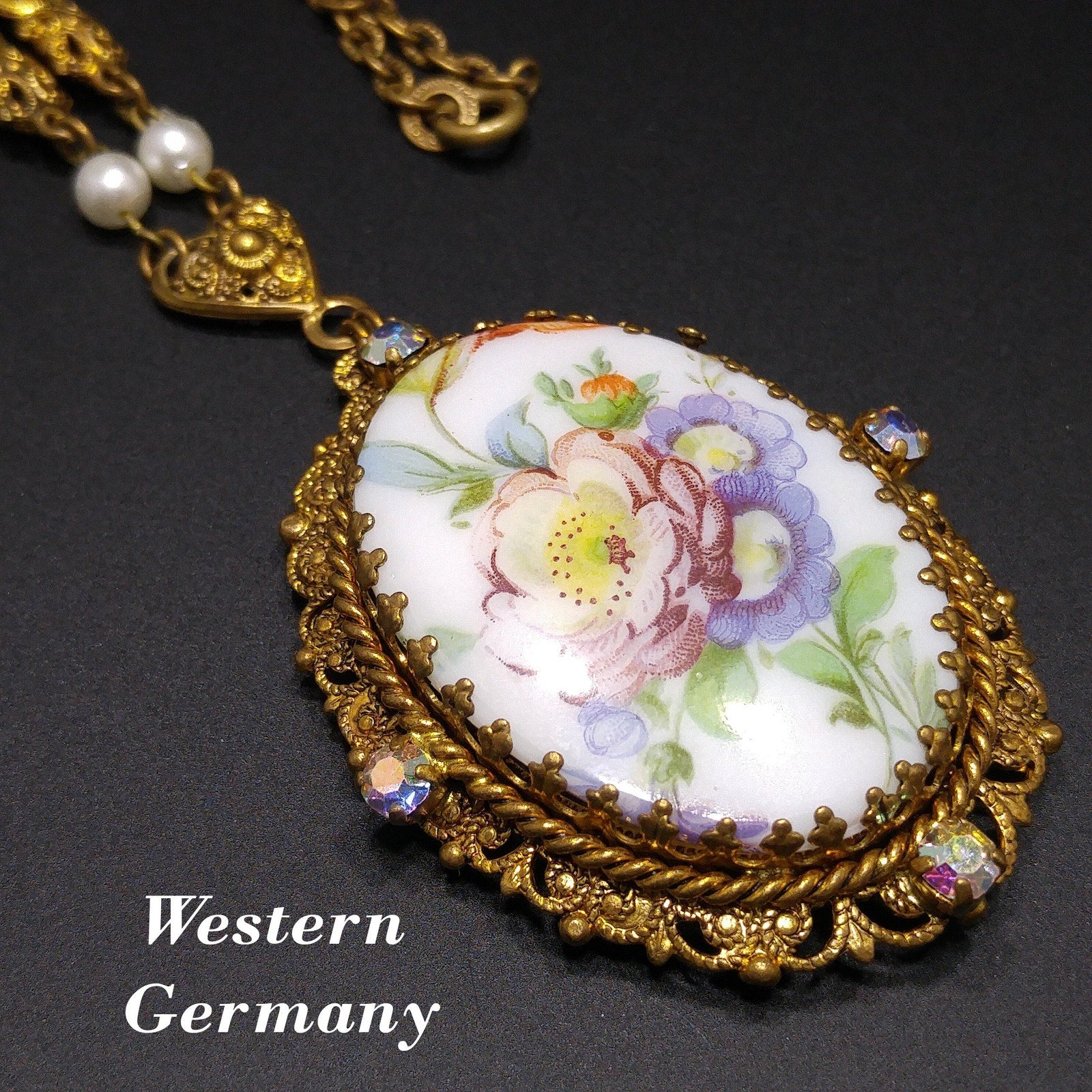 *Description: This is a beautiful Western Germany pendant necklace from the 1950s with a ceramic oval floral design of a purple pink flower with green leaves and orange buds. The lovely floral design is surrounded by four aurora borealis rhinestones on a filigree frame. The pendant is attached to a three dimensional filigree floral chain with faux pearl accents which is attached to a heart bail. The chain has a ring near the clasp that is marked Western Germany. This would be a great addition to your vintage jewelry collection or make a great vintage gift!