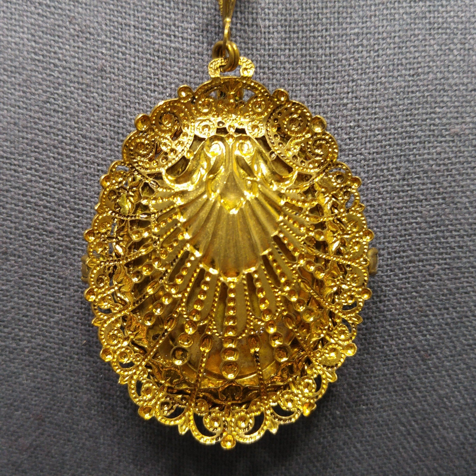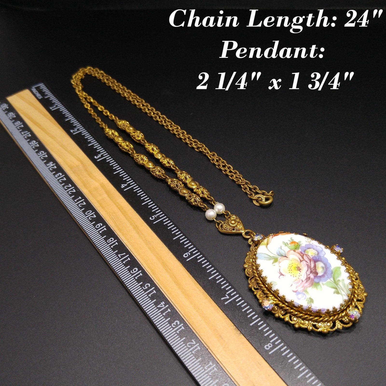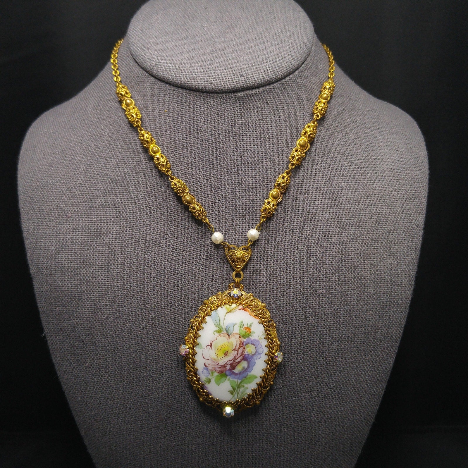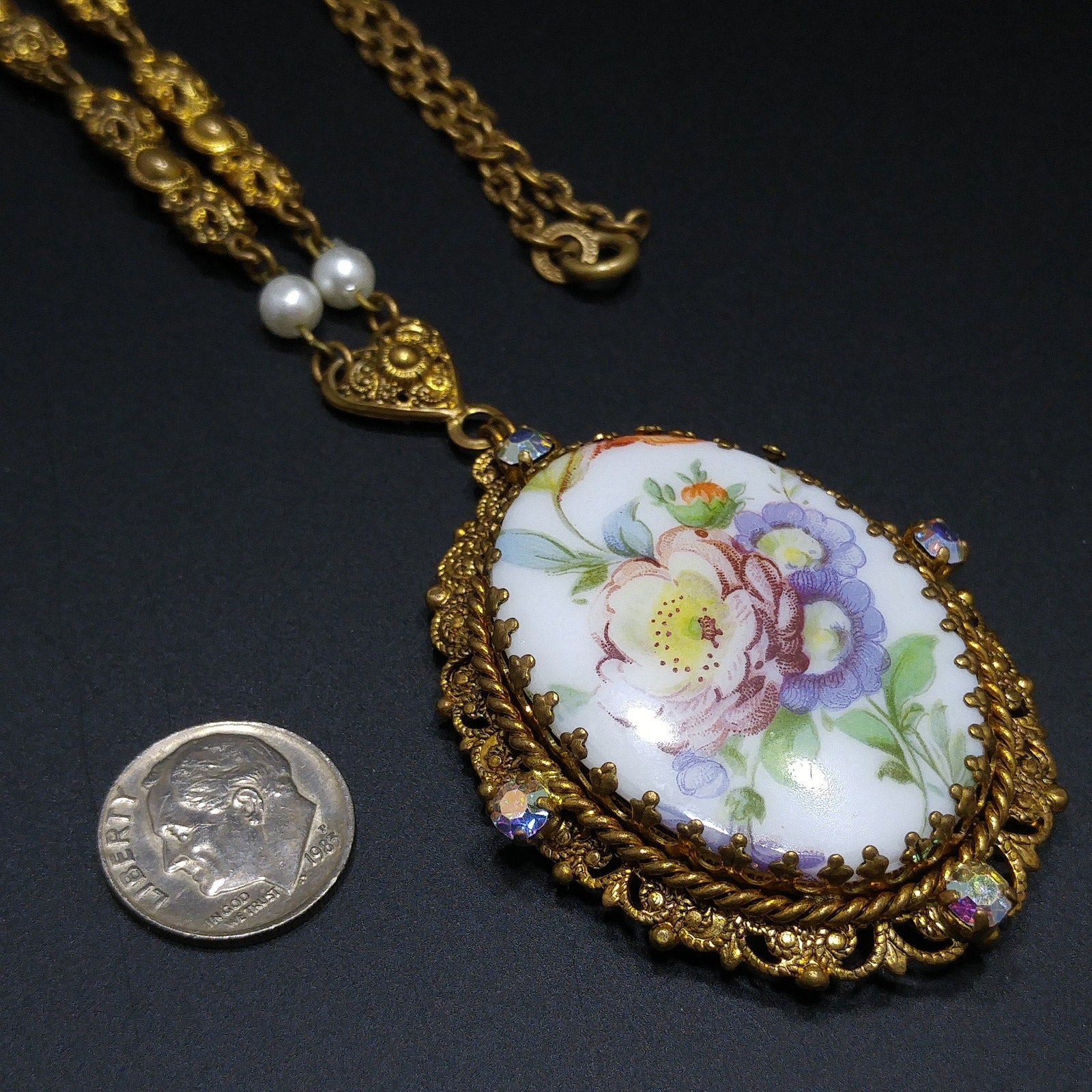 *Description: This is a beautiful Western Germany pendant necklace from the 1950s with a ceramic oval floral design of a purple pink flower with green leaves and orange buds. The lovely floral design is surrounded by four aurora borealis rhinestones on a filigree frame. The pendant is attached to a three dimensional filigree floral chain with faux pearl accents which is attached to a heart bail. The chain has a ring near the clasp that is marked Western Germany. This would be a great addition to your vintage jewelry collection or make a great vintage gift!