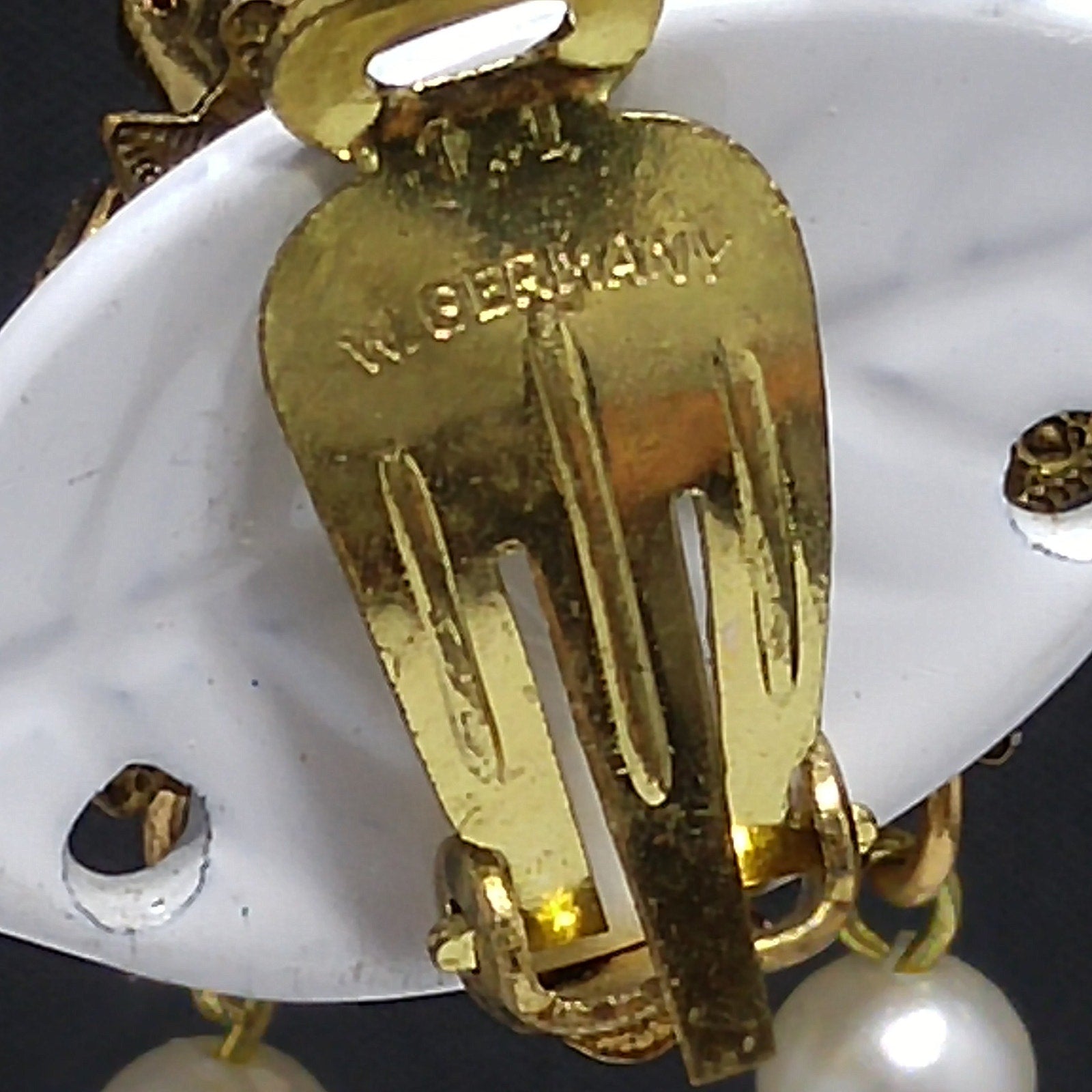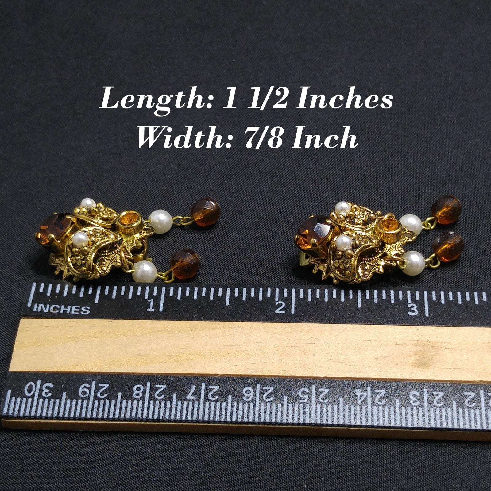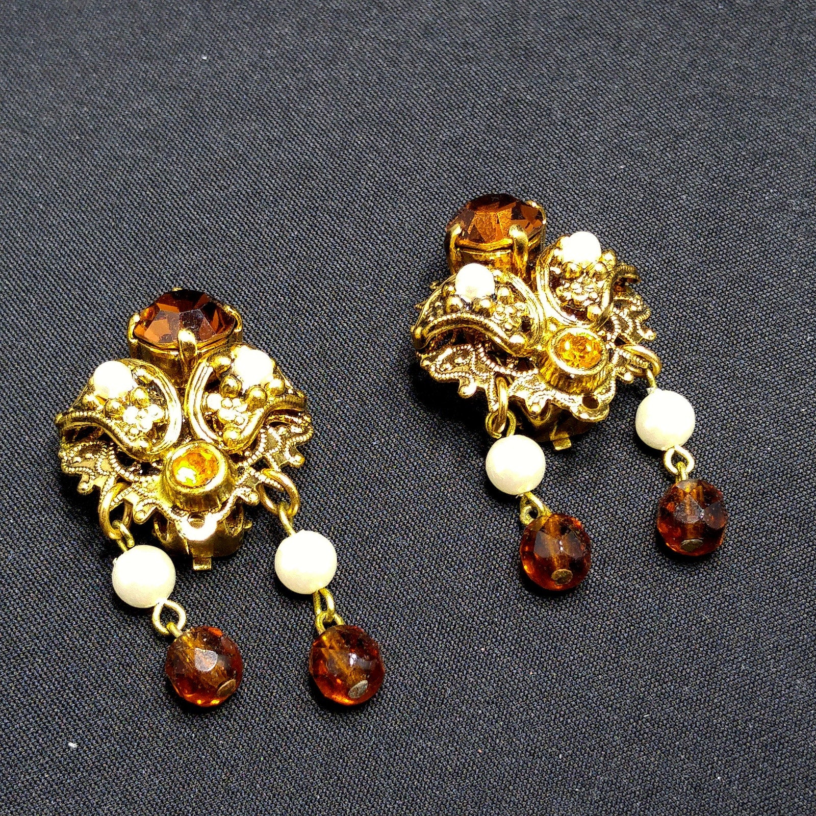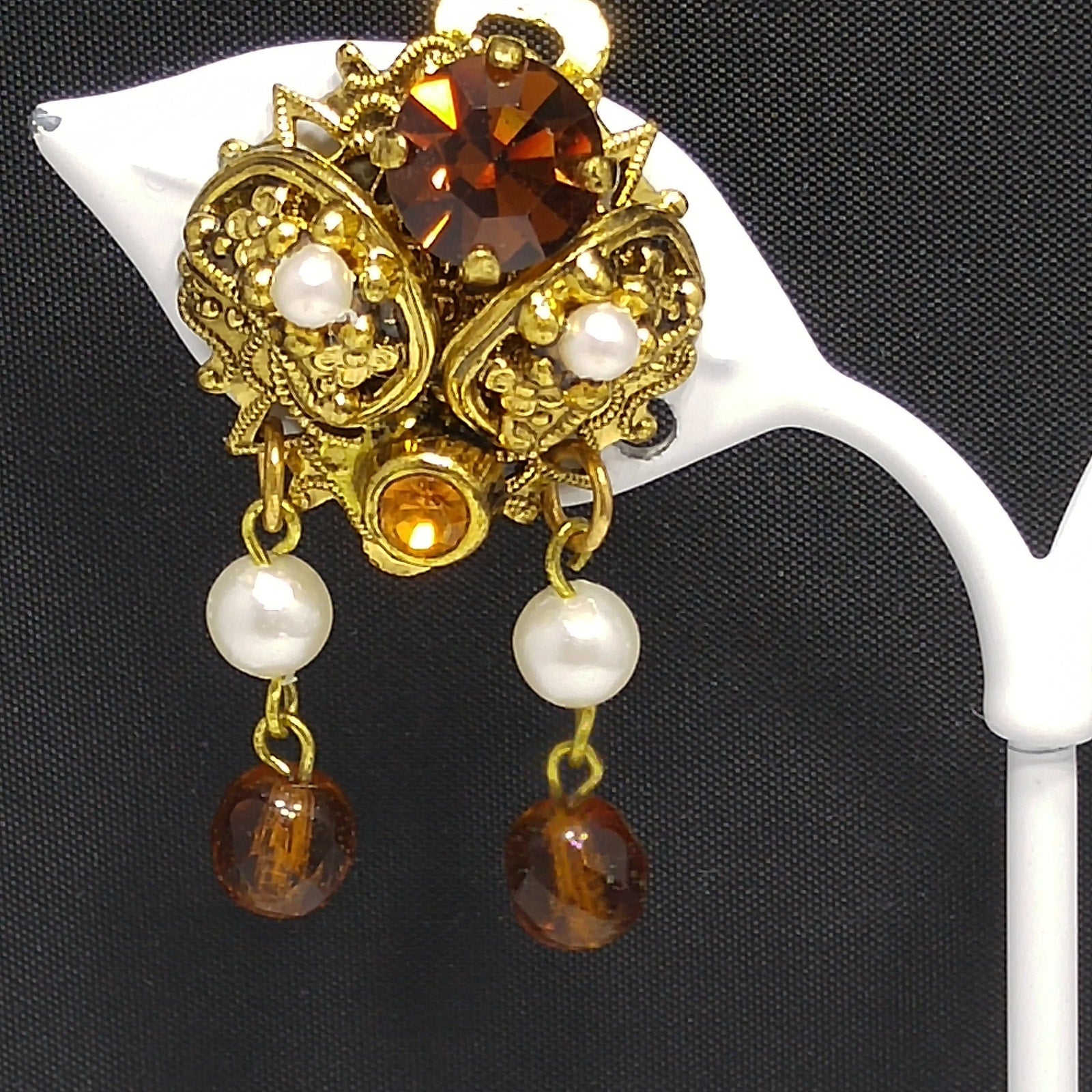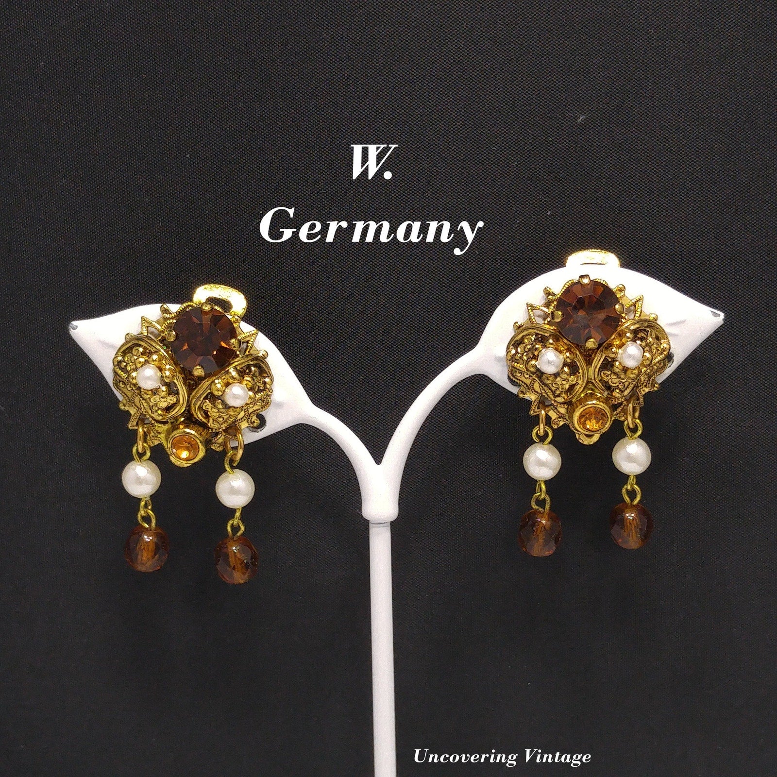 *Description: This is a beautiful pair of Western Germany filigree clip on earrings with light and darker topaz rhinestones, prong set, on the filigree background from the early 1950s. The earrings clips are marked W. GERMANY on the back of the clip. The rhinestones are beautiful and are accented with faux pearls. Each earring has two dangles of a faux pearl and topaz bead. This would be a great addition to your vintage jewelry collection or make a great vintage gift!