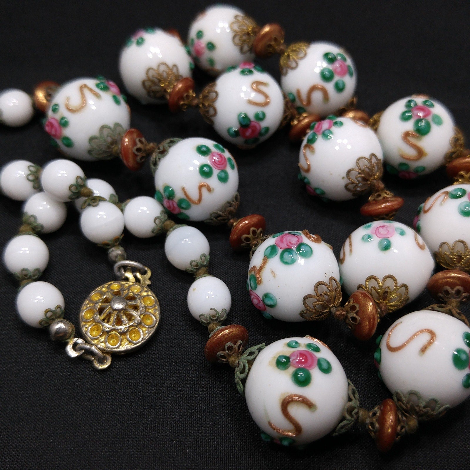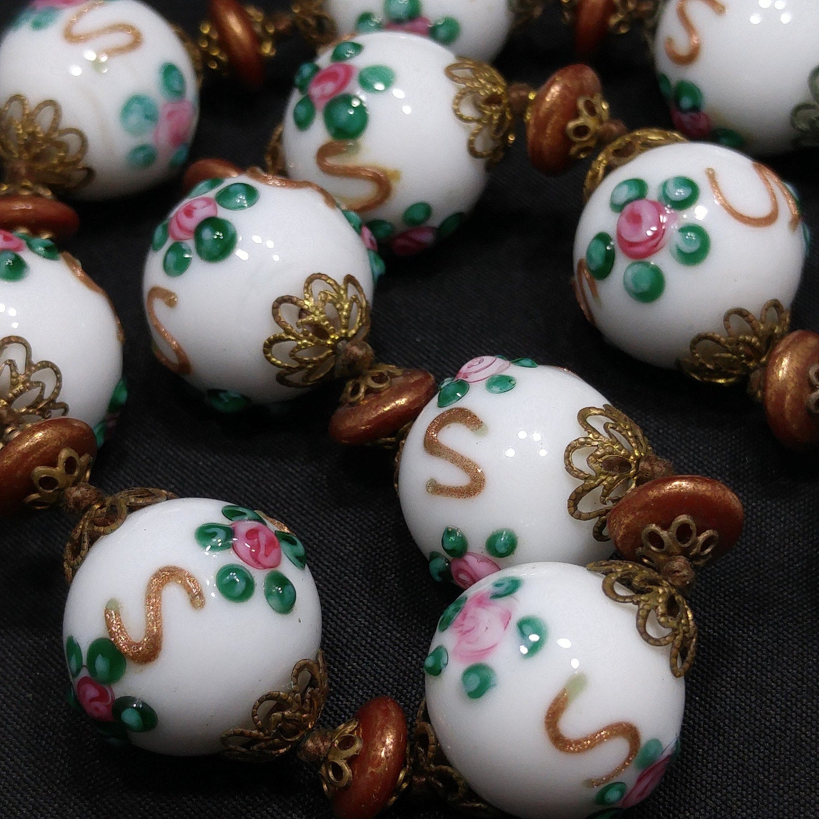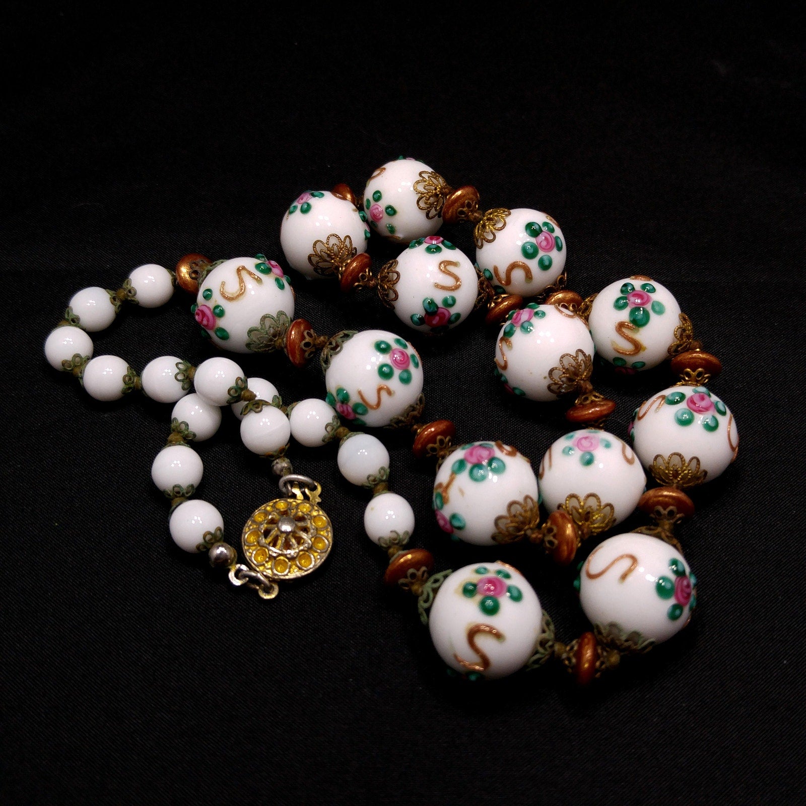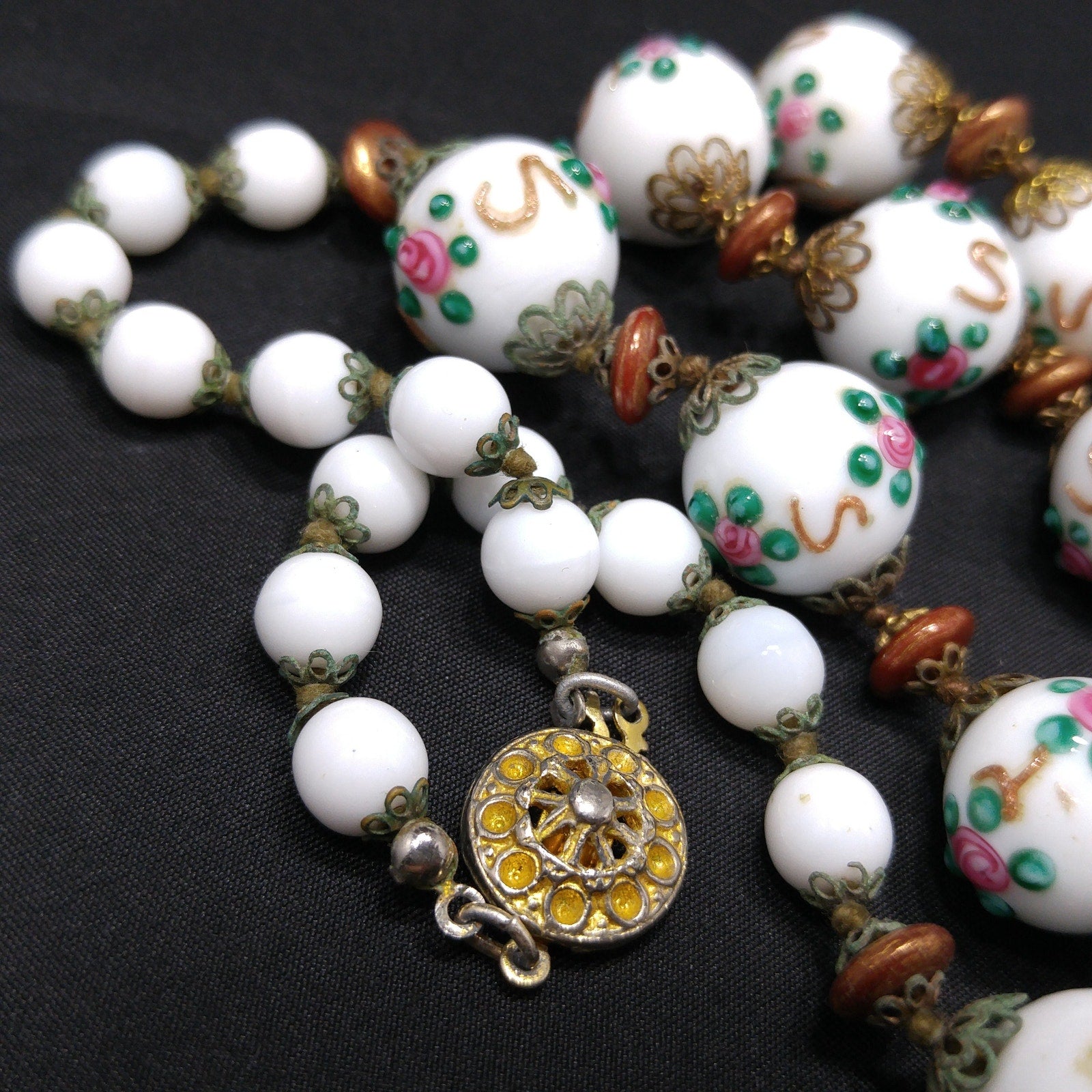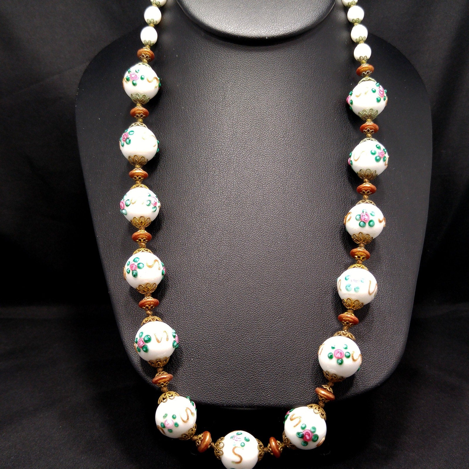 *Description: This is a beautiful vintage white milk glass lampwork beaded necklace from the 1960s. This floral beaded necklace has 13 of the larger floral lampwork beads which are 16mm and are seperated by bronze tone space flat beads. On each end of the necklace are 14 milk glass 8mm beads. Each bead has a brass filigree end cap and are hand knotted. The unique design of lampwork beads are artisans who place the design with hot glass rather than hand painted or stamped designs. These mid-century glass lampwork beads are beautiful and would make a great heirloom piece of jewelry. This would be a great addition to your vintage jewelry collection or make a great vintage gift!