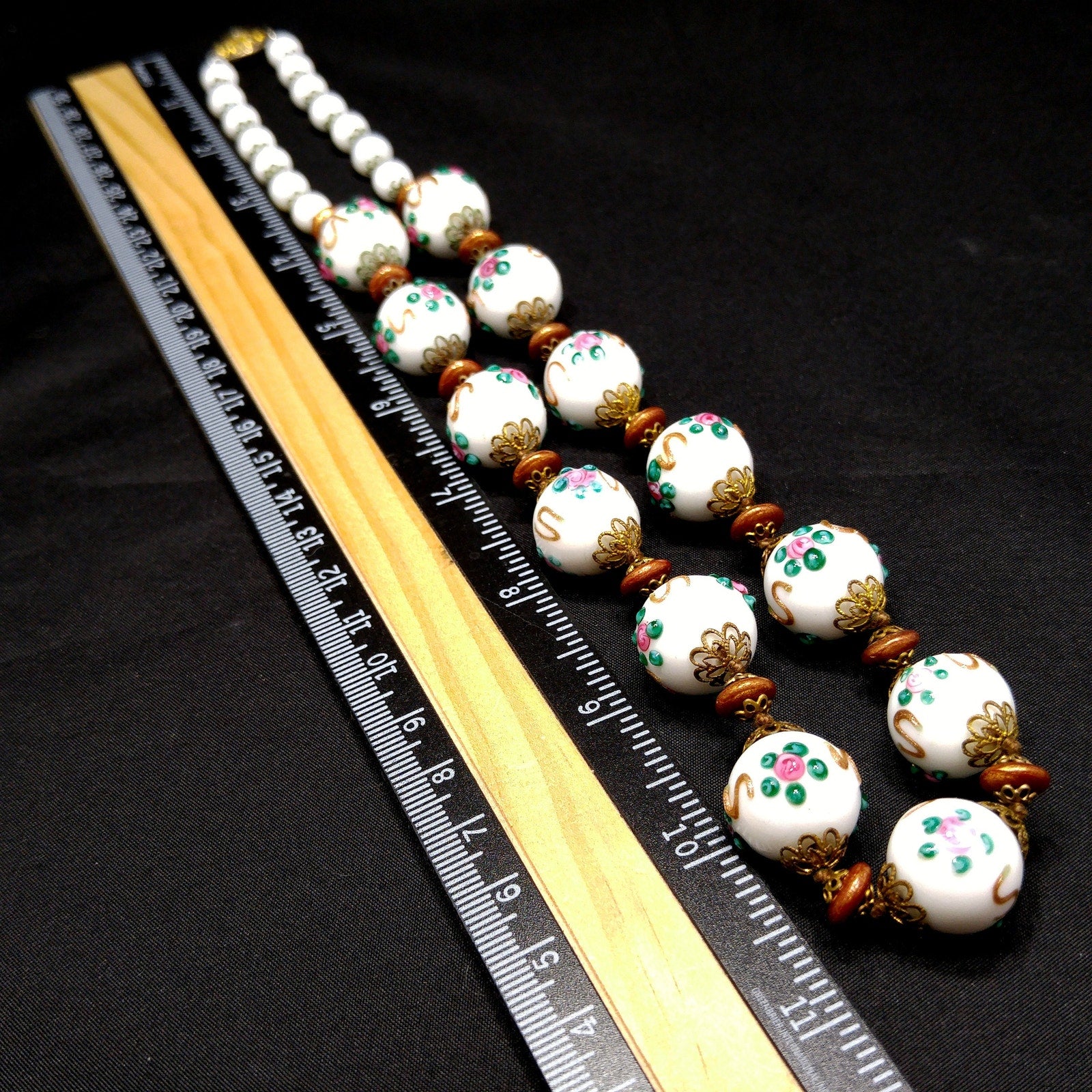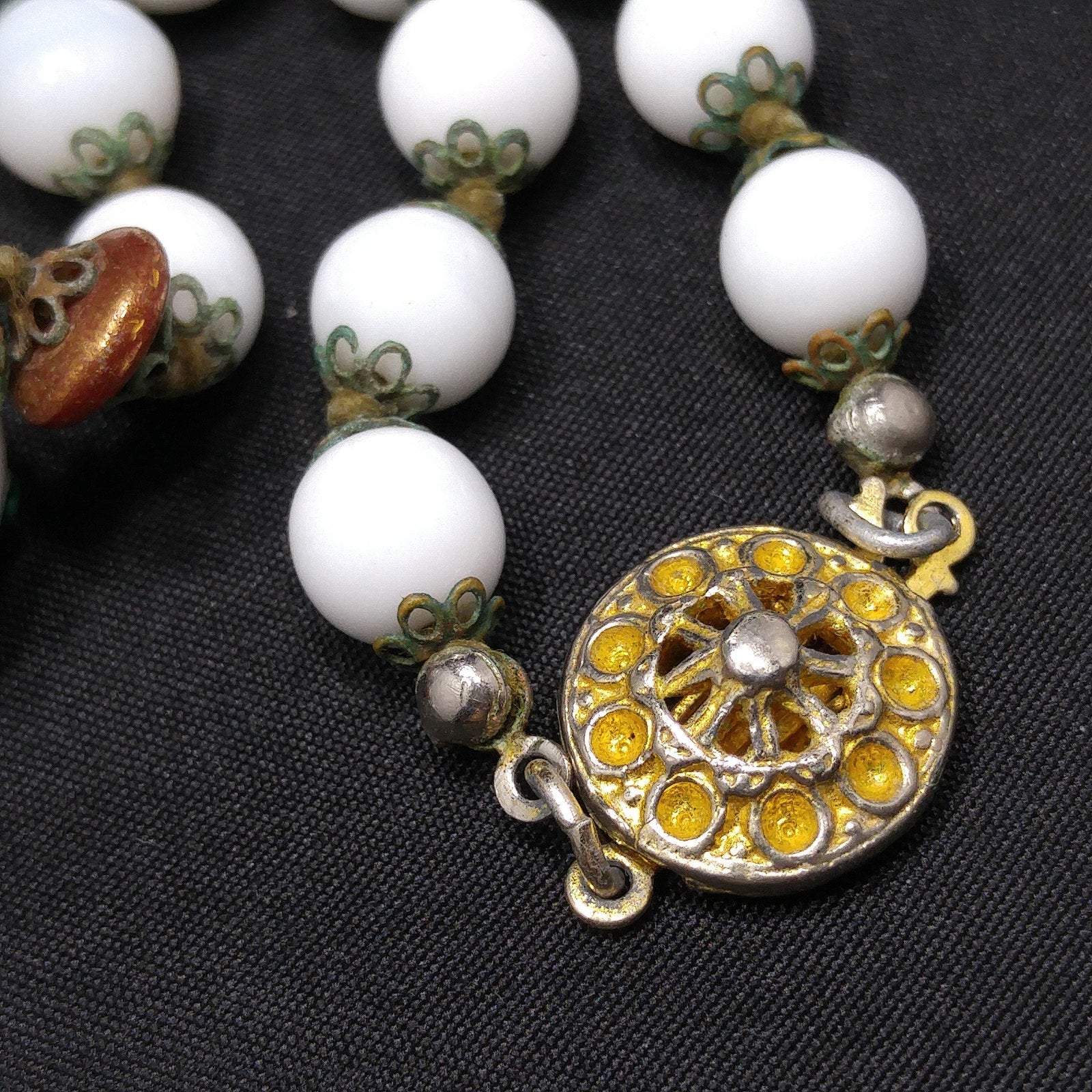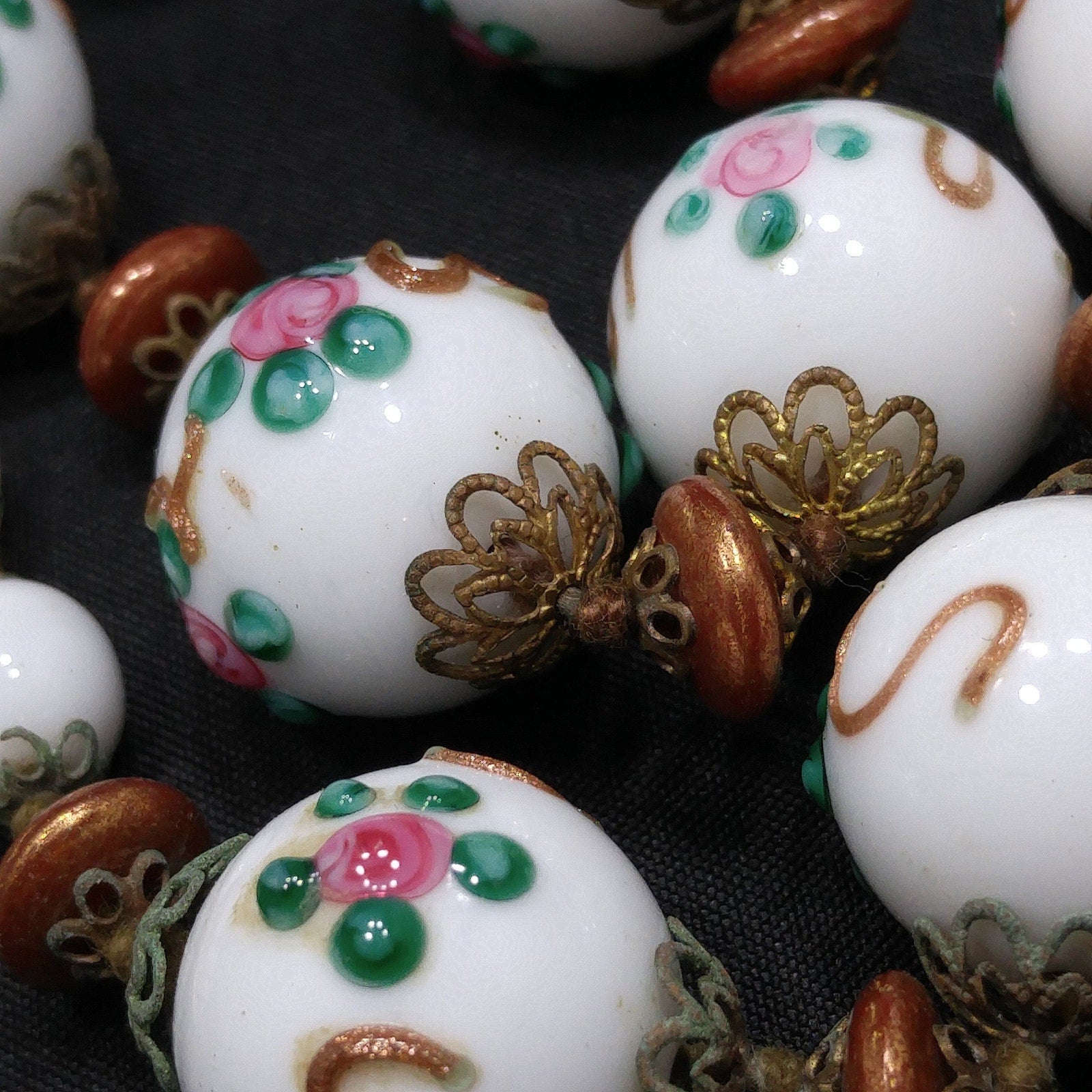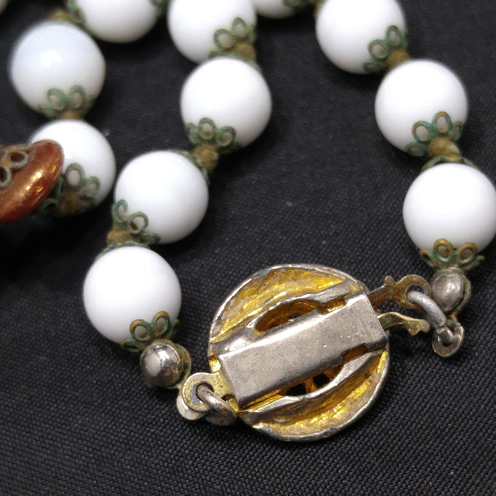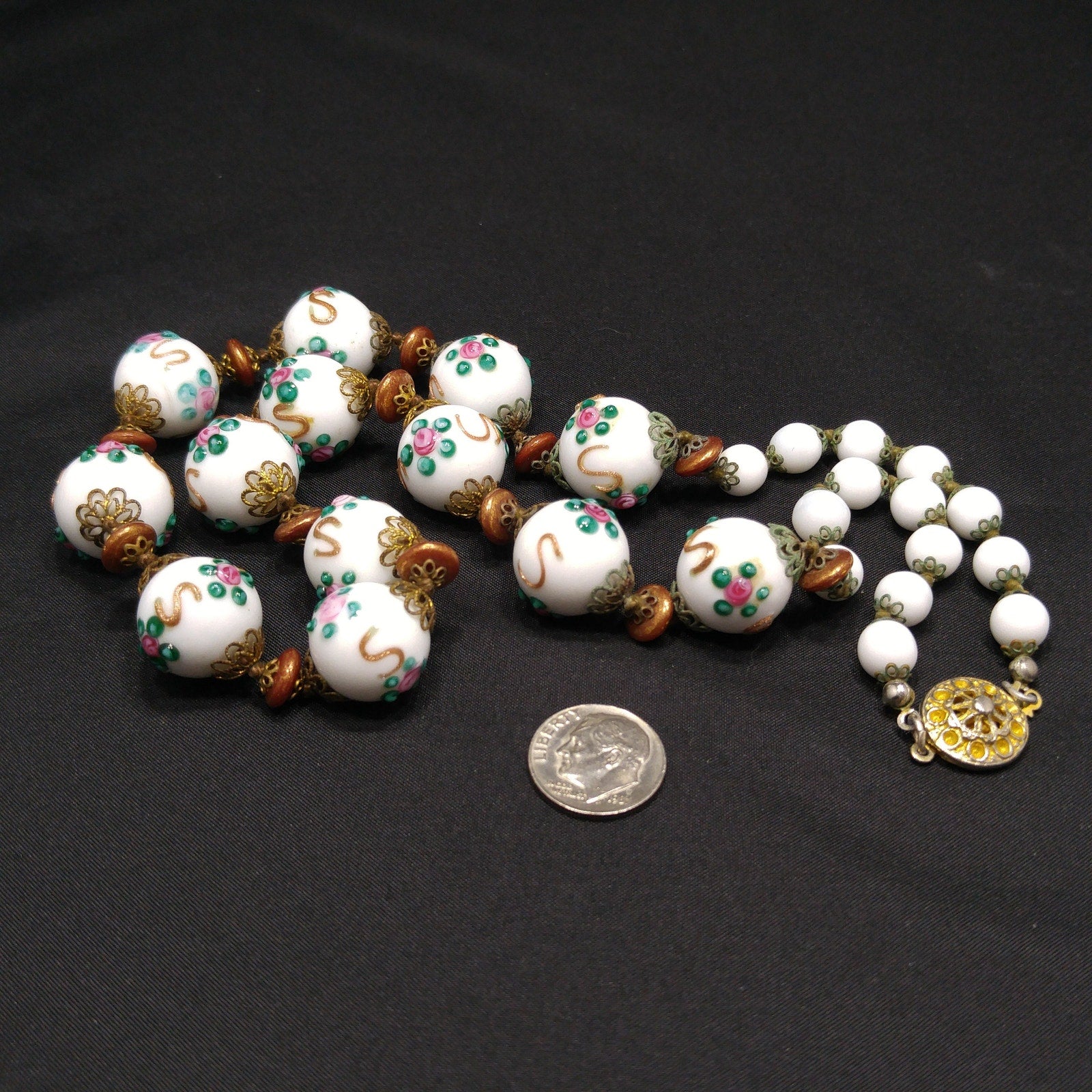 *Description: This is a beautiful vintage white milk glass lampwork beaded necklace from the 1960s. This floral beaded necklace has 13 of the larger floral lampwork beads which are 16mm and are seperated by bronze tone space flat beads. On each end of the necklace are 14 milk glass 8mm beads. Each bead has a brass filigree end cap and are hand knotted. The unique design of lampwork beads are artisans who place the design with hot glass rather than hand painted or stamped designs. These mid-century glass lampwork beads are beautiful and would make a great heirloom piece of jewelry. This would be a great addition to your vintage jewelry collection or make a great vintage gift!