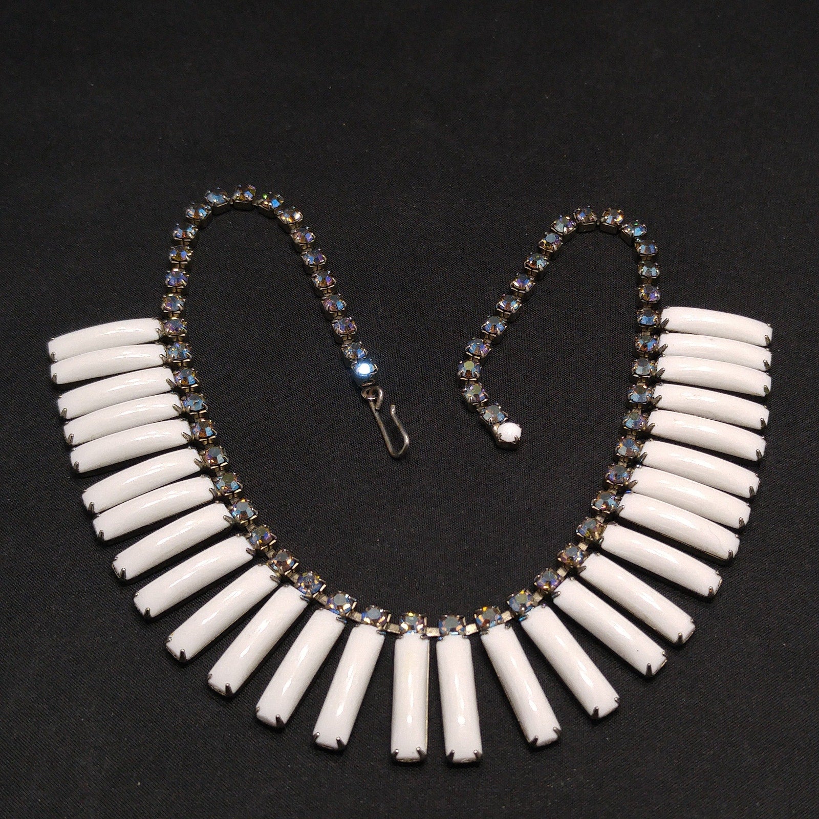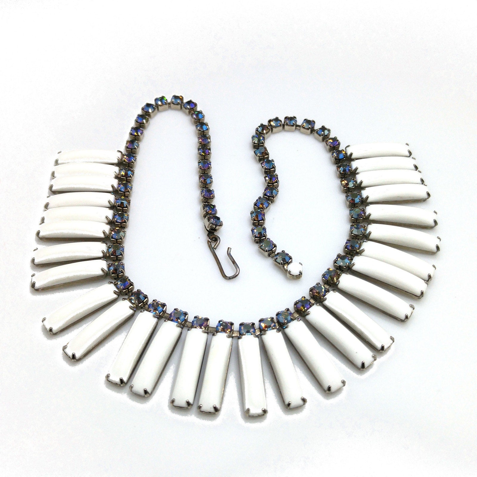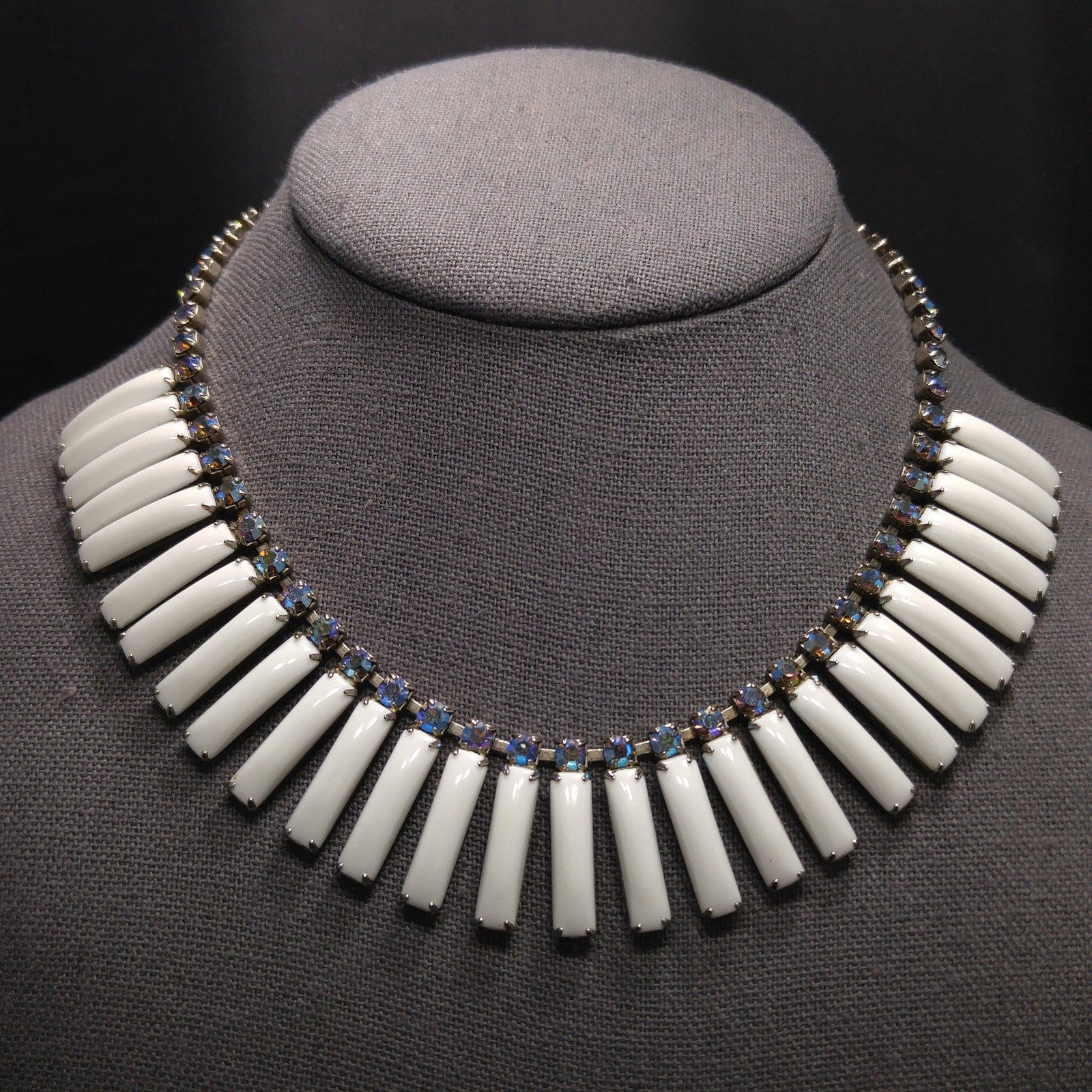 *Description: This is a beautiful Egyptian Revival style choker necklace with long Lucite white cabochons and blue aurora borealis rhinestones, prong set, in silver tone from the 1960s. The rhinestones are sparkling and all in place. It is in excellent condition with no missing stones or discoloration. The style is very unique with a white Lucite stone at the end of the necklace extension. This is an unsigned piece; beautifully designed. This would be a great addition to your vintage jewelry collection or make a great vintage gift!