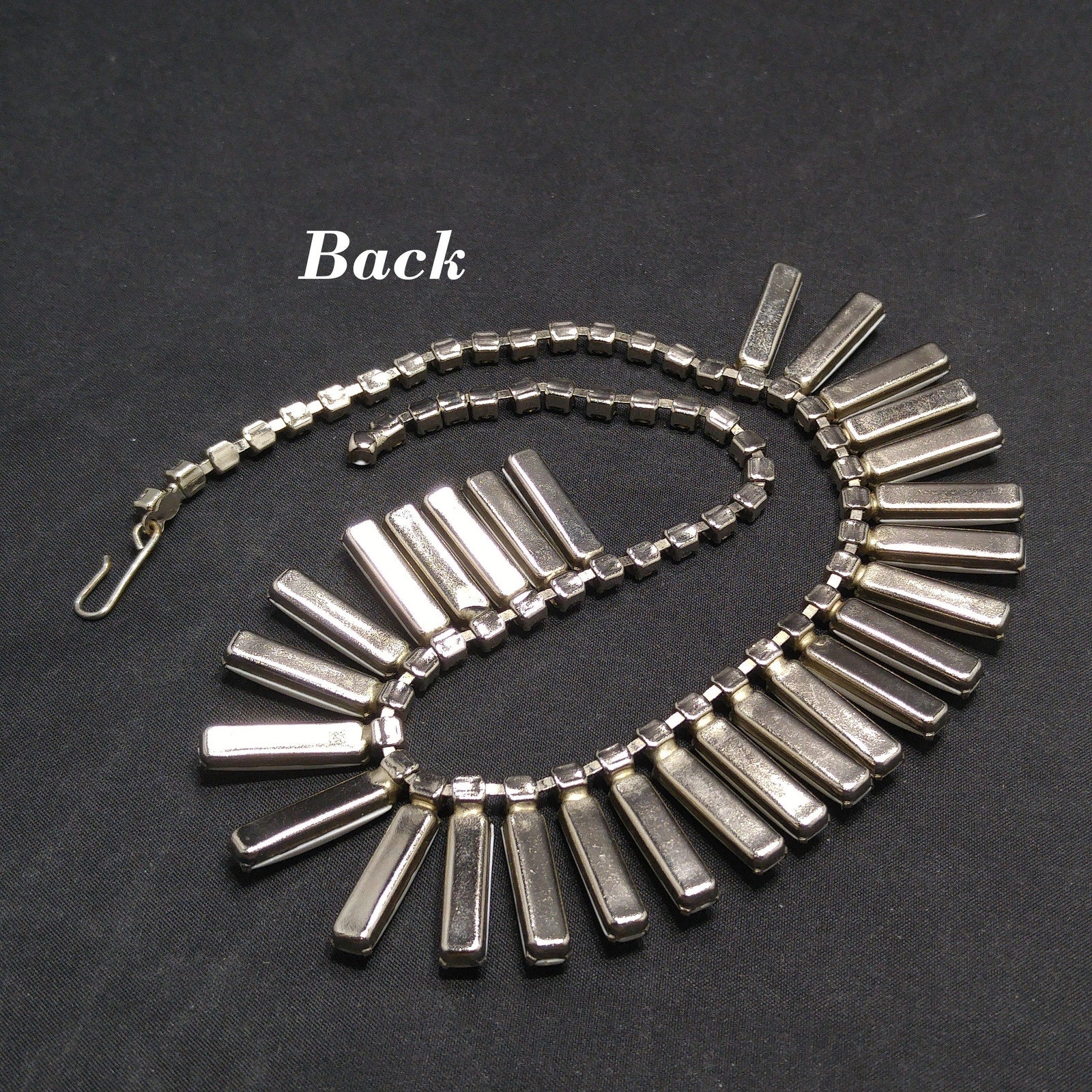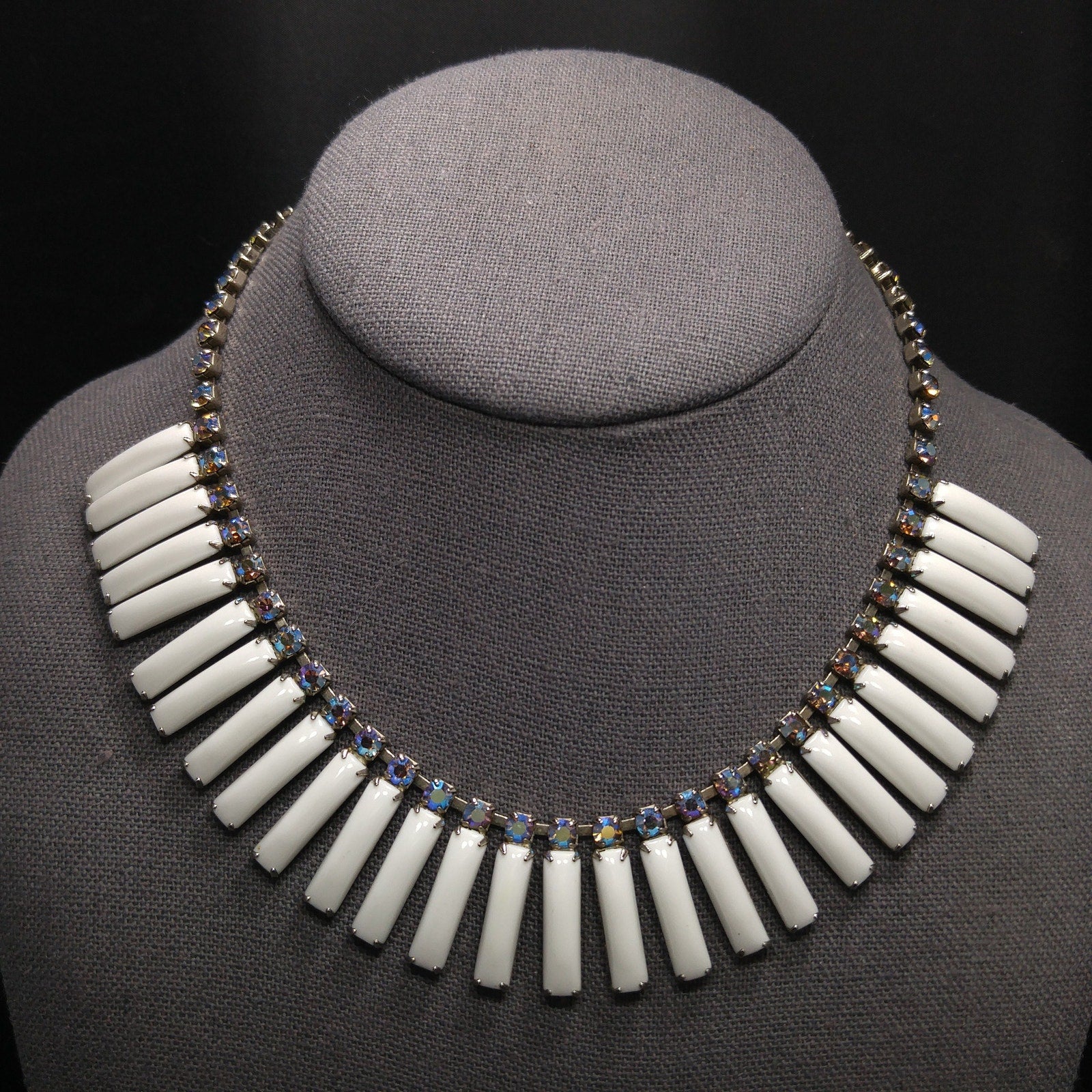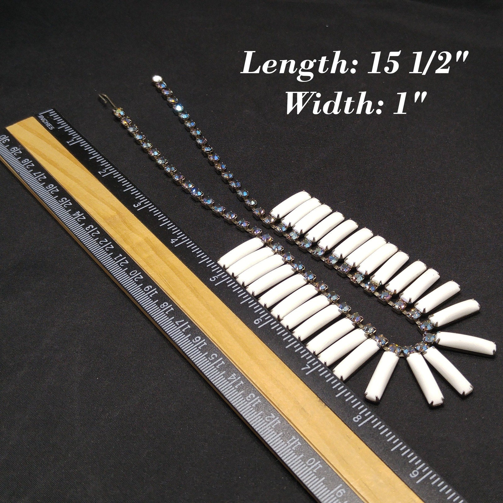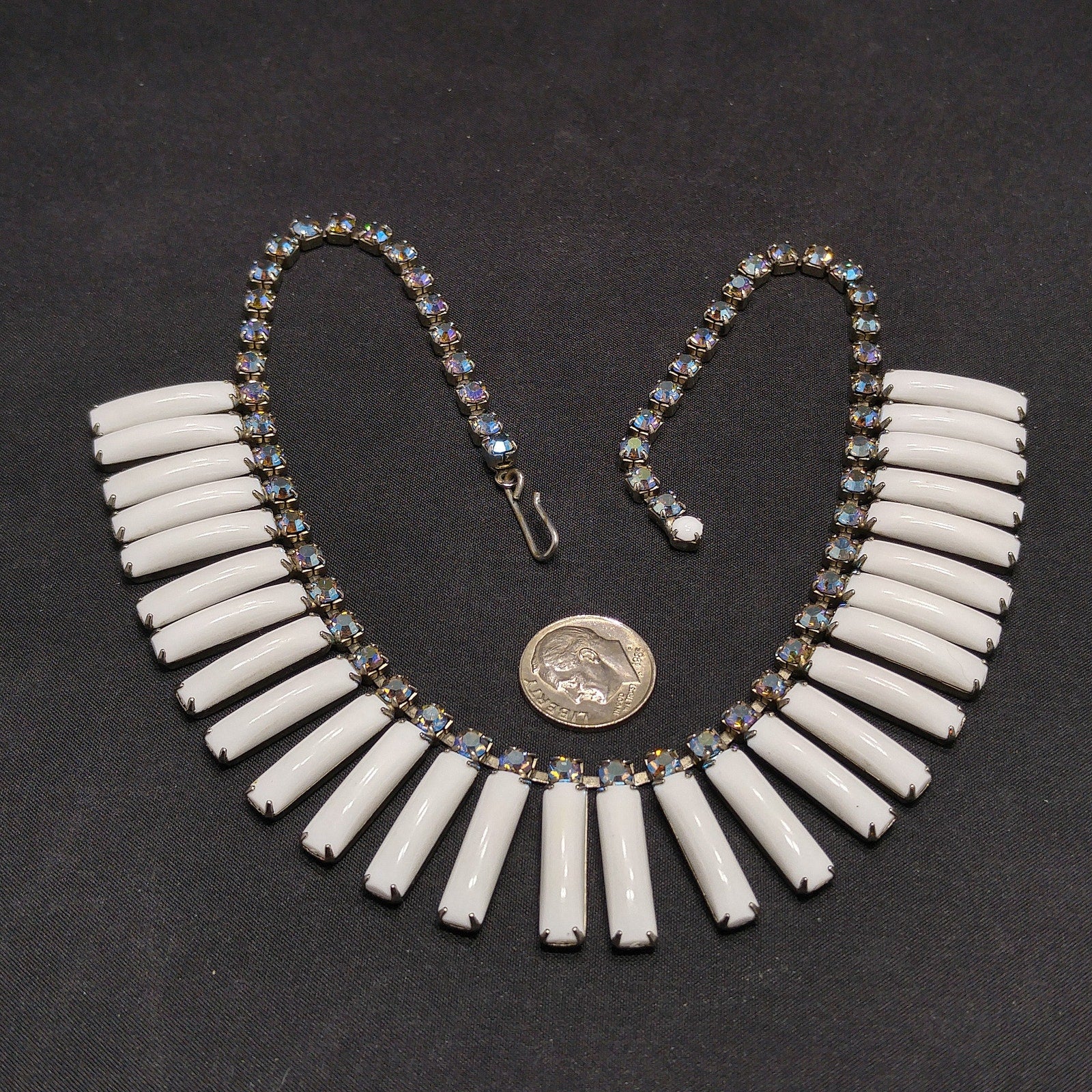 *Description: This is a beautiful Egyptian Revival style choker necklace with long Lucite white cabochons and blue aurora borealis rhinestones, prong set, in silver tone from the 1960s. The rhinestones are sparkling and all in place. It is in excellent condition with no missing stones or discoloration. The style is very unique with a white Lucite stone at the end of the necklace extension. This is an unsigned piece; beautifully designed. This would be a great addition to your vintage jewelry collection or make a great vintage gift!