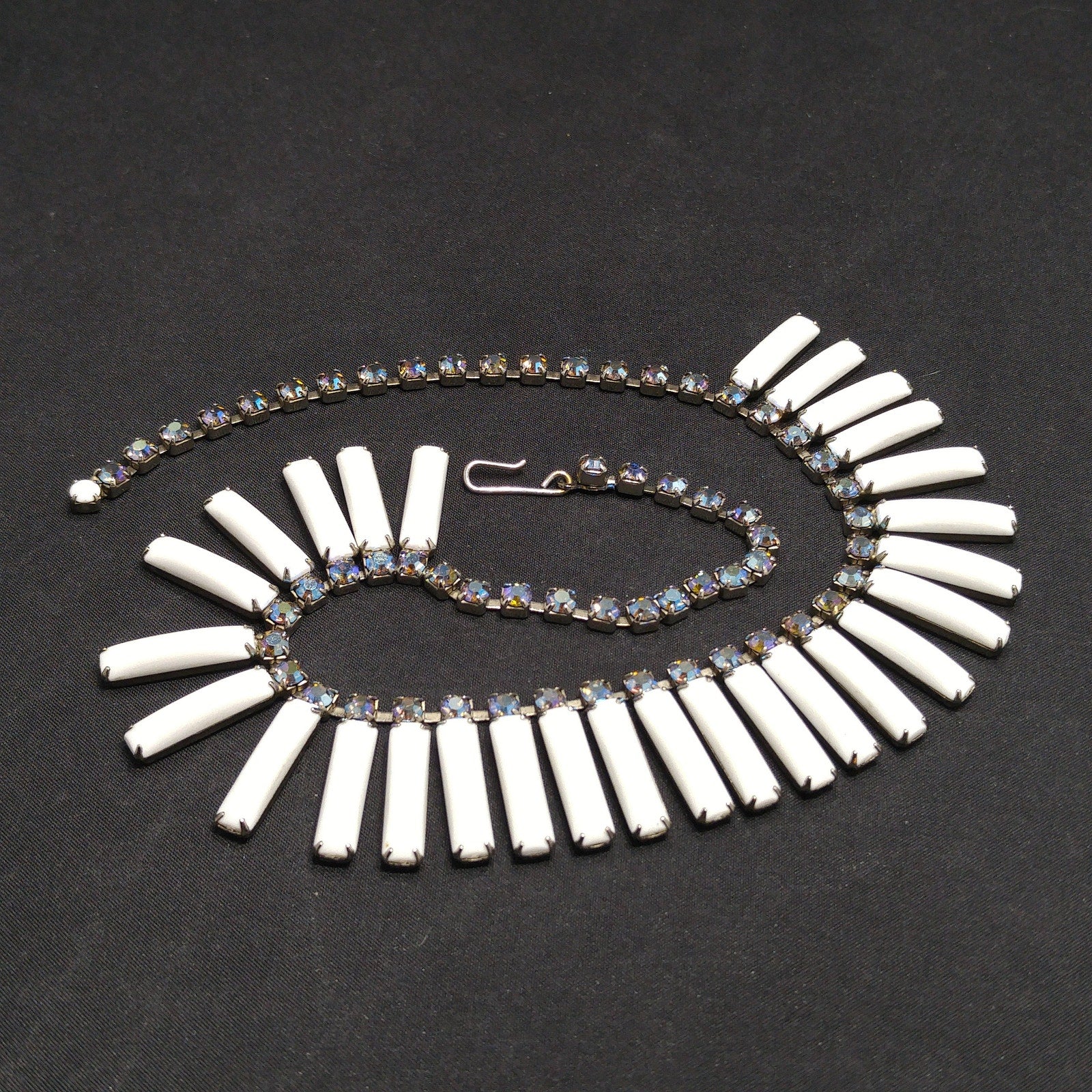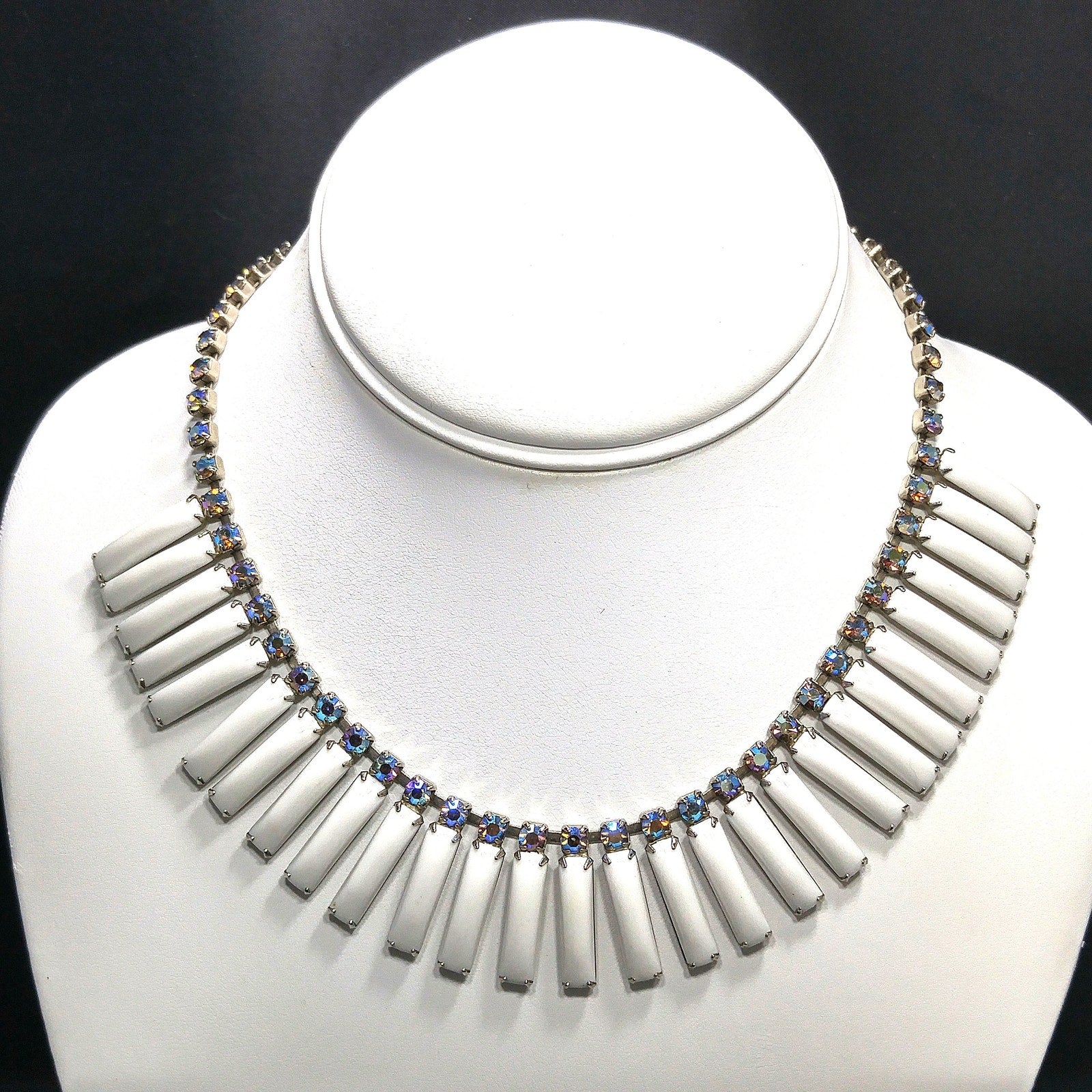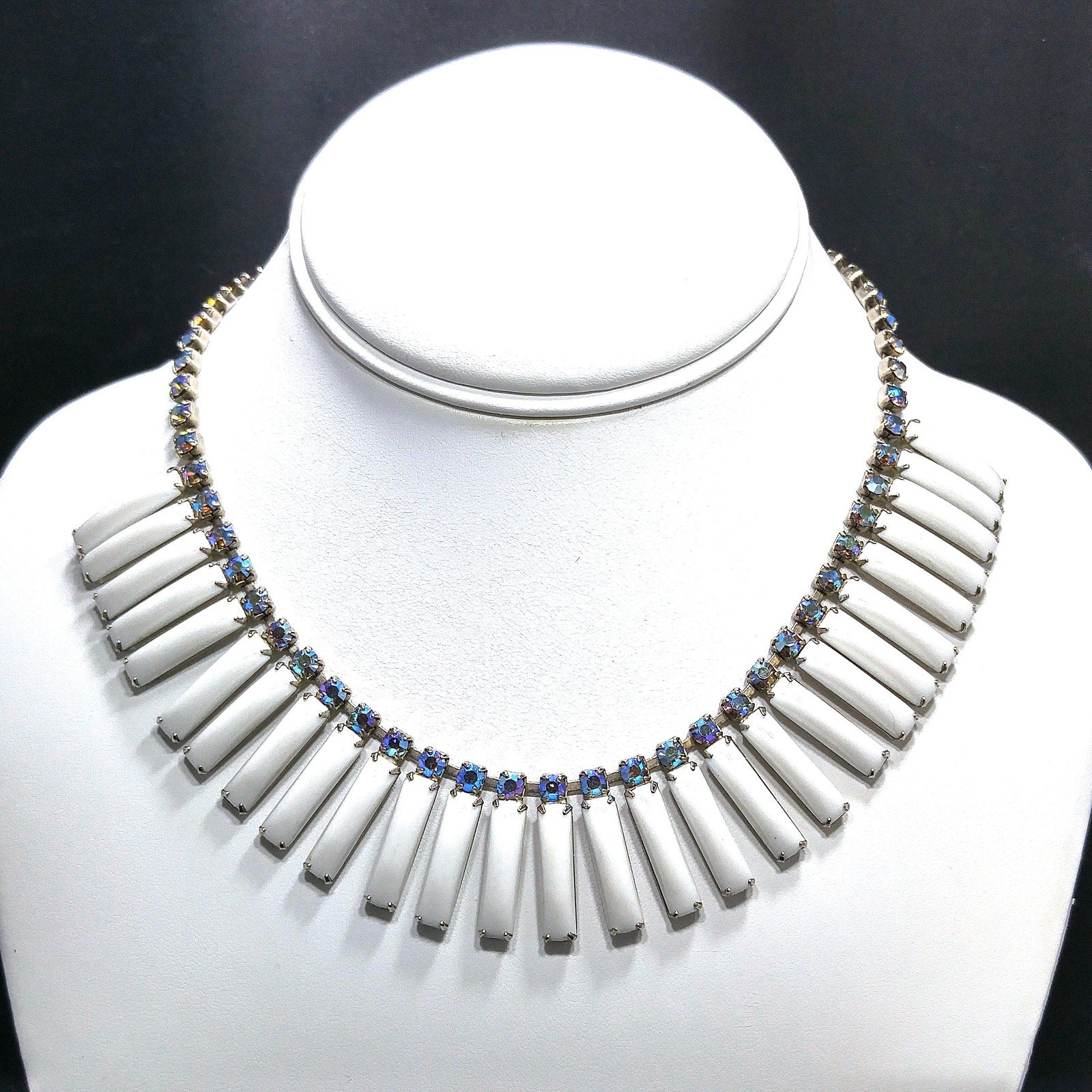 White Lucite Blue Aurora Borealis Rhinestones Necklace, Egyptian Revival Mid-Century, 1960s Vintage Jewelry