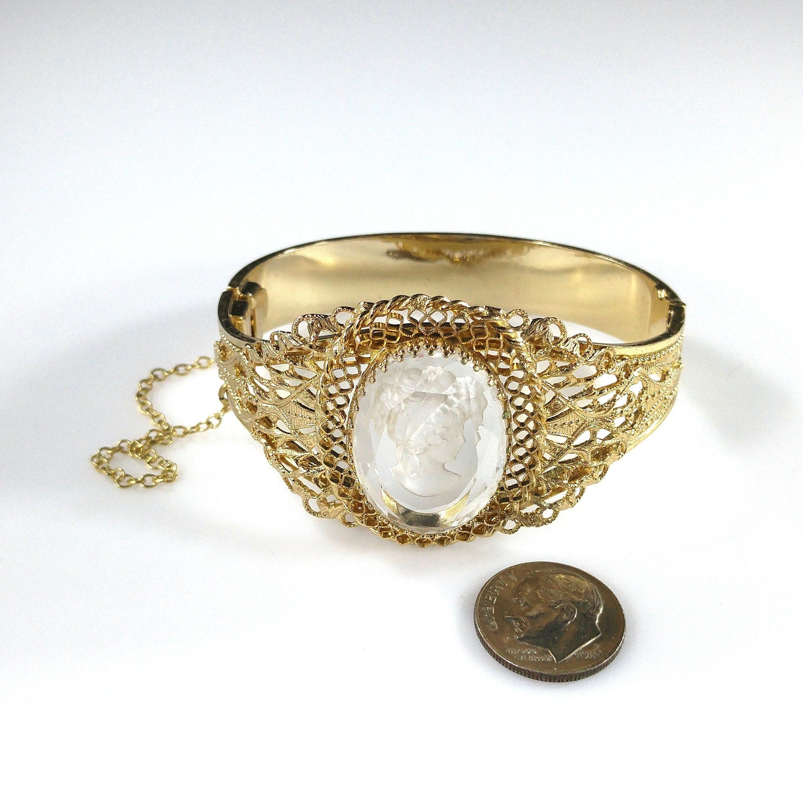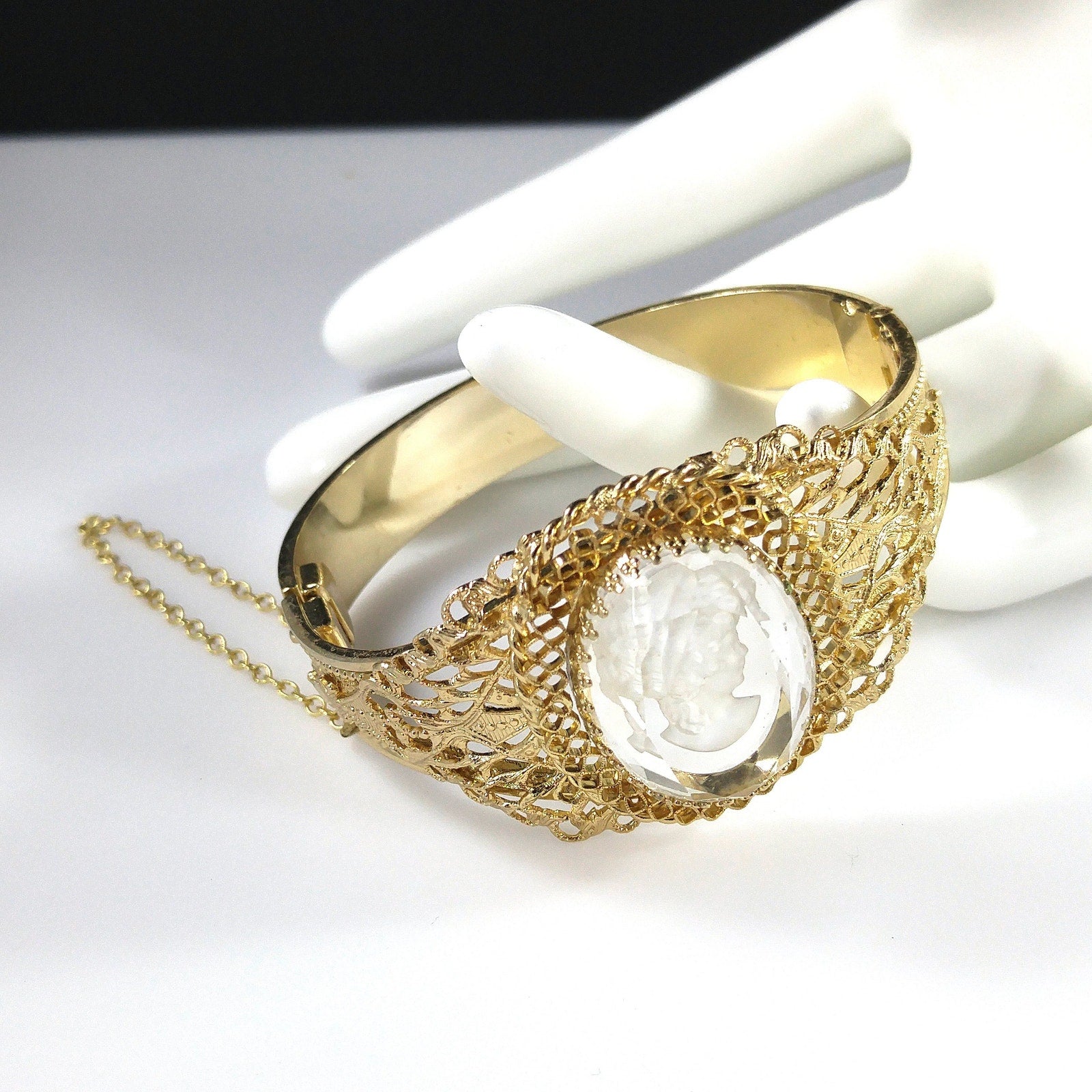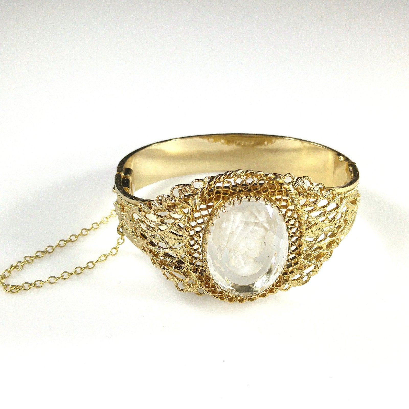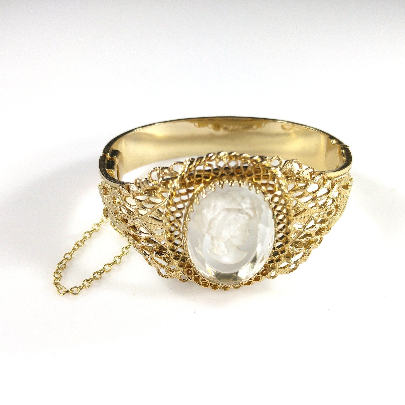 *Description: This is a beautiful Whiting and Davis intaglio Cameo clear glass oval hinged bracelet in gold plate from the 1960s to 1970s. The hinged bracelet has a slide lock clasp with a safety chain. The glass cameo is framed with filigree textured designs. This would be a great addition to your vintage jewelry collection or make a great vintage gift!