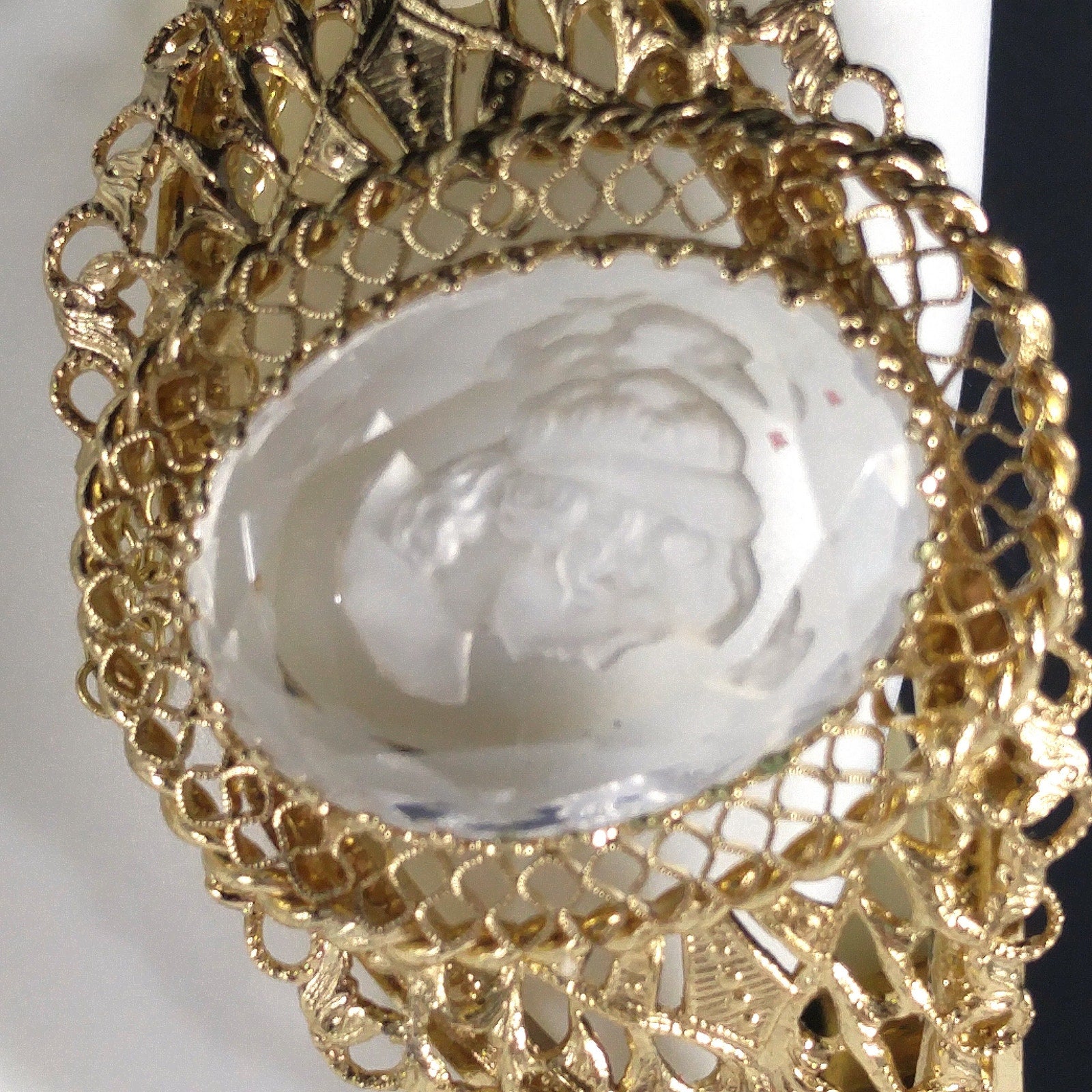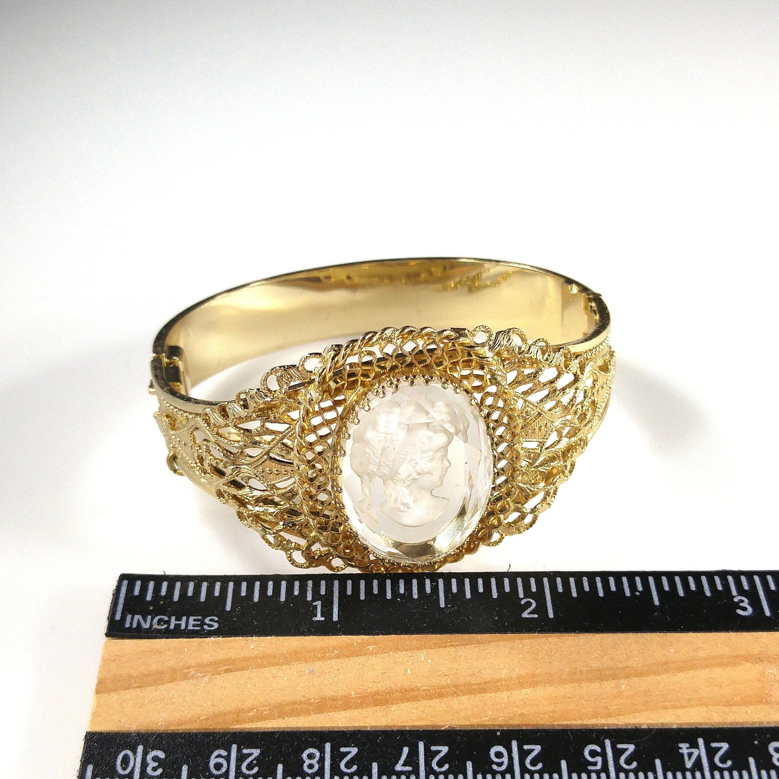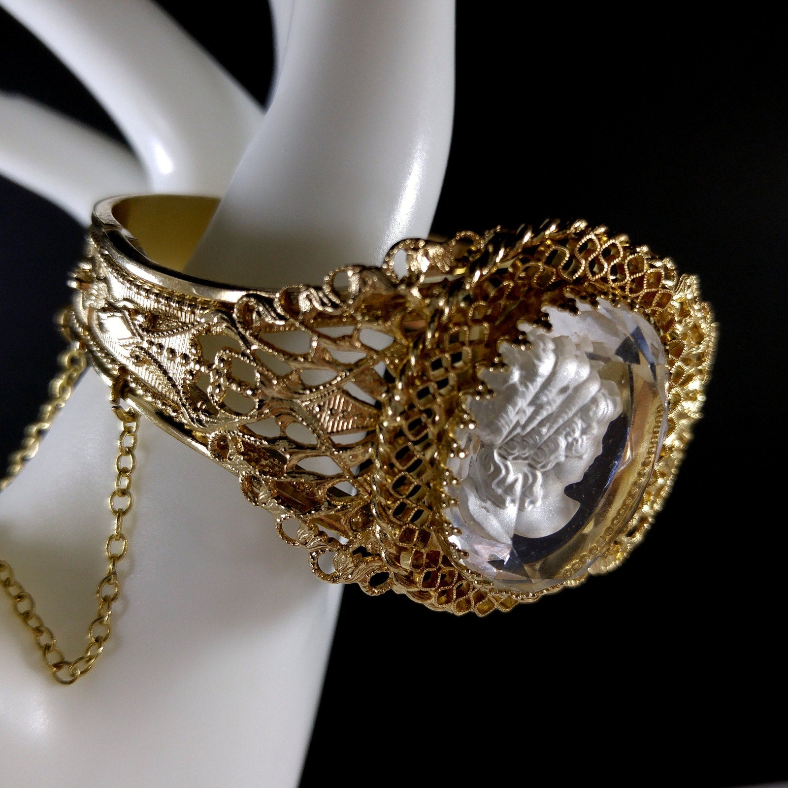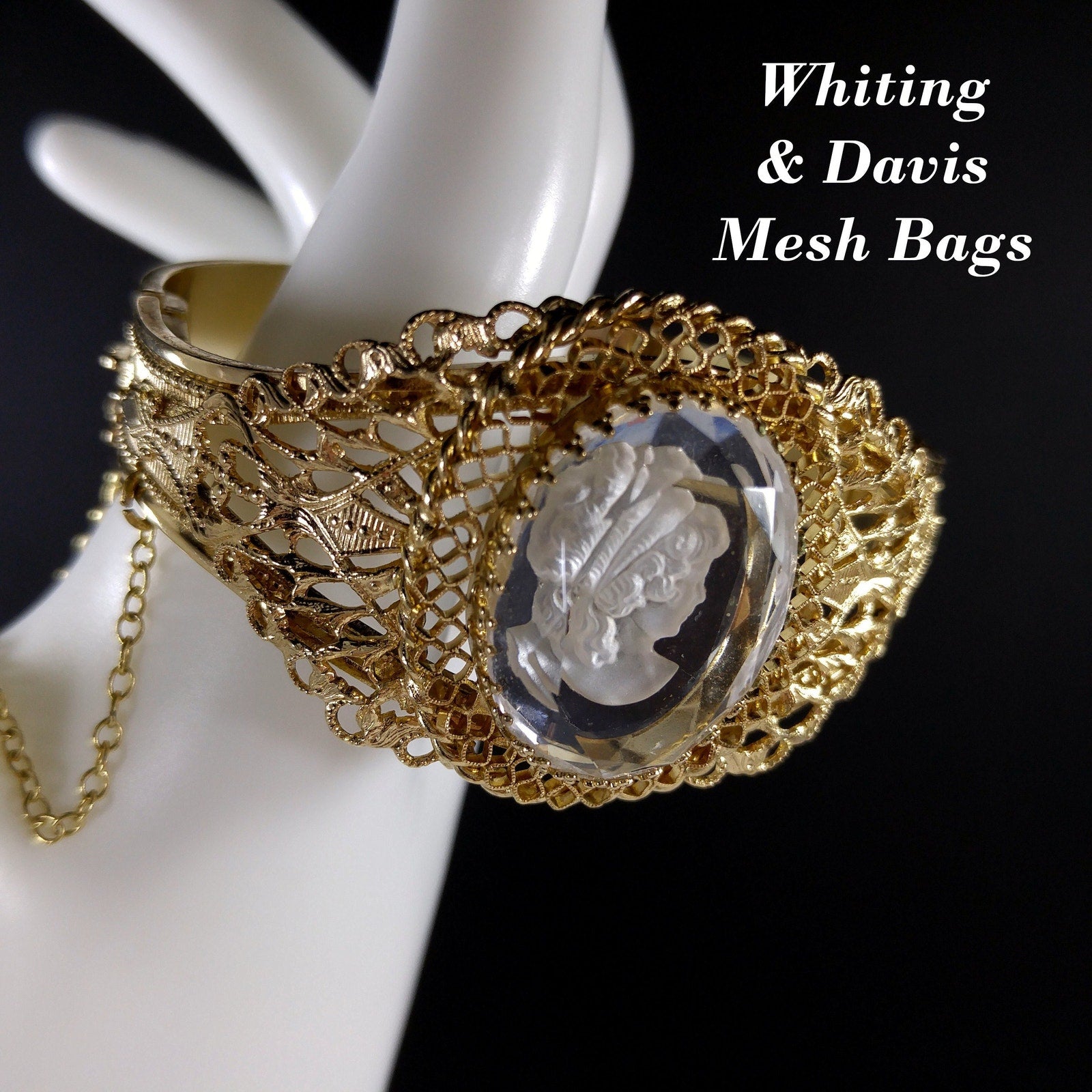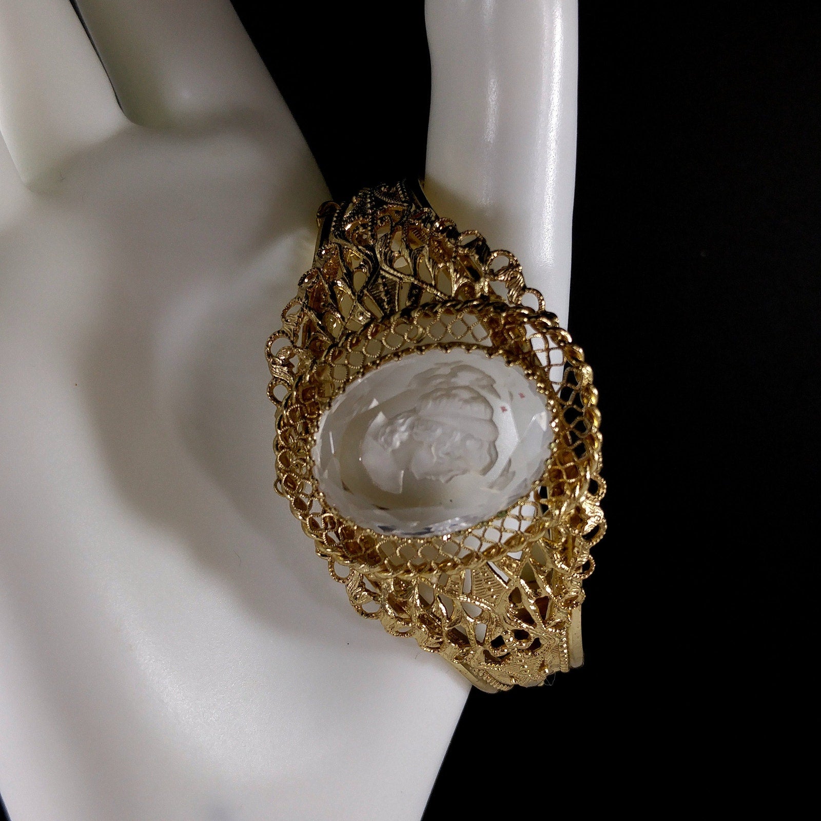 *Description: This is a beautiful Whiting and Davis intaglio Cameo clear glass oval hinged bracelet in gold plate from the 1960s to 1970s. The hinged bracelet has a slide lock clasp with a safety chain. The glass cameo is framed with filigree textured designs. This would be a great addition to your vintage jewelry collection or make a great vintage gift!