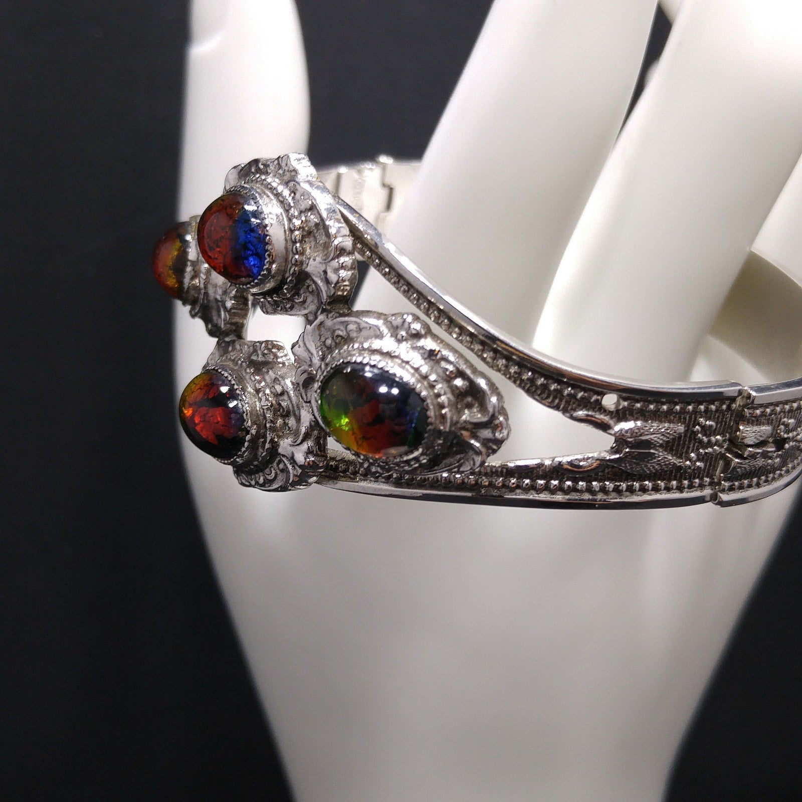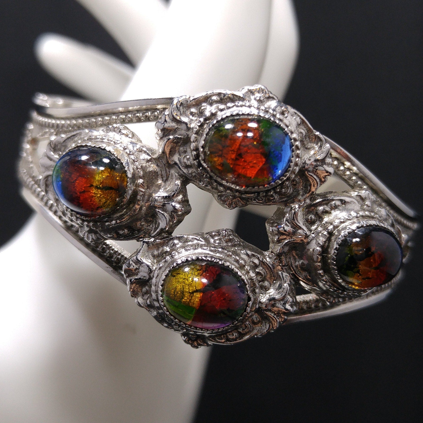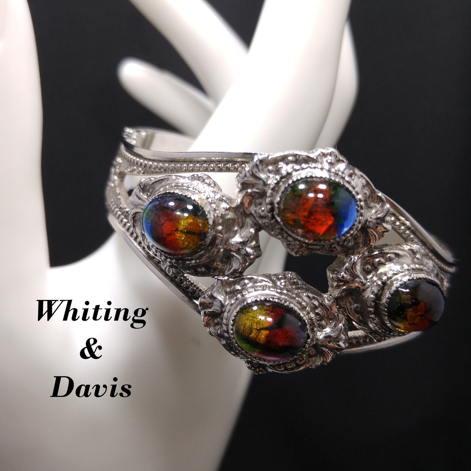 *Description: This is a great Whiting and Davis cuff bracelet with four gold foil and rainbow colored cabochons in rhodium plate from the 1970s. The bracelet is stamped Whiting & Davis bags on the hinge inside. The bracelet is 7 inches around the inside and closes securely. There is beautiful metal work designs around the bracelet. This is a rare find with the foil gold cabochons and in rhodium plate. This would be a great addition to your vintage jewelry collection or make a great vintage gift!