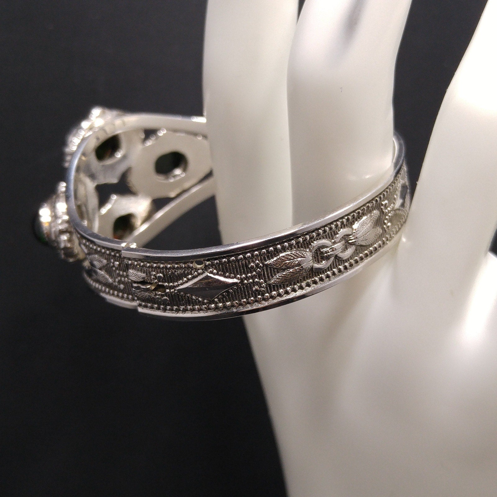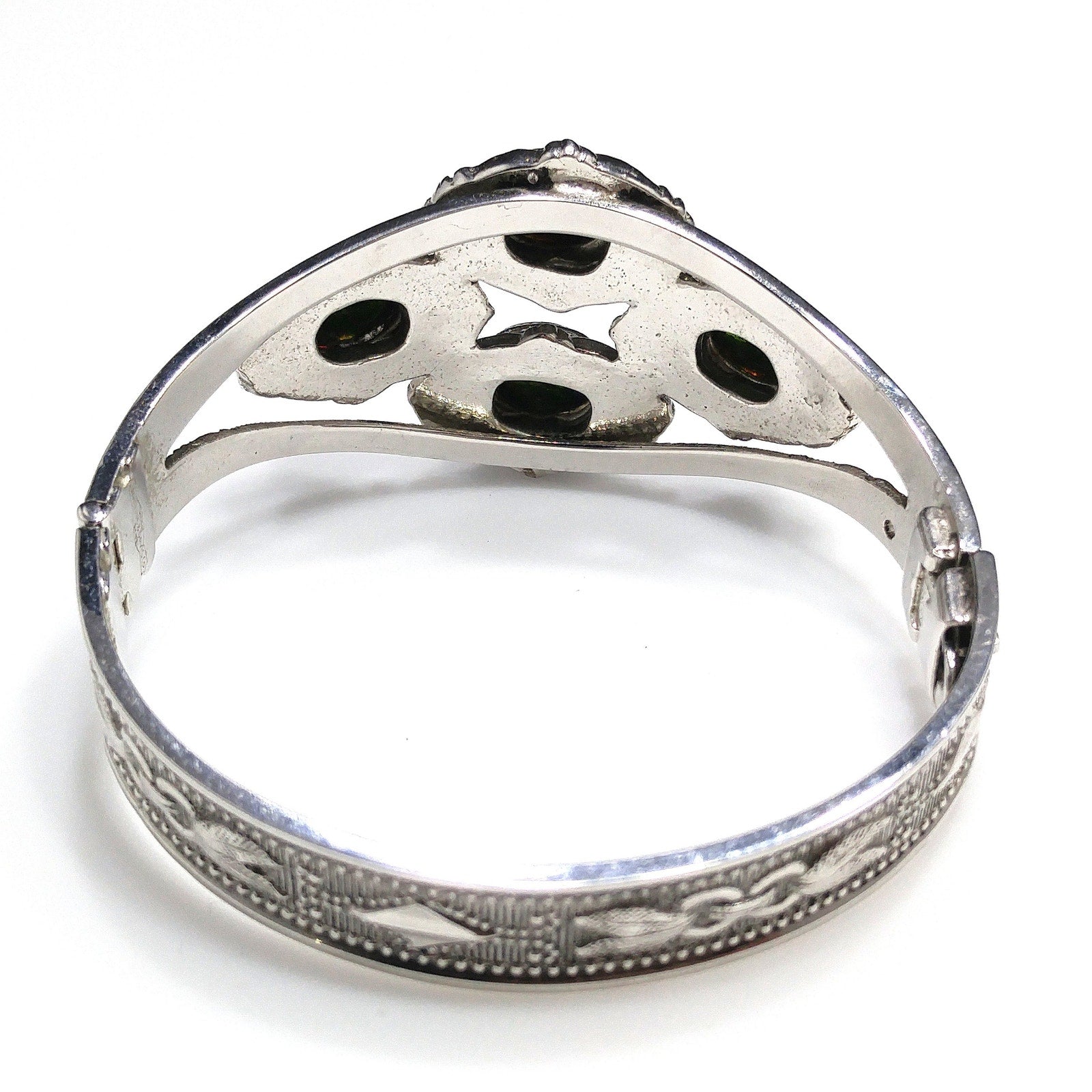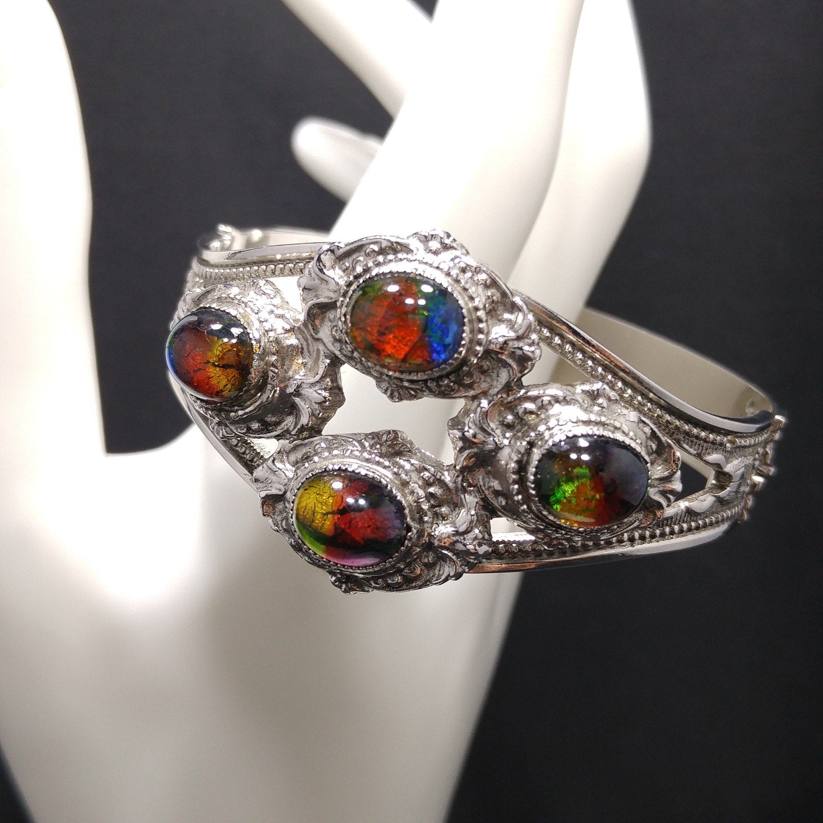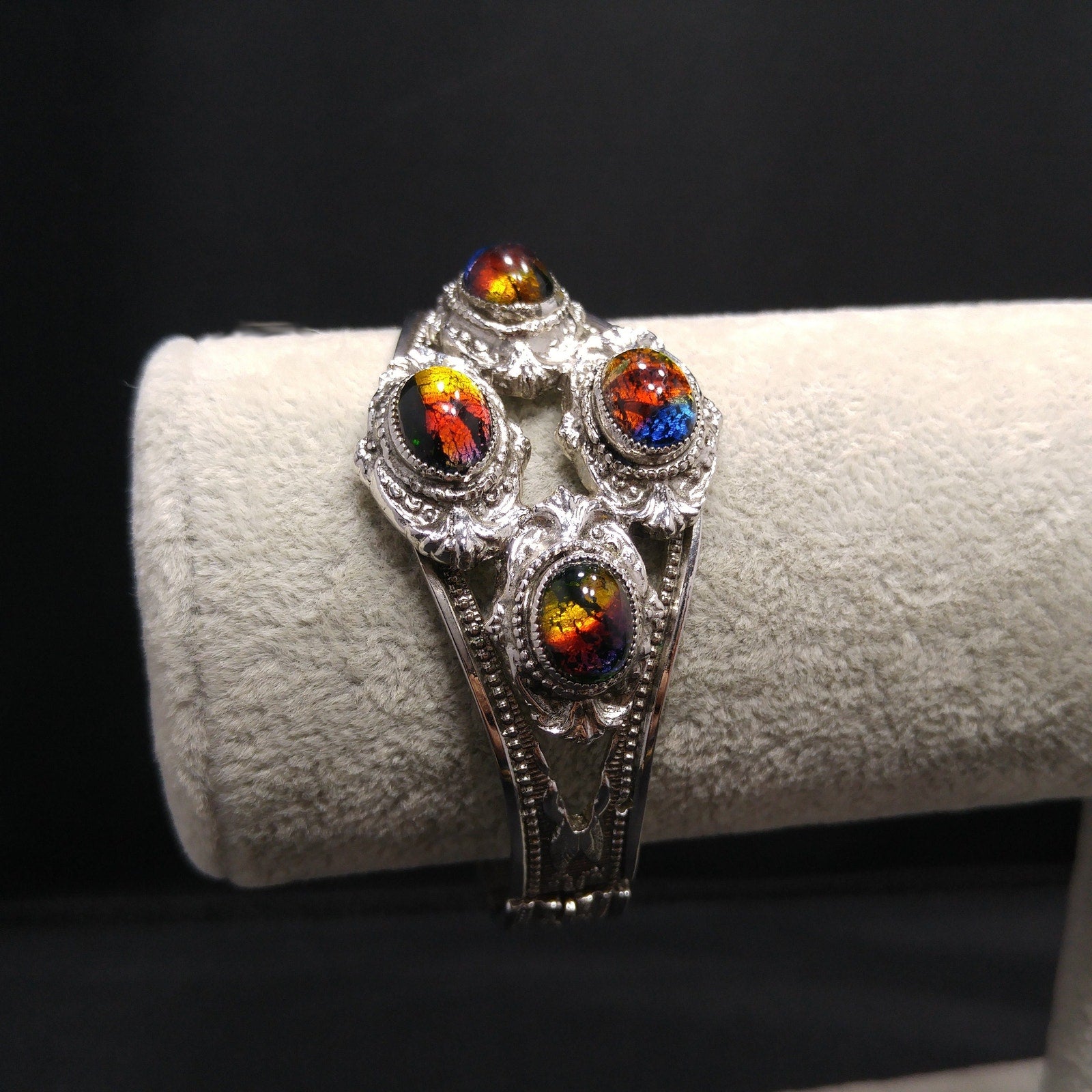 *Description: This is a great Whiting and Davis cuff bracelet with four gold foil and rainbow colored cabochons in rhodium plate from the 1970s. The bracelet is stamped Whiting & Davis bags on the hinge inside. The bracelet is 7 inches around the inside and closes securely. There is beautiful metal work designs around the bracelet. This is a rare find with the foil gold cabochons and in rhodium plate. This would be a great addition to your vintage jewelry collection or make a great vintage gift!