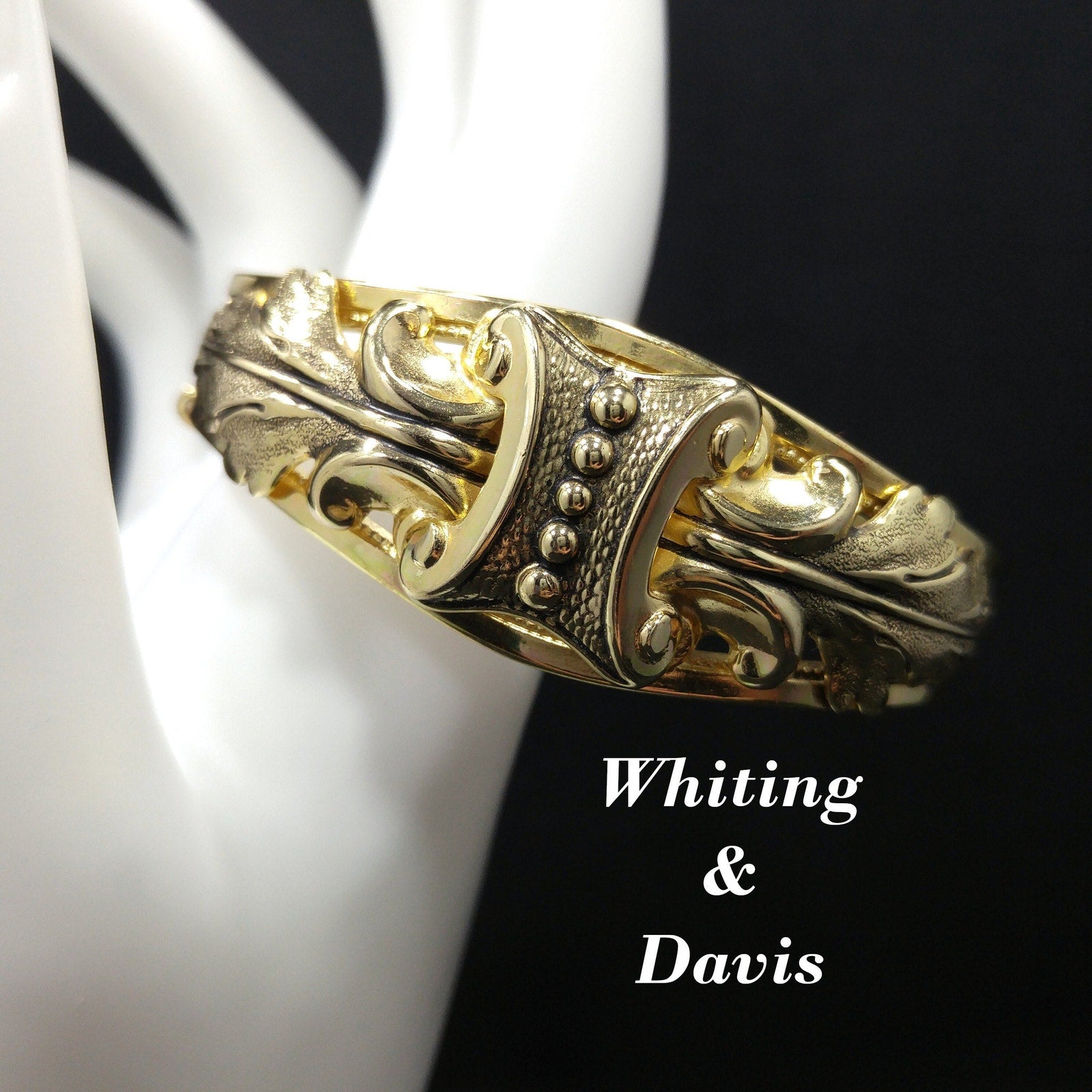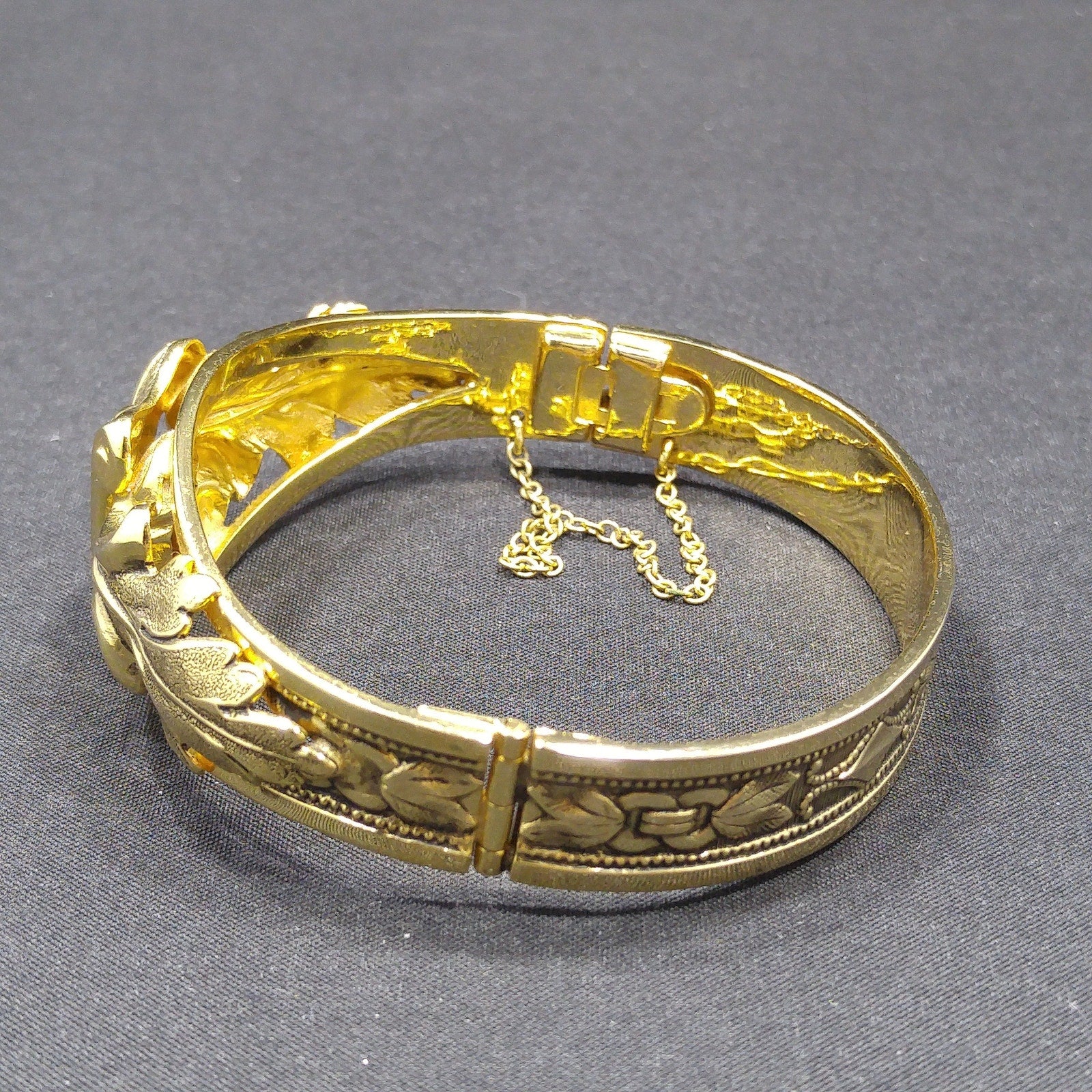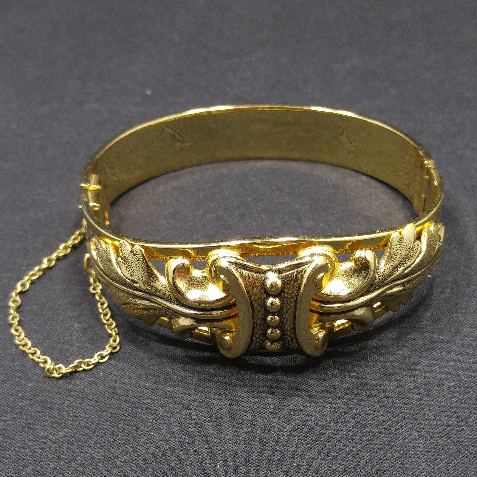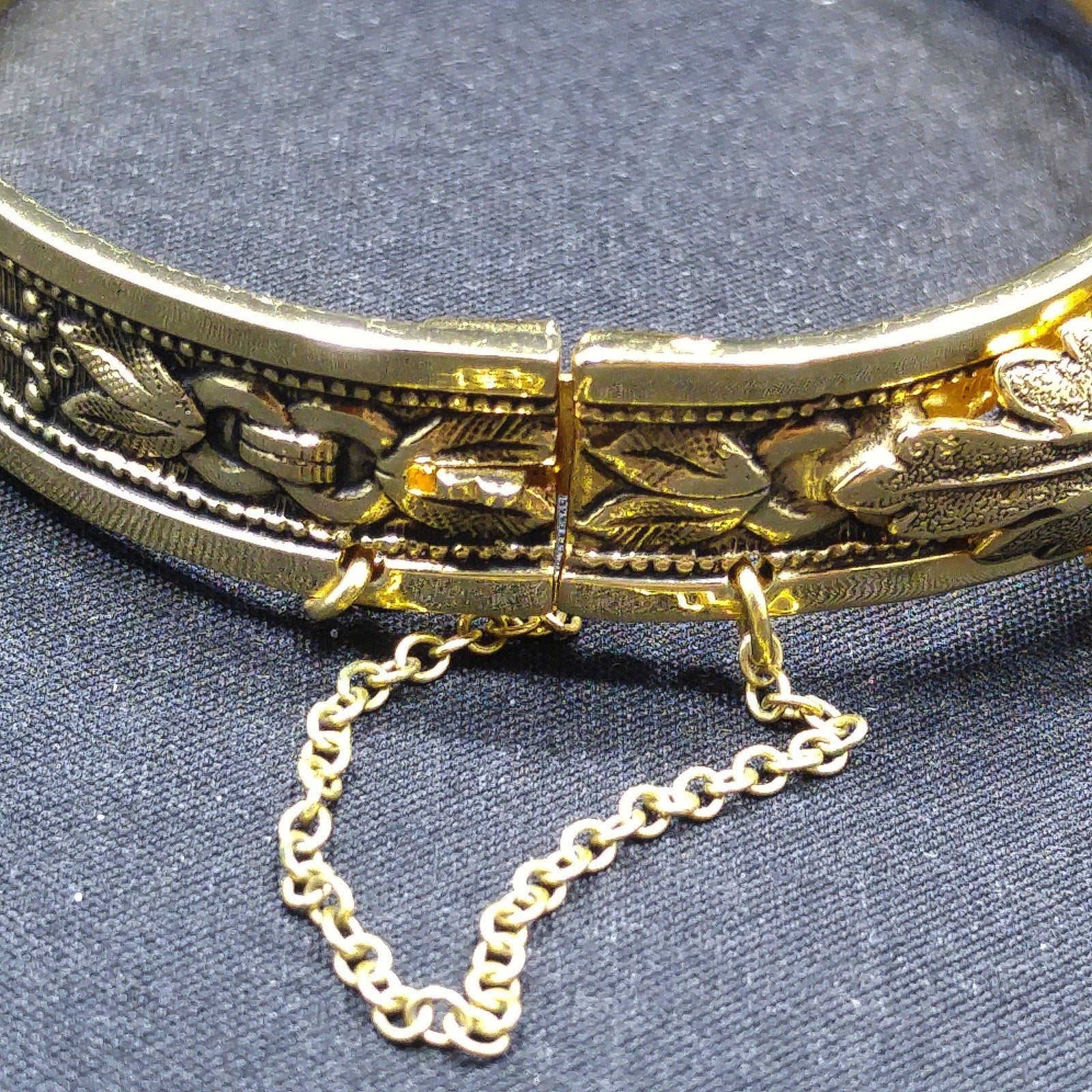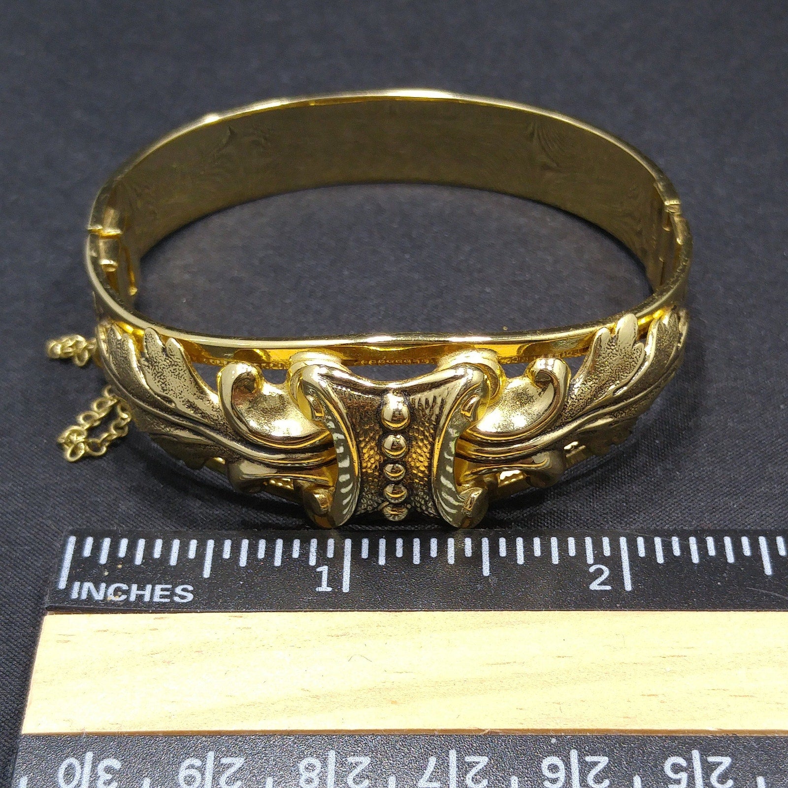 *Description: This is a great gold plated Whiting & Davis hinged bracelet with safety chain from the 1960s. The bracelet is in great condition and would be a great addition to your vintage jewelry collection or make a great vintage gift! Whiting & Davis began their company in 1926 and was famous for their mesh bags and mesh jewelry. They used heavy gold and silver tone rhodium plating with their signature stamped into the metal or on a metal hang tag. According to Julia C Carroll in Costume Jewelry 101, she states that it is unclear when the company first produced jewelry, although vintage advertising was available in 1931. She also states that they made metal jewelry designs which often include open latticework, mesh, and or intricate overlapping metal leaves. The metalwork often frames one large center piece, such as reverse carved glass cameos. Due to the high quality metal work and stones, the jewelry is highly collectible. During the 1950s, some items were reproductions of vintage museum jewelry.