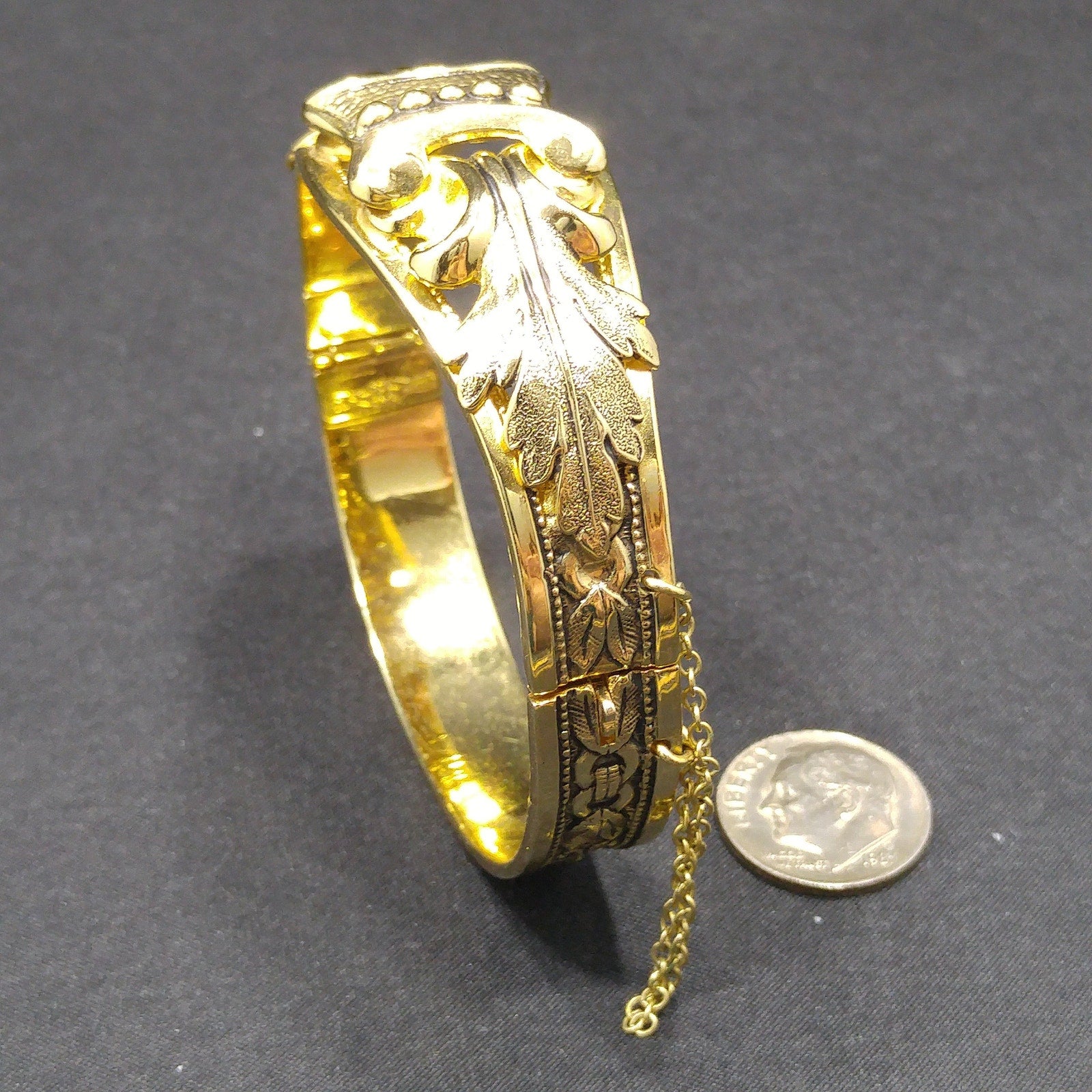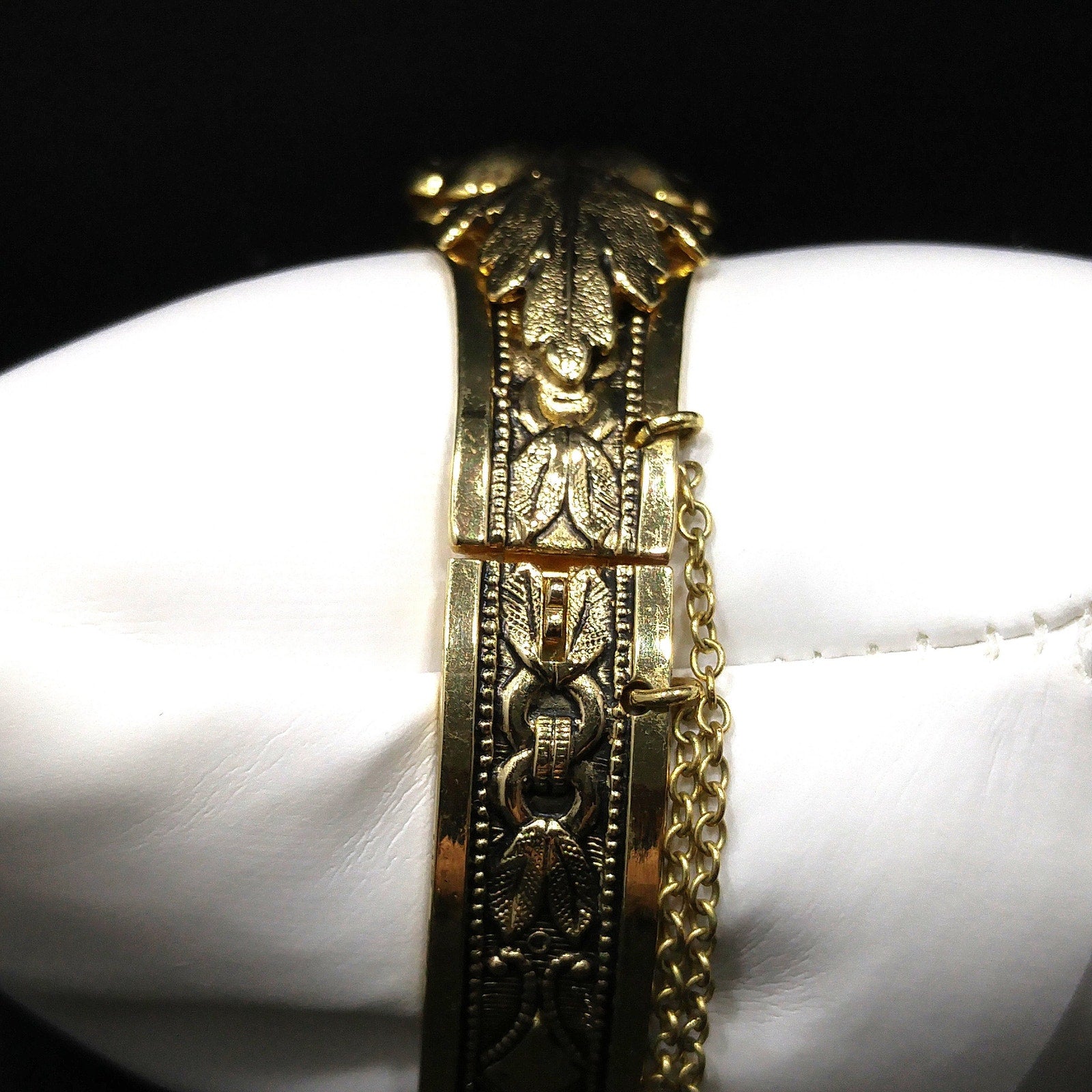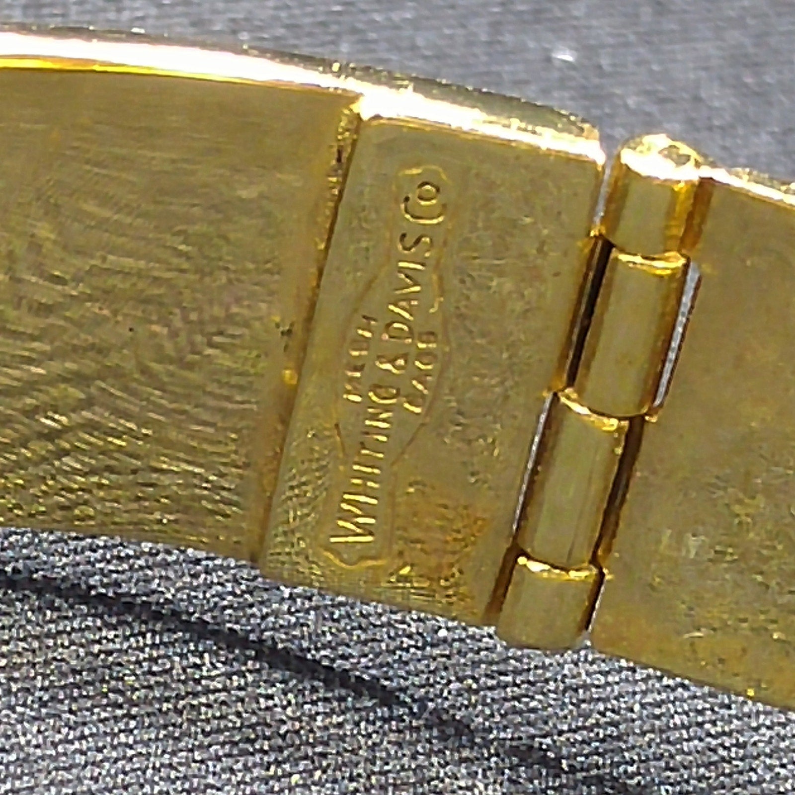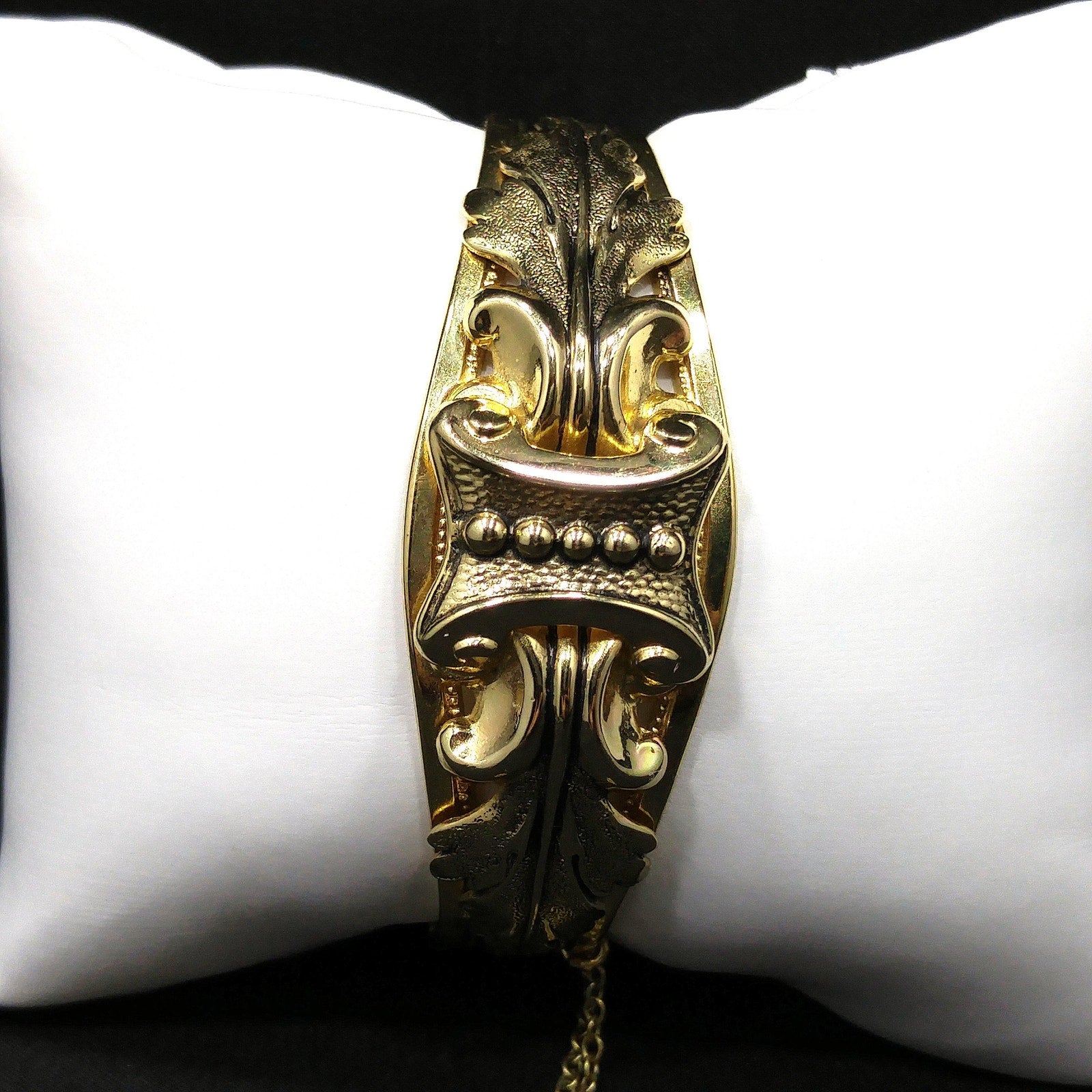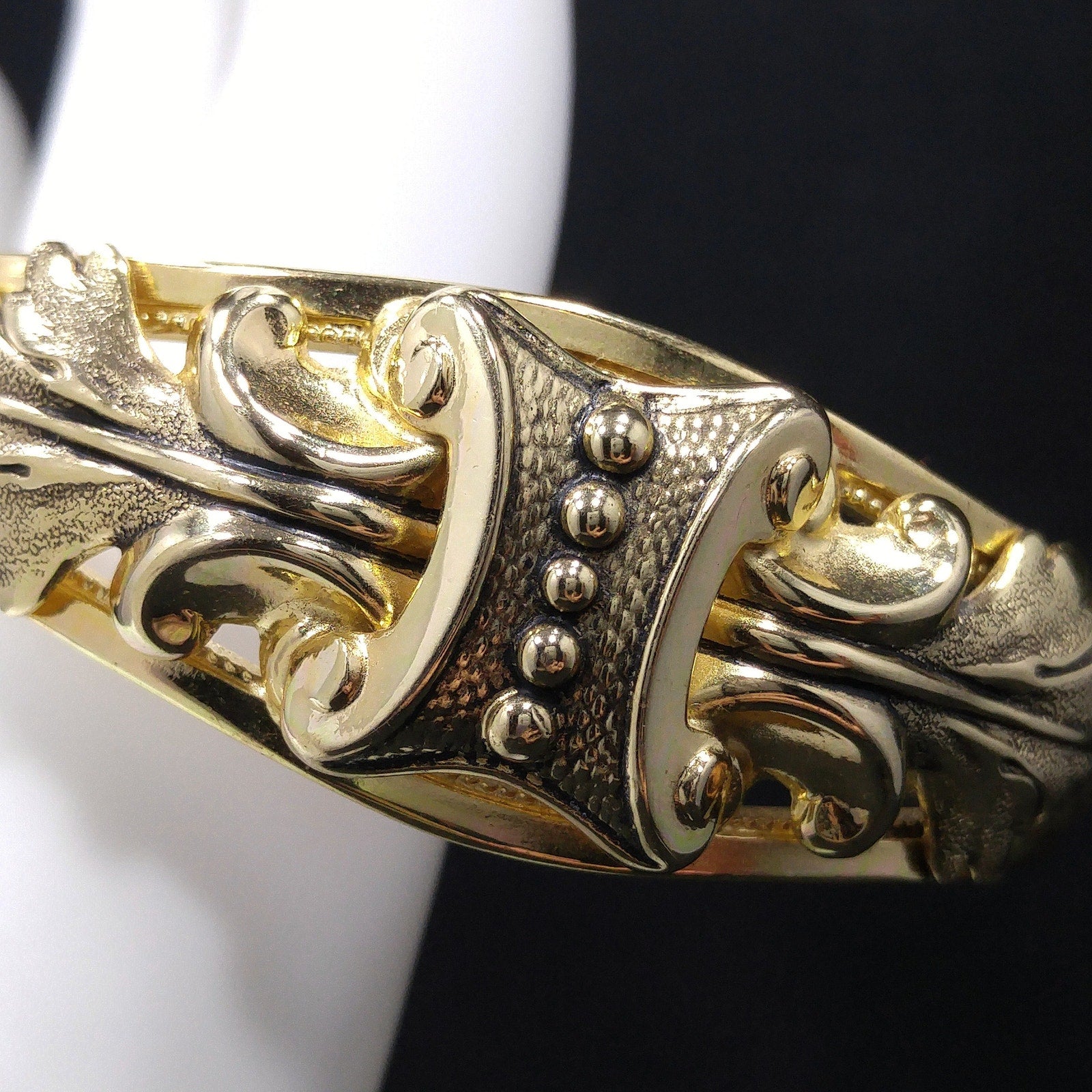 *Description: This is a great gold plated Whiting & Davis hinged bracelet with safety chain from the 1960s. The bracelet is in great condition and would be a great addition to your vintage jewelry collection or make a great vintage gift! Whiting & Davis began their company in 1926 and was famous for their mesh bags and mesh jewelry. They used heavy gold and silver tone rhodium plating with their signature stamped into the metal or on a metal hang tag. According to Julia C Carroll in Costume Jewelry 101, she states that it is unclear when the company first produced jewelry, although vintage advertising was available in 1931. She also states that they made metal jewelry designs which often include open latticework, mesh, and or intricate overlapping metal leaves. The metalwork often frames one large center piece, such as reverse carved glass cameos. Due to the high quality metal work and stones, the jewelry is highly collectible. During the 1950s, some items were reproductions of vintage museum jewelry.