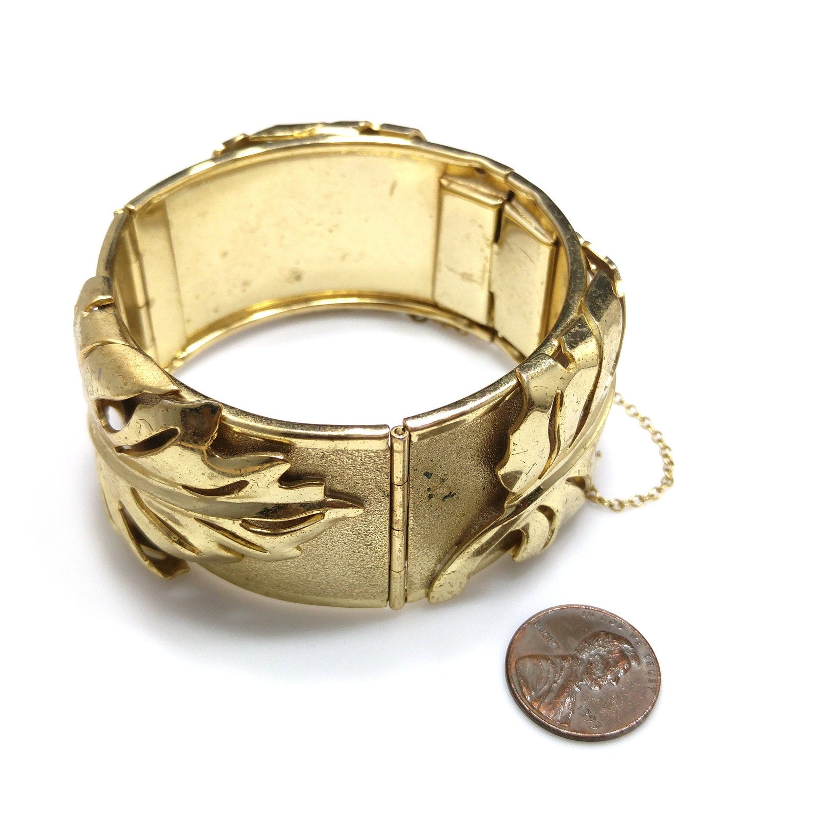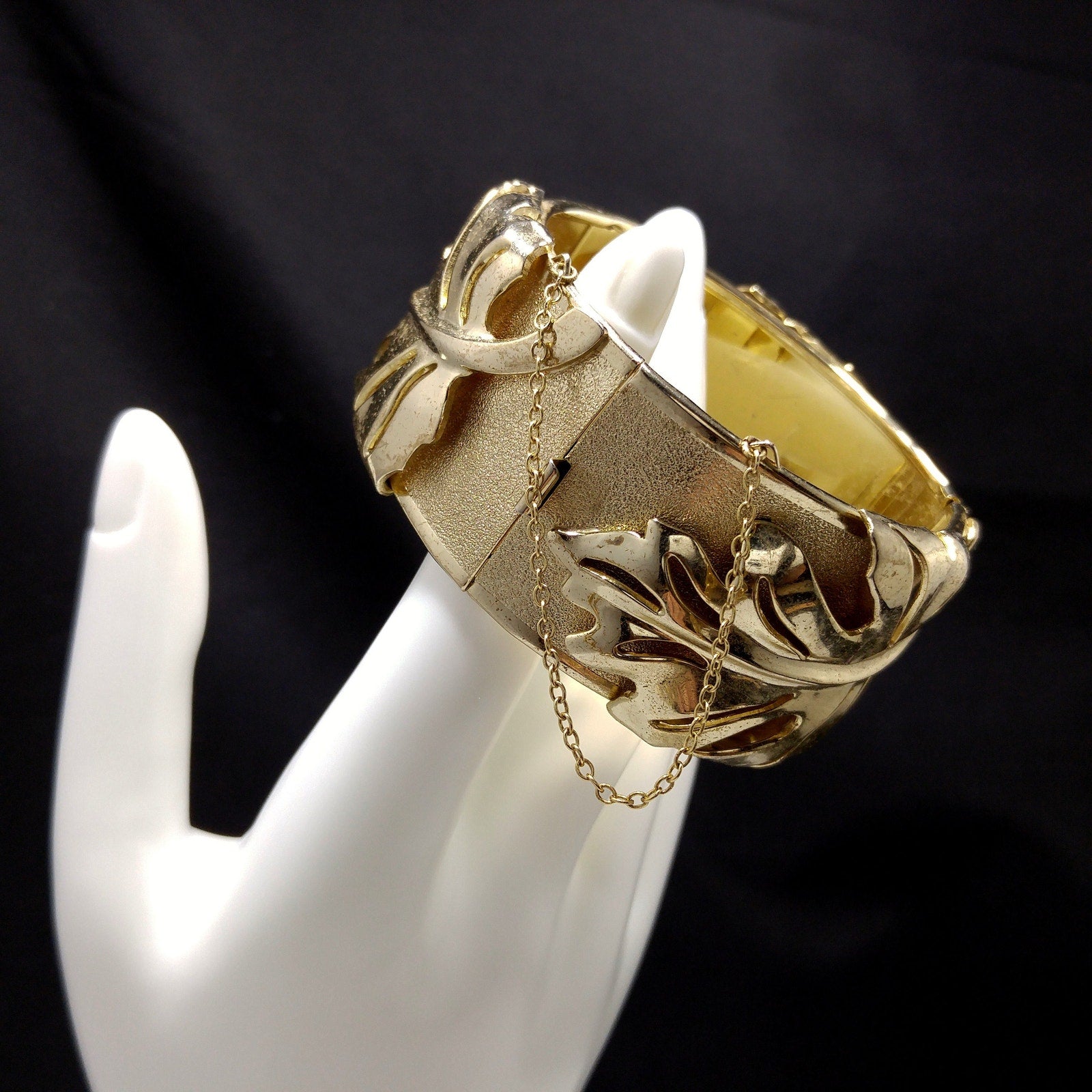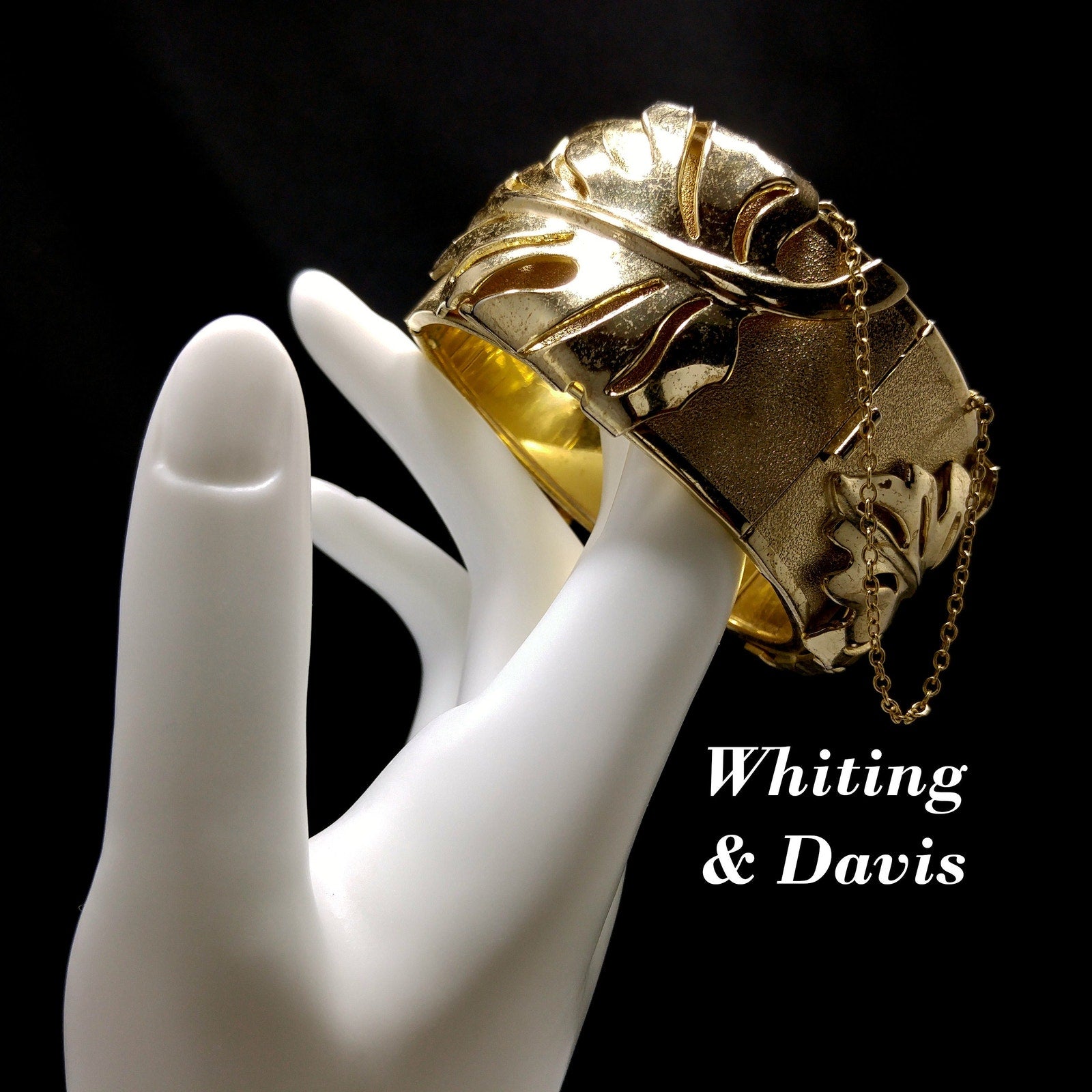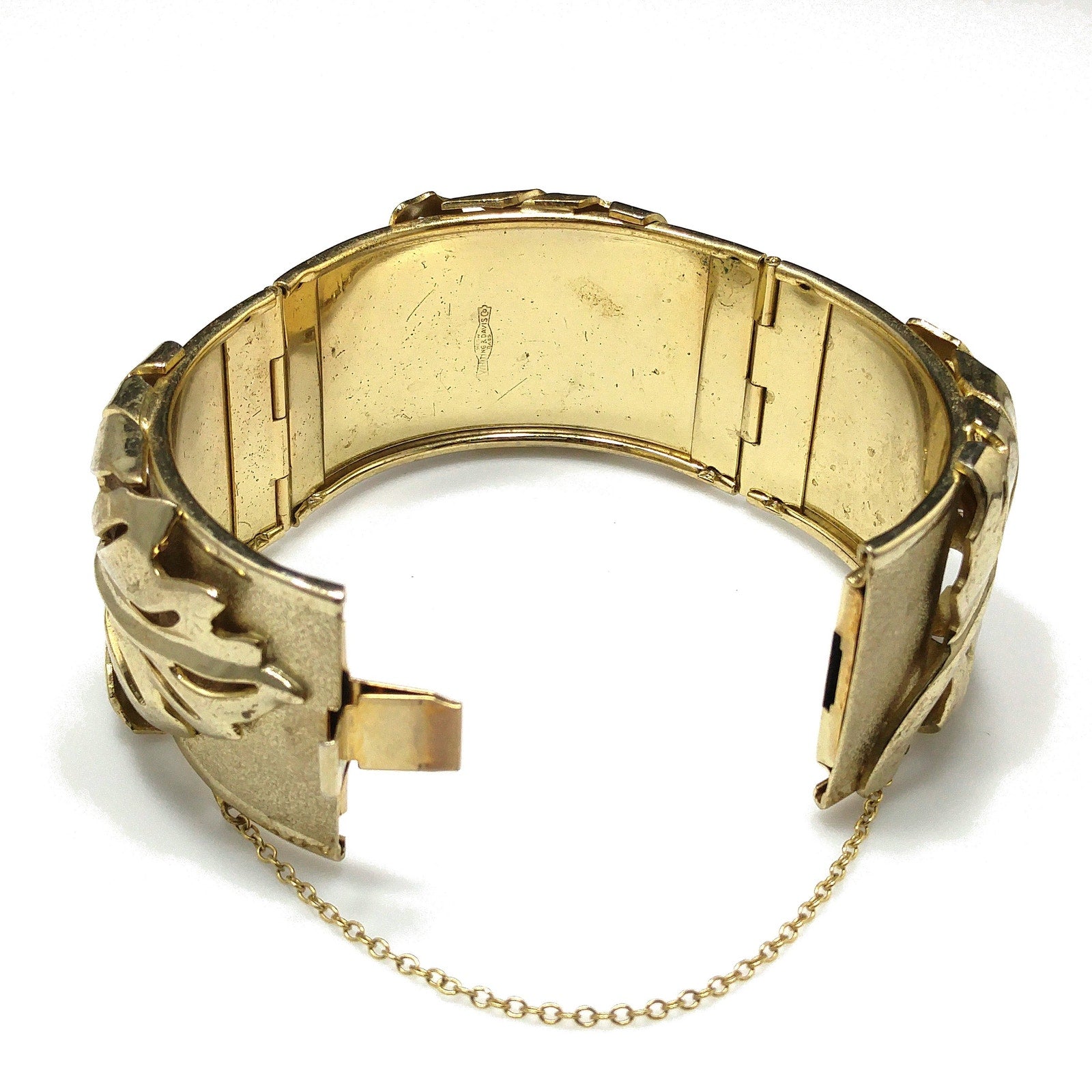 *Description: This is a very unique Whiting and Davis hinged bracelet in a leaf design with a safety chain from the 1950s. The unique design is the bracelet has two hinges, rather than one, so that this bracelet opens very wide with three sections, and then has a hidden box clasp with a built in safety chain to protect your bracelet from being lost. Each of the three sections, between the clasp and two hinges, have a large leaf which is a very reflective smooth gold plated leaf on a textured gold plated bracelet. The inside of the bracelet is stamped Whiting and Davis. This would be a great addition to your vintage jewelry collection or make a great vintage gift!