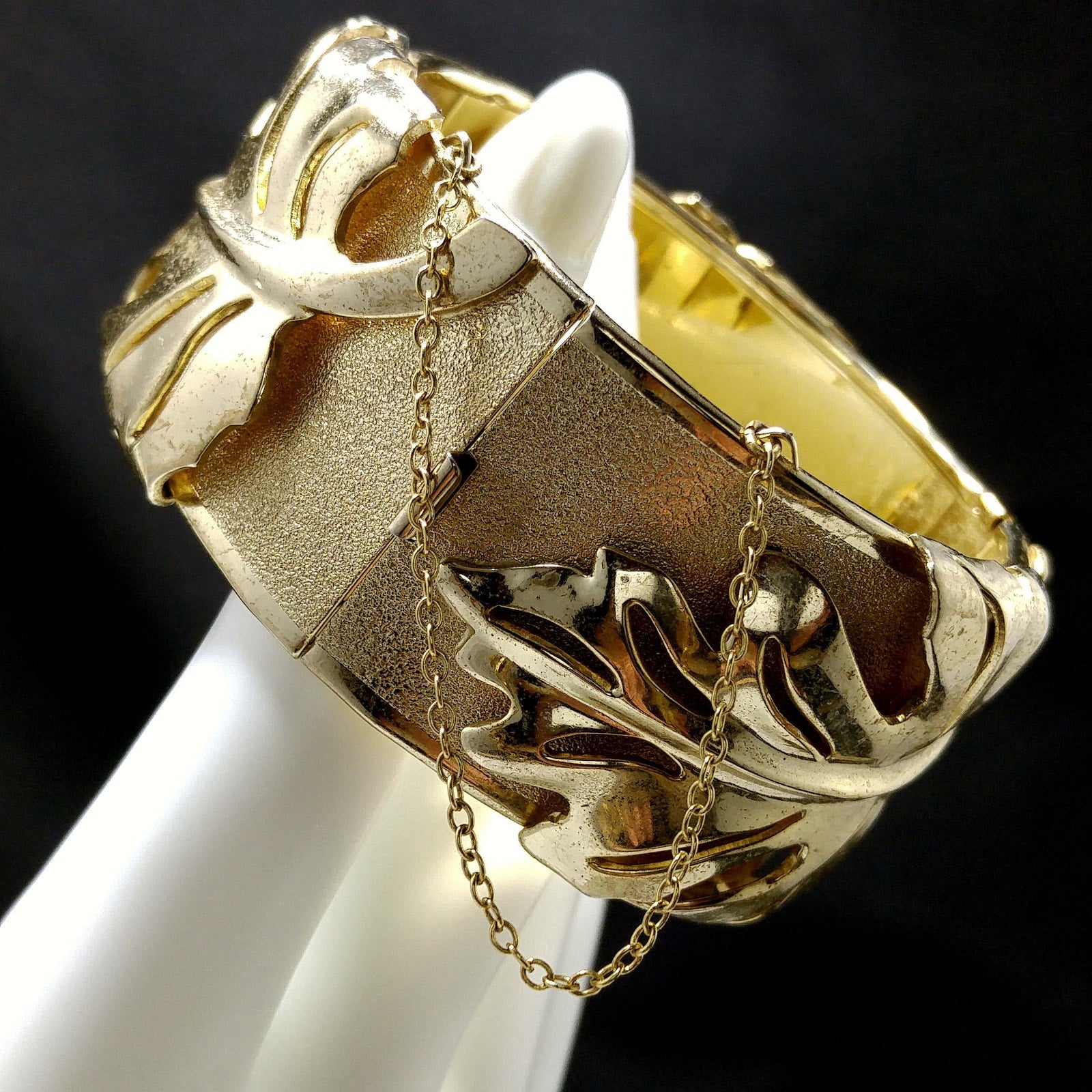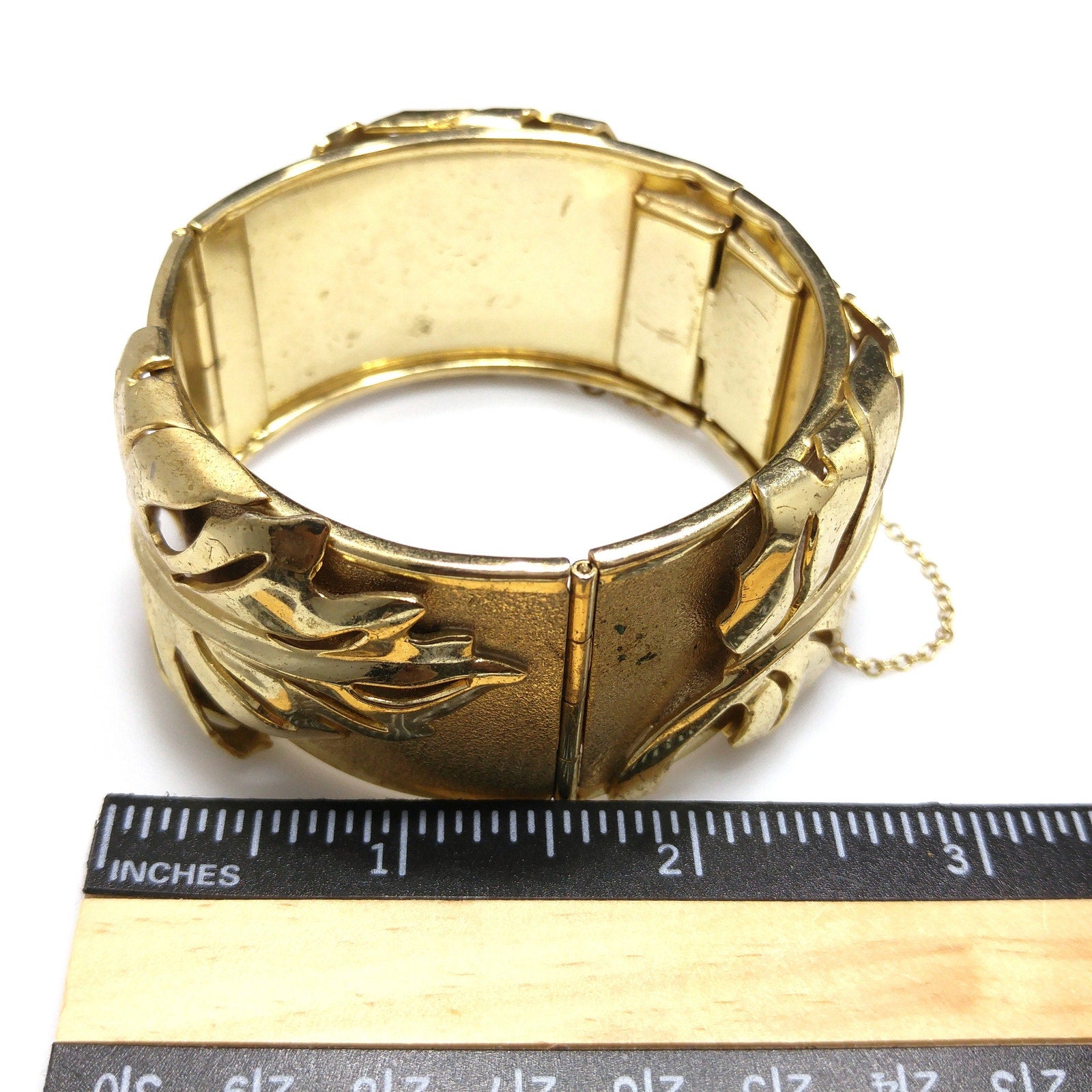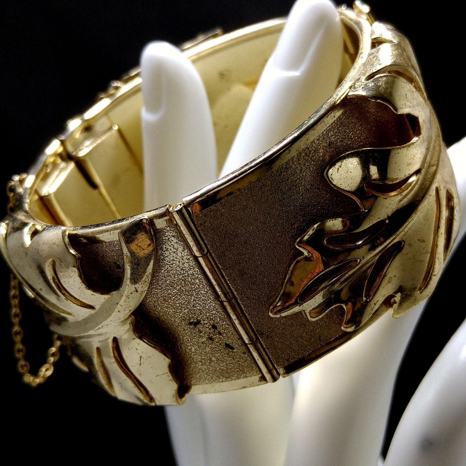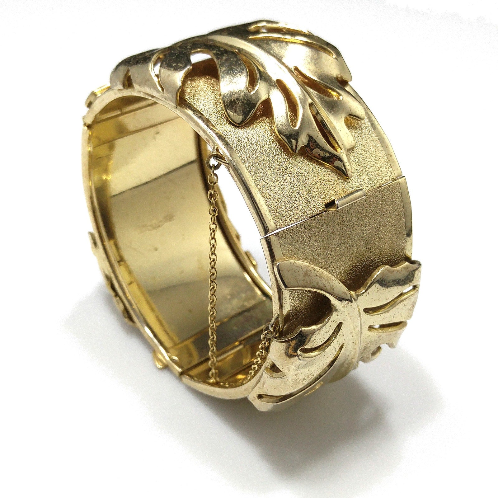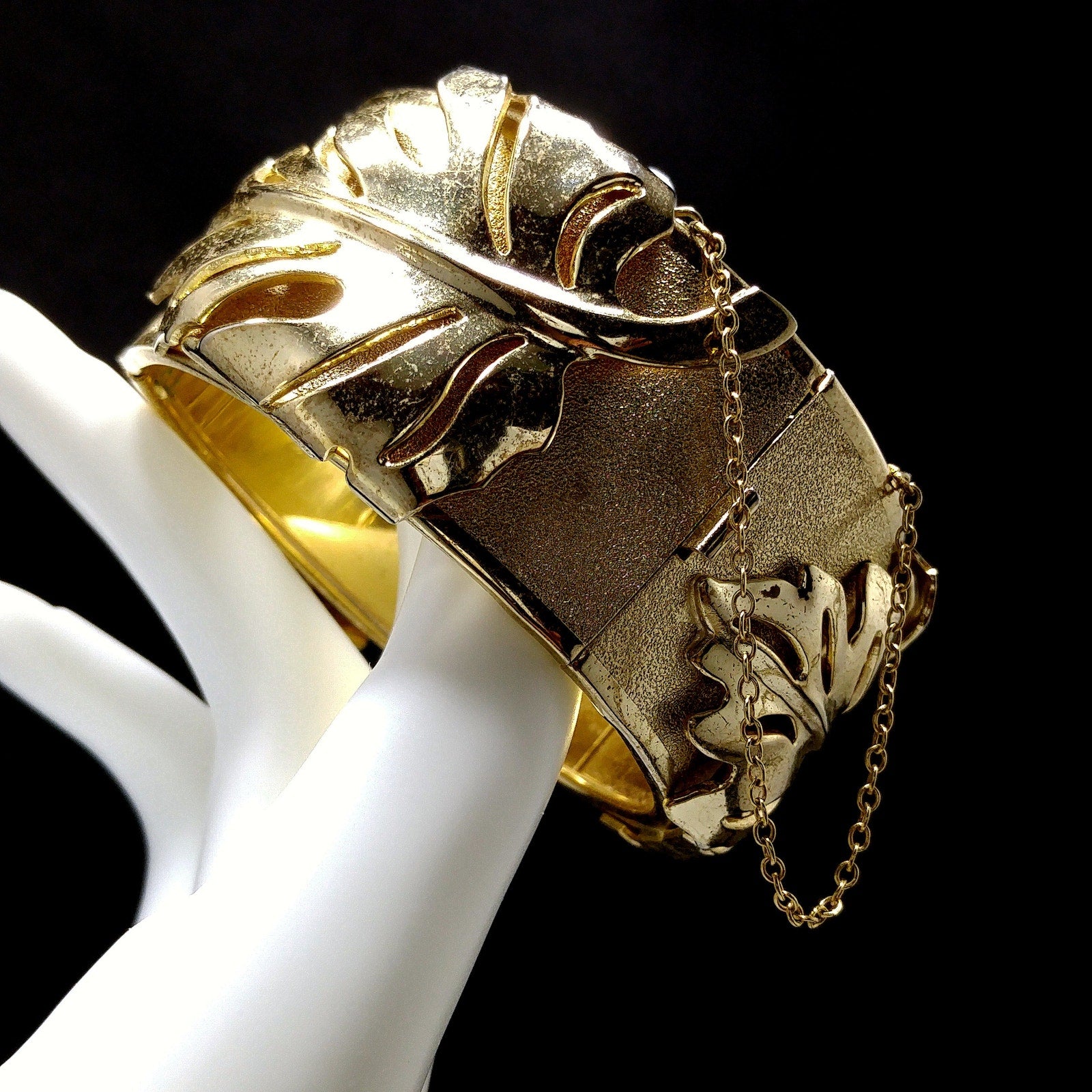 *Description: This is a very unique Whiting and Davis hinged bracelet in a leaf design with a safety chain from the 1950s. The unique design is the bracelet has two hinges, rather than one, so that this bracelet opens very wide with three sections, and then has a hidden box clasp with a built in safety chain to protect your bracelet from being lost. Each of the three sections, between the clasp and two hinges, have a large leaf which is a very reflective smooth gold plated leaf on a textured gold plated bracelet. The inside of the bracelet is stamped Whiting and Davis. This would be a great addition to your vintage jewelry collection or make a great vintage gift!