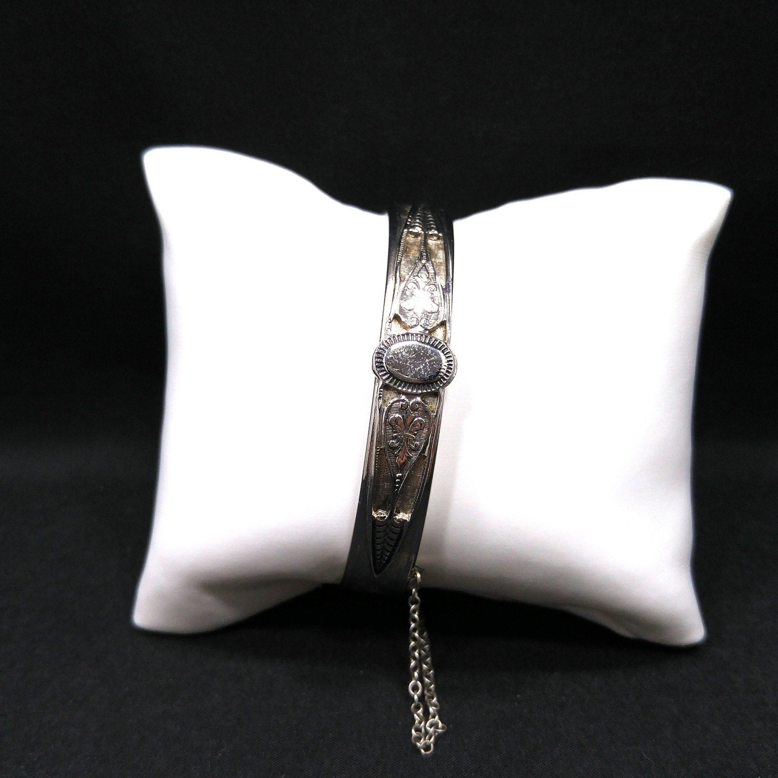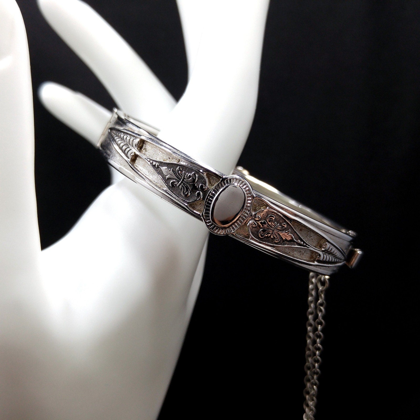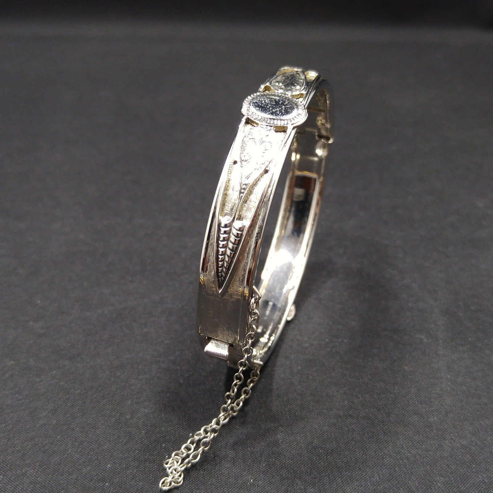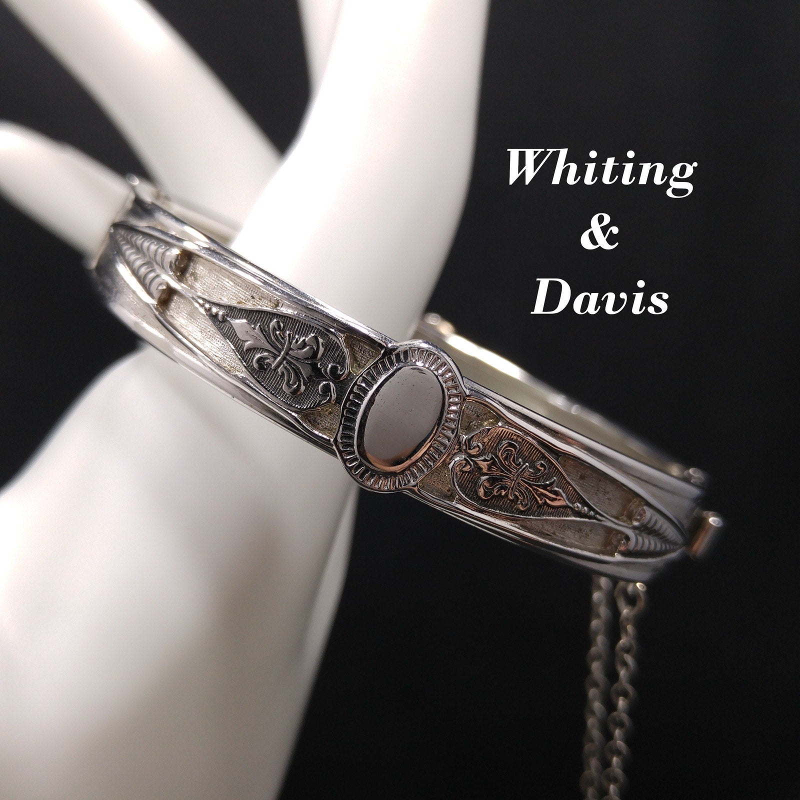 *Description: This is a great Whiting and Davis hinged bracelet with push lock clasp and safety chain from the 1960s. The silver tone bracelet is rhodium plated and has an oval design on each side which looks like a place for engraved initials or it could be left solid silver in color. The bracelet is in great condition and would be a great addition to your vintage jewelry collection or make a great vintage gift! Whiting & Davis began their company in 1926 and was famous for their mesh bags and mesh jewelry. They used heavy gold and silver tone rhodium plating with their signature stamped into the metal or on a metal hang tag. According to Julia C Carroll in Costume Jewelry 101, she states that it is unclear when the company first produced jewelry, although vintage advertising was available in 1931. She also states that they made metal jewelry designs which often include open latticework, mesh, and or intricate overlapping metal leaves. The metalwork often frames one large center piece, such as reverse carved glass cameos. Due to the high quality metal work and stones, the jewelry is highly collectible. During the 1950s, some items were reproductions of vintage museum jewelry.