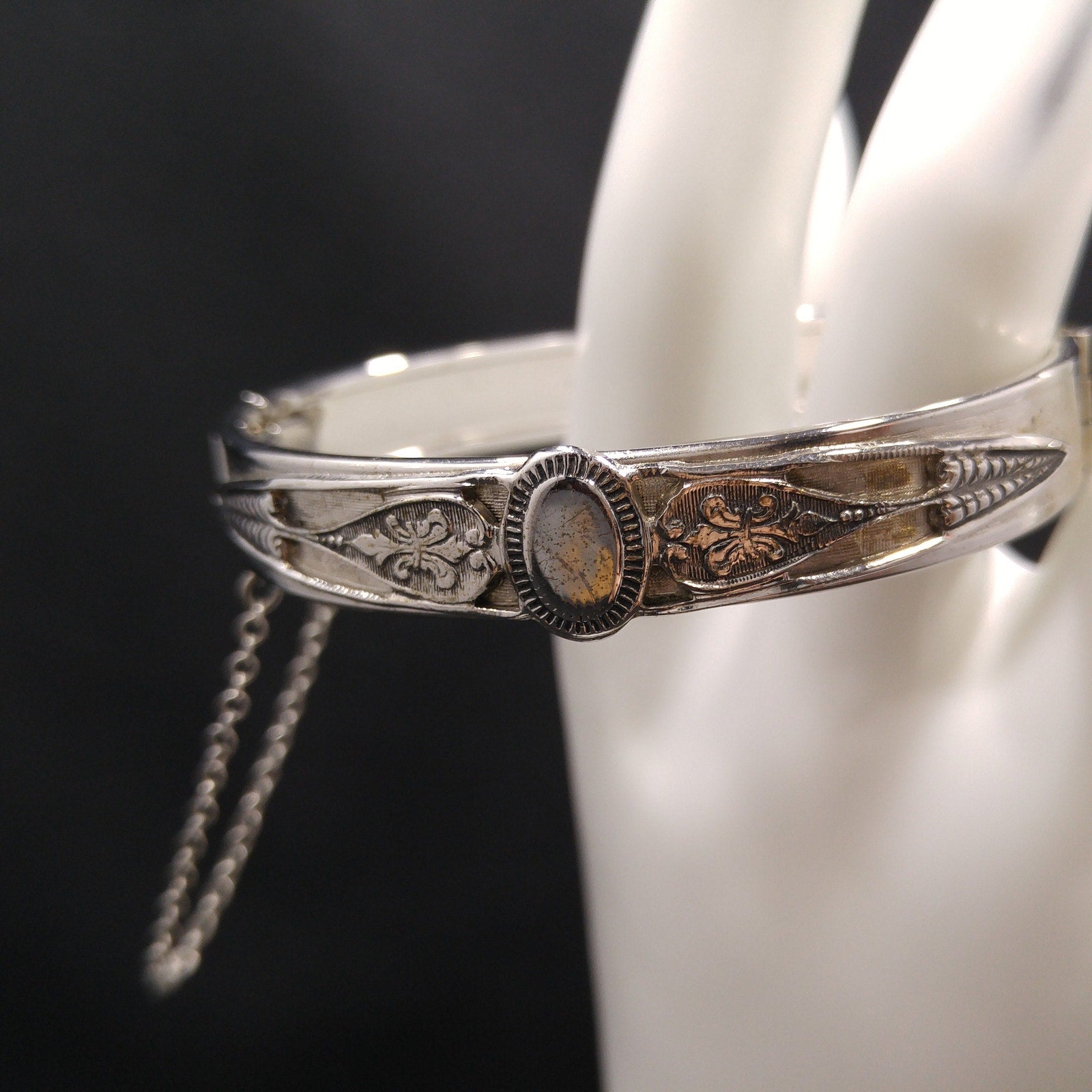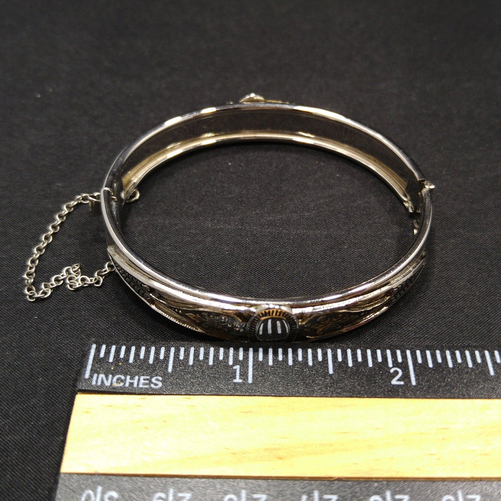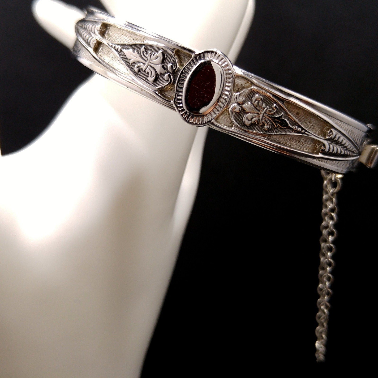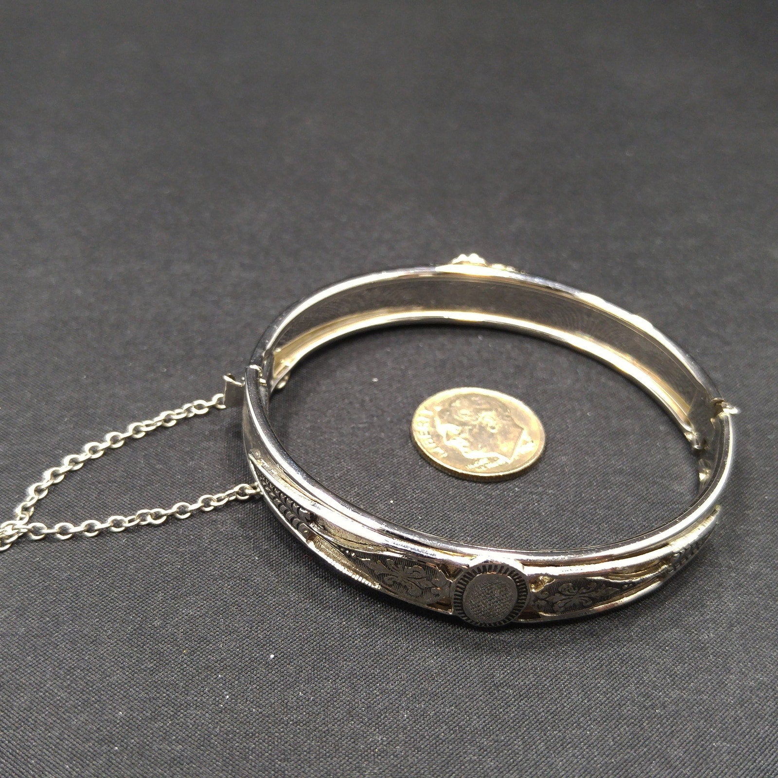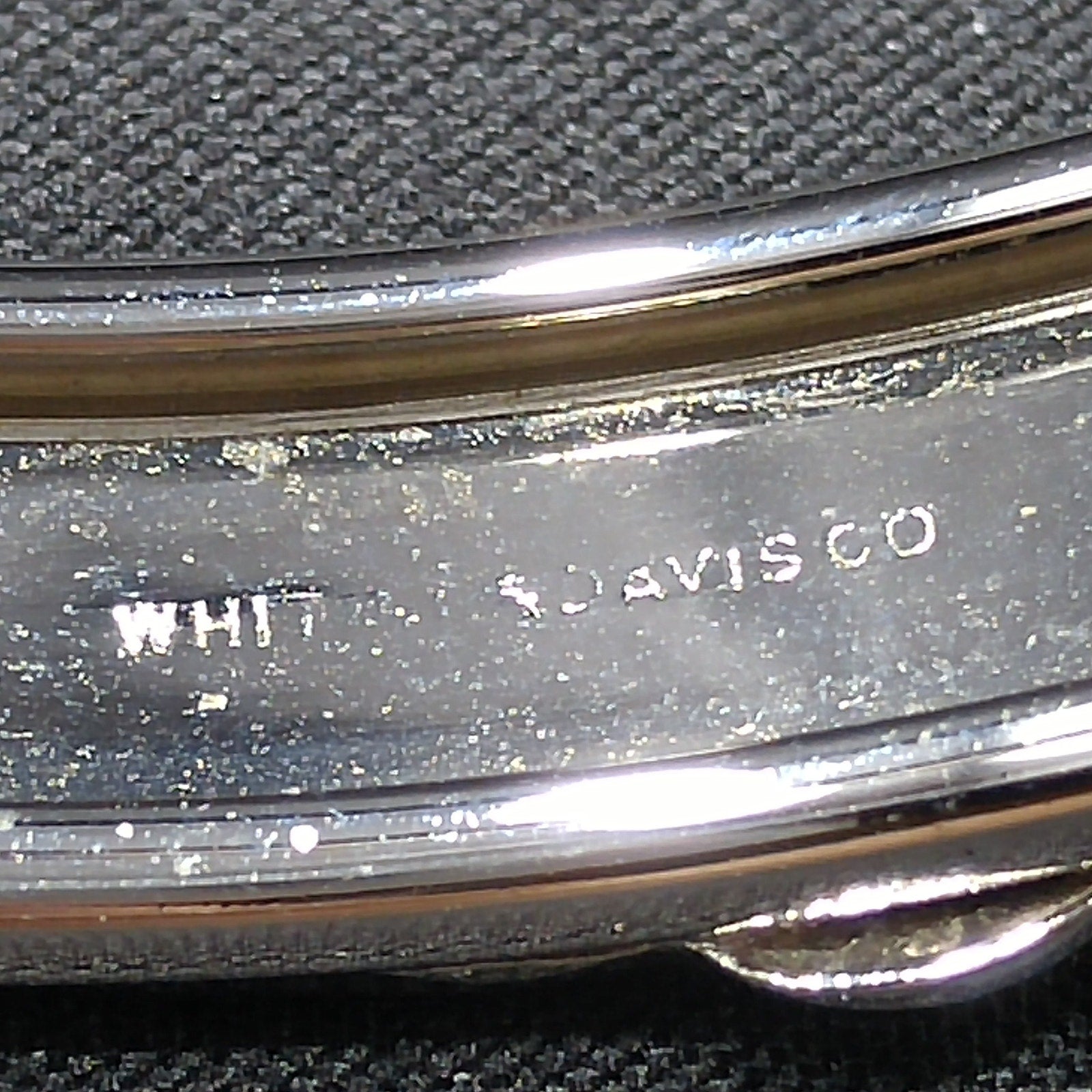 *Description: This is a great Whiting and Davis hinged bracelet with push lock clasp and safety chain from the 1960s. The silver tone bracelet is rhodium plated and has an oval design on each side which looks like a place for engraved initials or it could be left solid silver in color. The bracelet is in great condition and would be a great addition to your vintage jewelry collection or make a great vintage gift! Whiting & Davis began their company in 1926 and was famous for their mesh bags and mesh jewelry. They used heavy gold and silver tone rhodium plating with their signature stamped into the metal or on a metal hang tag. According to Julia C Carroll in Costume Jewelry 101, she states that it is unclear when the company first produced jewelry, although vintage advertising was available in 1931. She also states that they made metal jewelry designs which often include open latticework, mesh, and or intricate overlapping metal leaves. The metalwork often frames one large center piece, such as reverse carved glass cameos. Due to the high quality metal work and stones, the jewelry is highly collectible. During the 1950s, some items were reproductions of vintage museum jewelry.