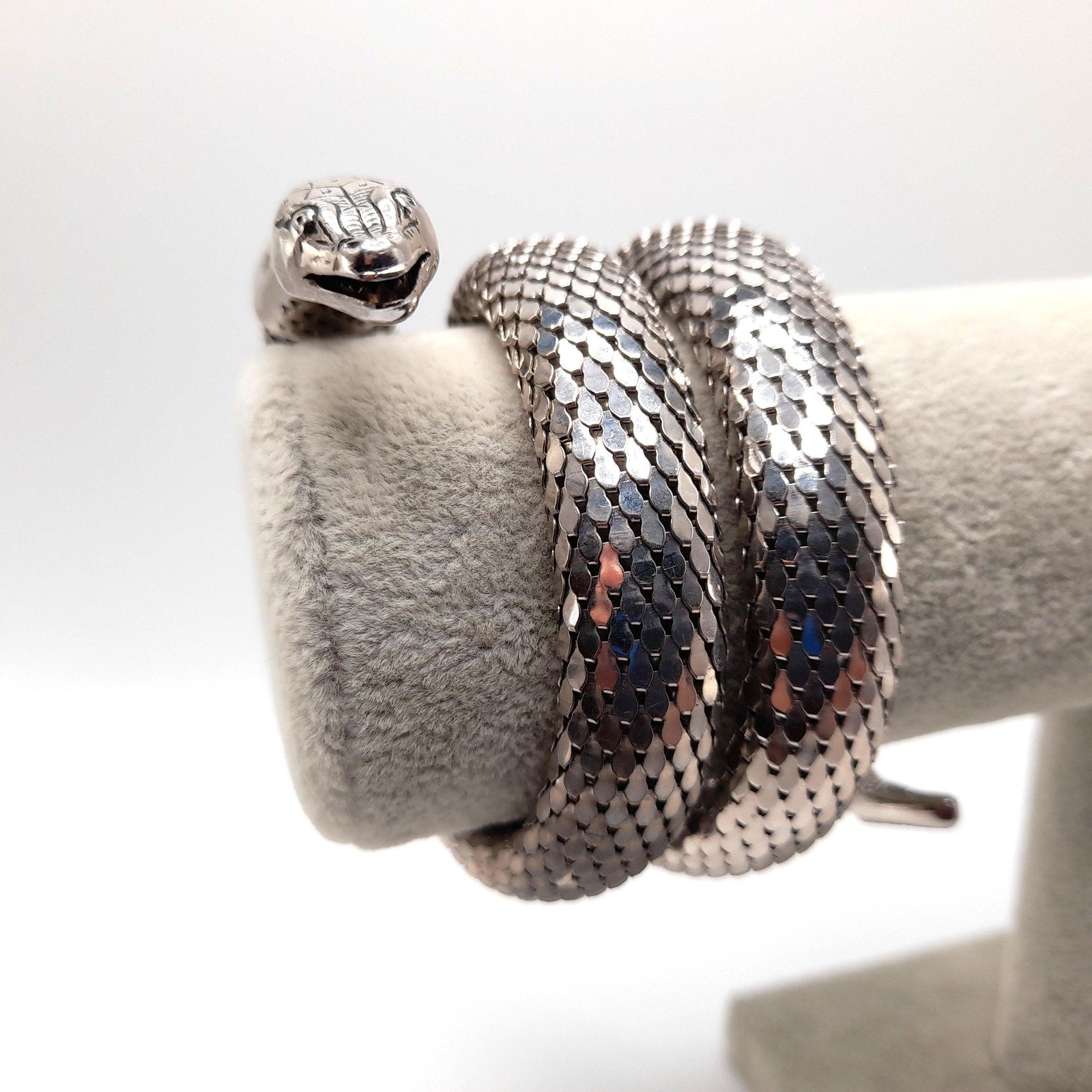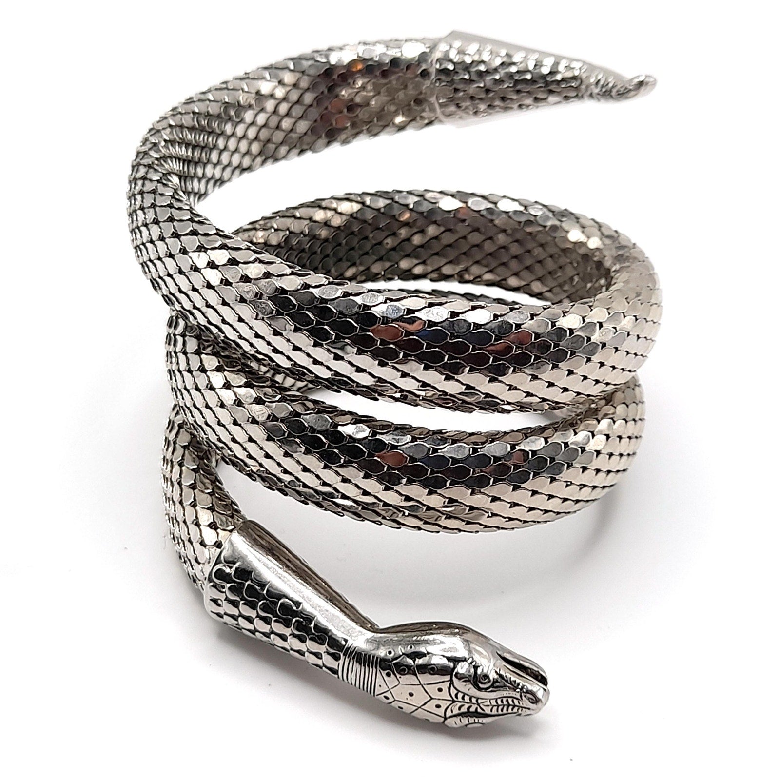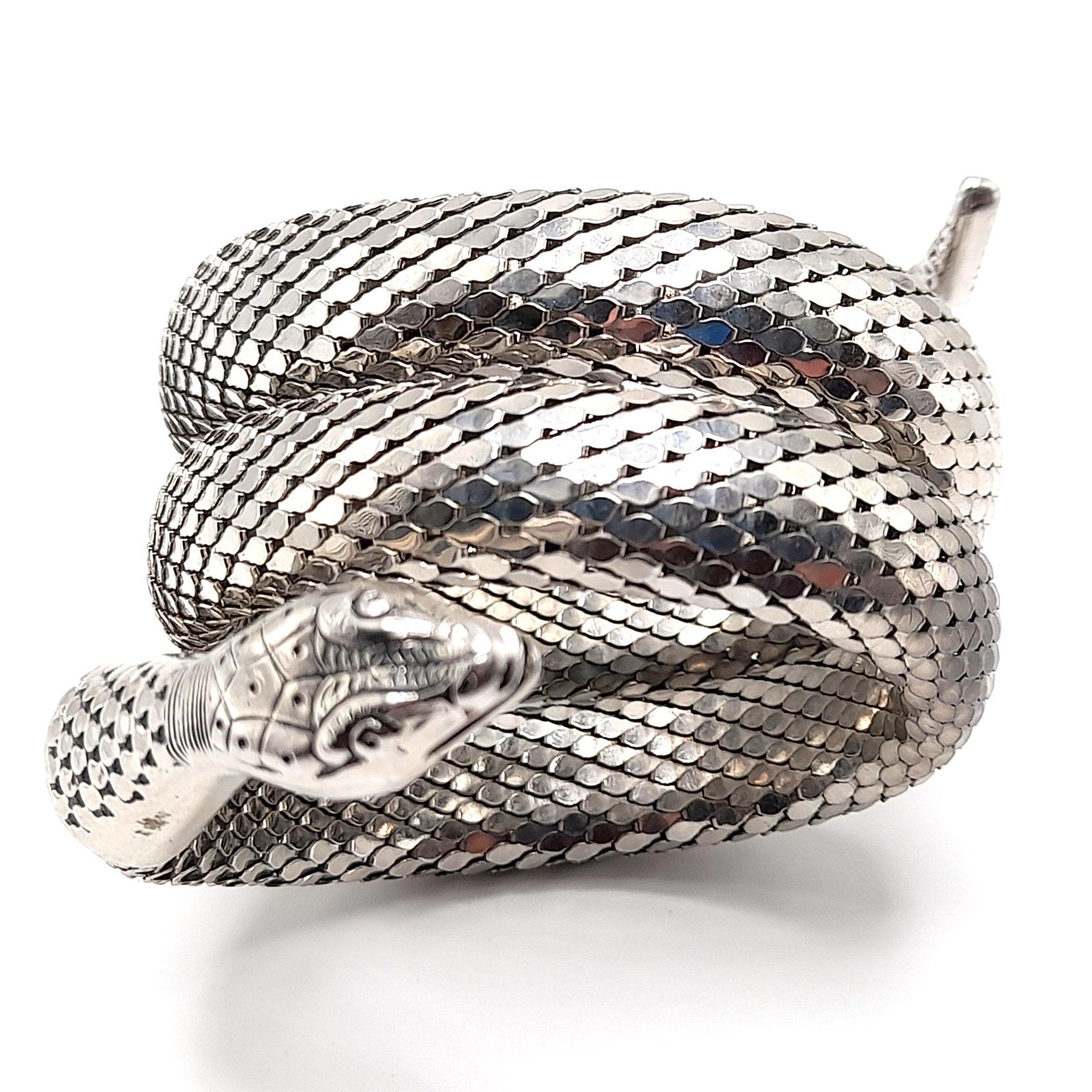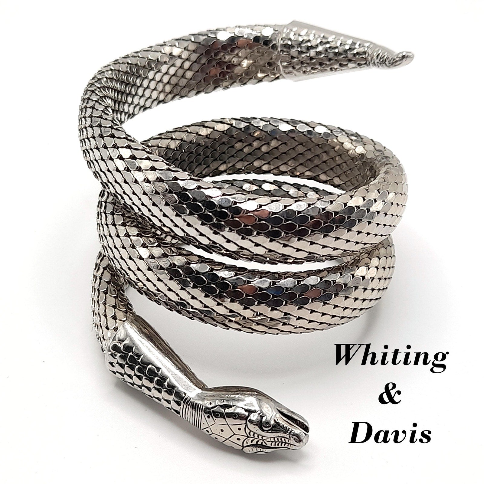 *Description: This is a great snake mesh bracelet by Whiting & Davis from the 1970s. It fits around the lower portion of the arm, unless you have a very small arm where you can wear it higher on the arm. It is Egyptian Revival which was very popular in the 1970s. This Whiting & Davis snake mesh coiled bracelet is a book piece featured in Julia Carroll's Costume Jewelry 202 on page 472. Carroll shared three catalog pages from 1976 - 1977 that featured the "Mesh Collection" which included the rhodium plated mesh cuff bracelet which is triple coiled. This would be a great addition to your vintage jewelry collection or make a great vintage gift!