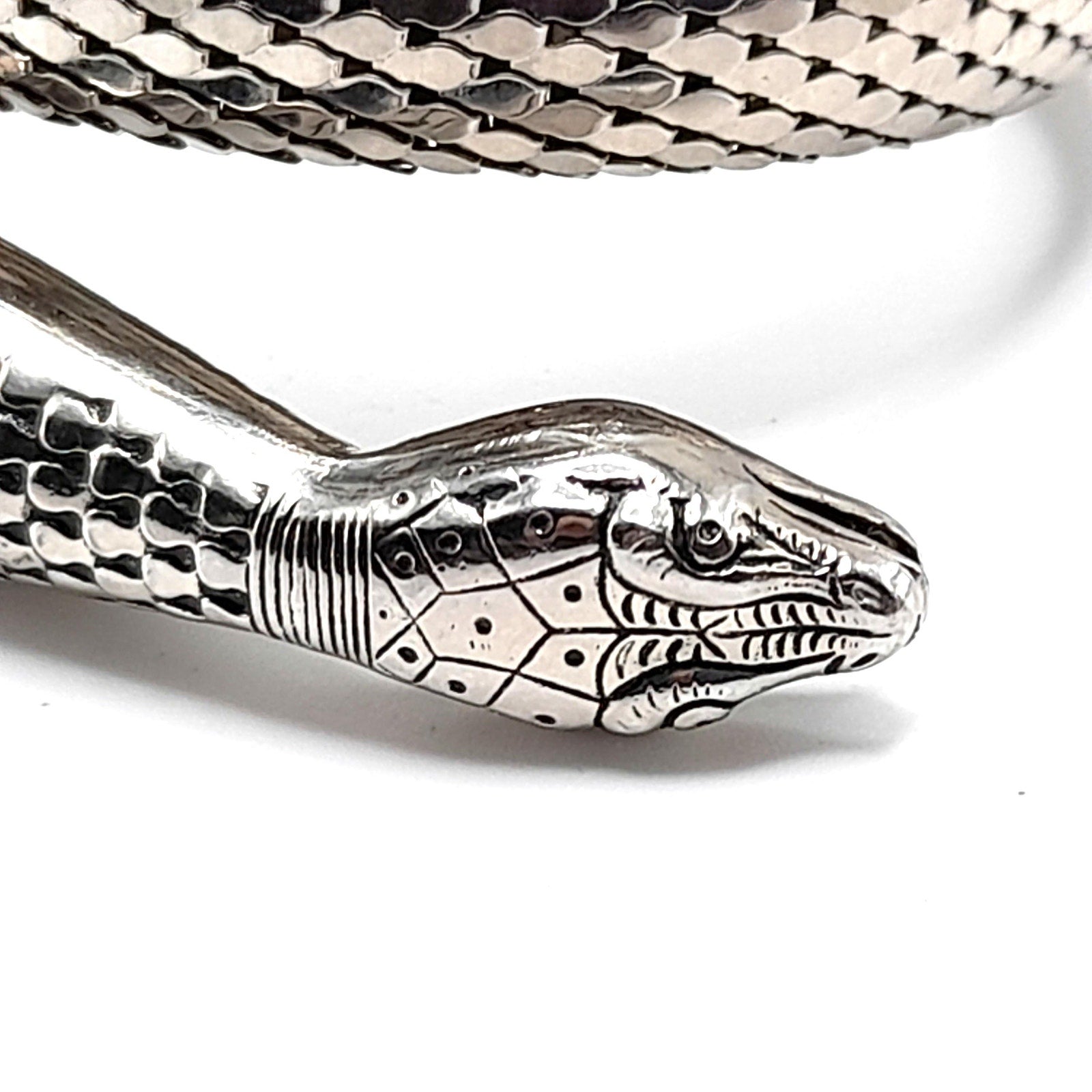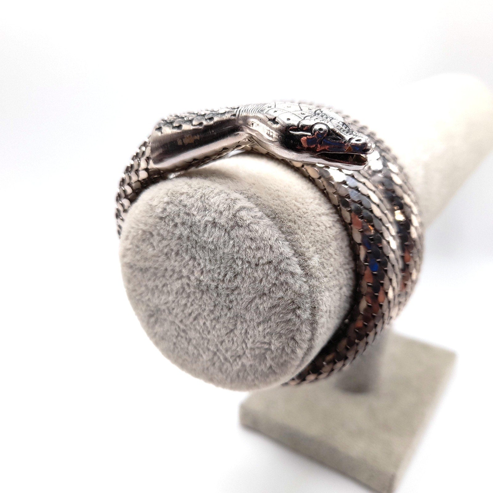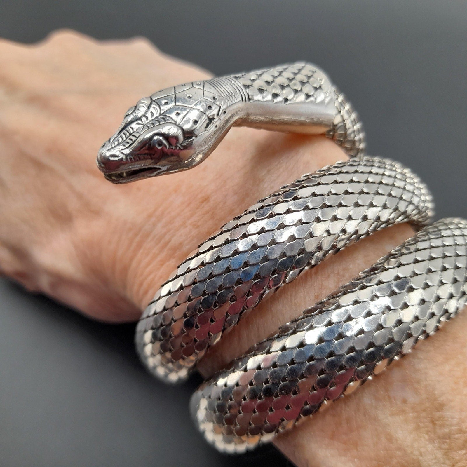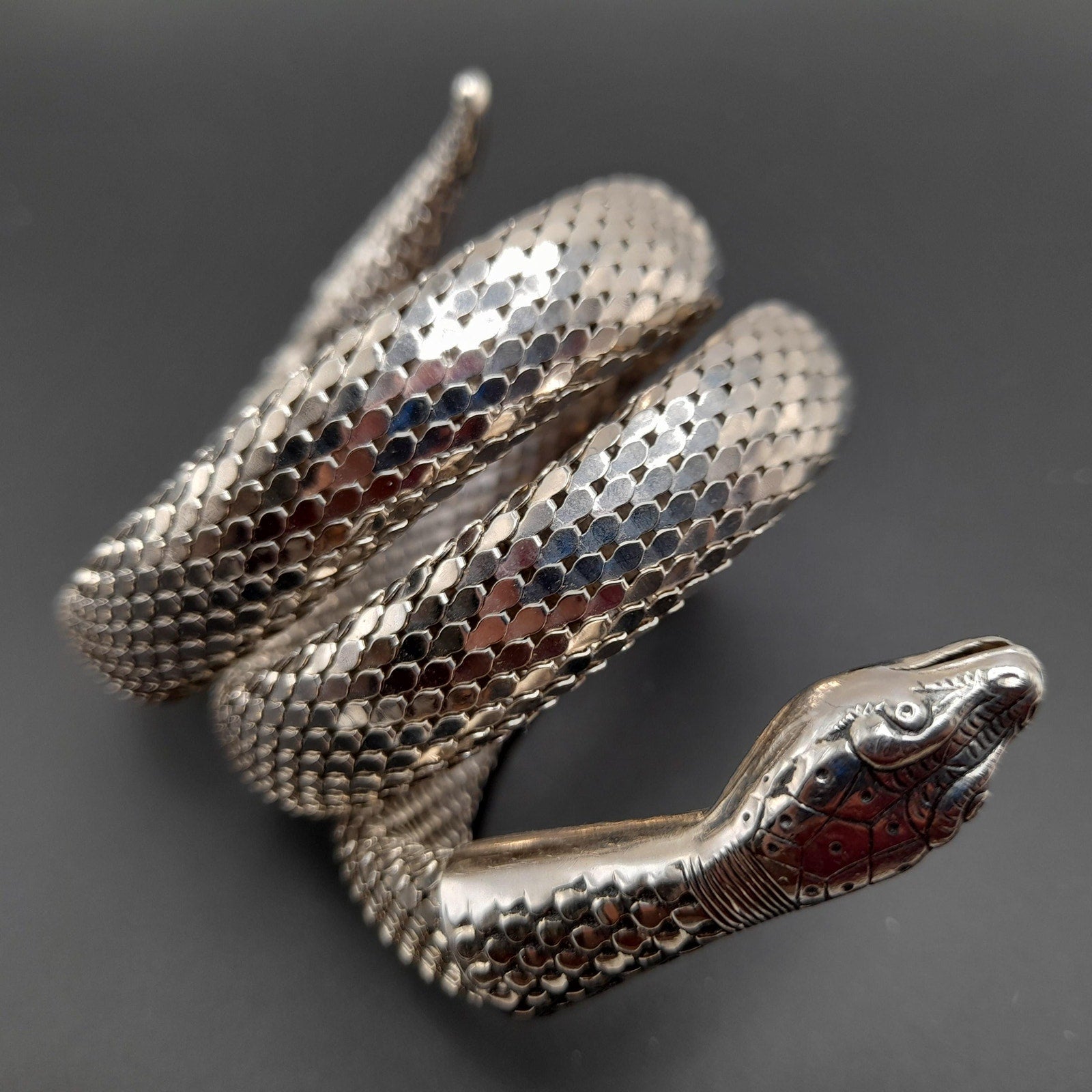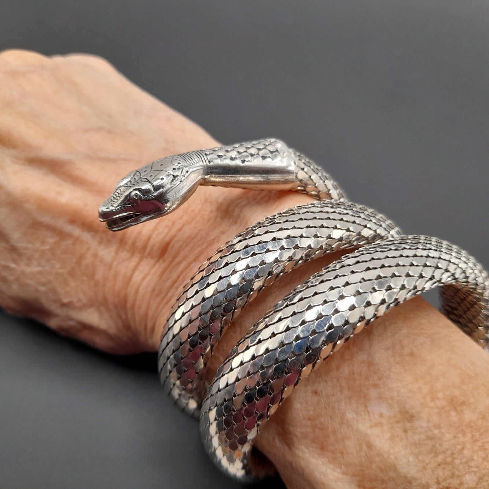 *Description: This is a great snake mesh bracelet by Whiting & Davis from the 1970s. It fits around the lower portion of the arm, unless you have a very small arm where you can wear it higher on the arm. It is Egyptian Revival which was very popular in the 1970s. This Whiting & Davis snake mesh coiled bracelet is a book piece featured in Julia Carroll's Costume Jewelry 202 on page 472. Carroll shared three catalog pages from 1976 - 1977 that featured the "Mesh Collection" which included the rhodium plated mesh cuff bracelet which is triple coiled. This would be a great addition to your vintage jewelry collection or make a great vintage gift!