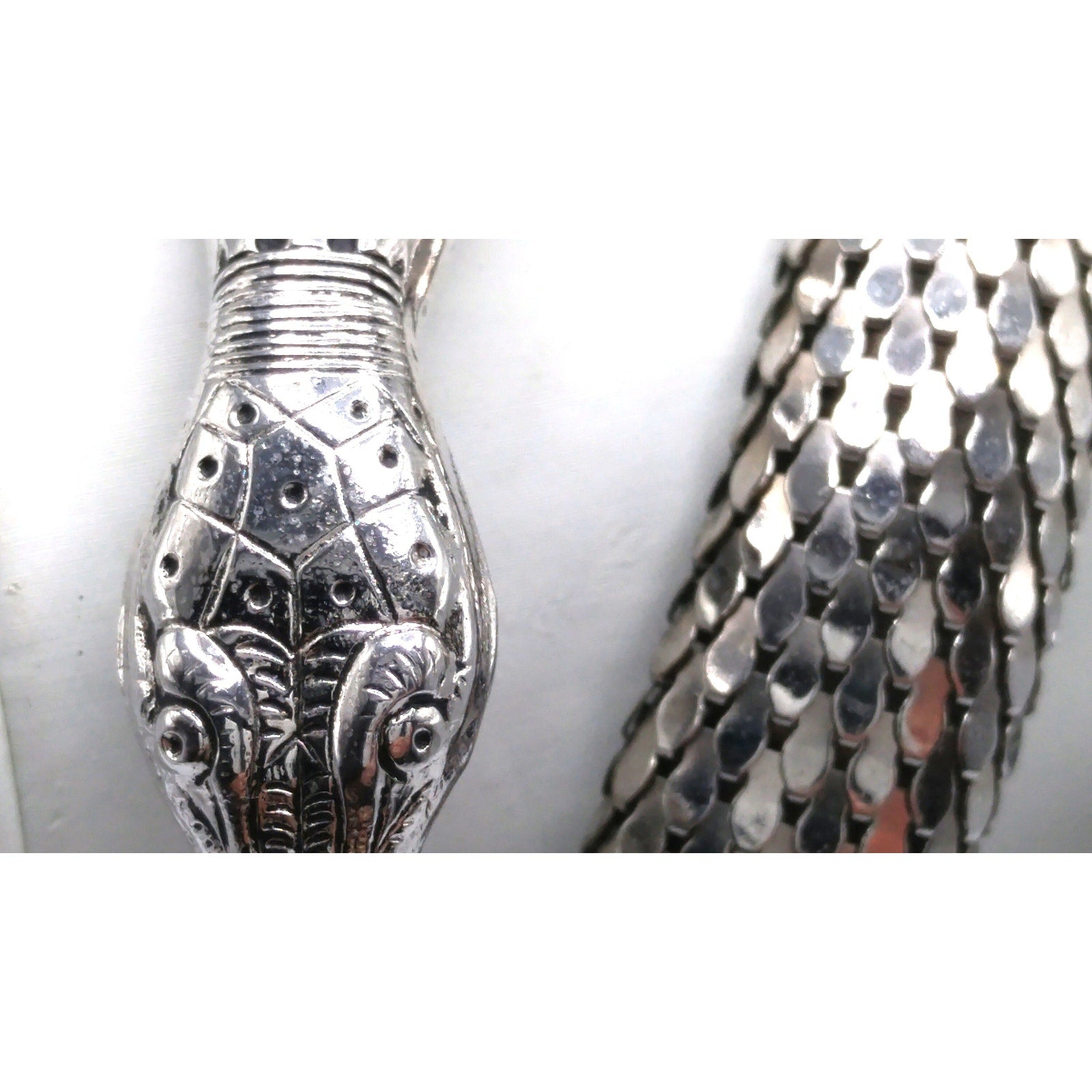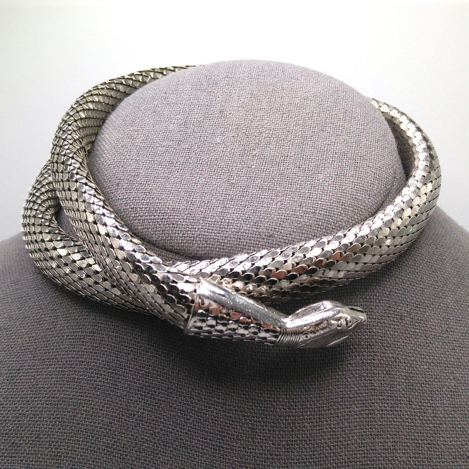 The rhodium-plated design features a detailed serpent head and tail with engraved scales, coiled in gleaming silver mesh that can be shaped to fit comfortably around the neck or upper arm. This versatile and dramatic piece was part of Whiting & Davis’s famous “Mesh Collection” (1976–1977) and is a book piece featured in Julia Carroll’s Costume Jewelry 202, page 472.