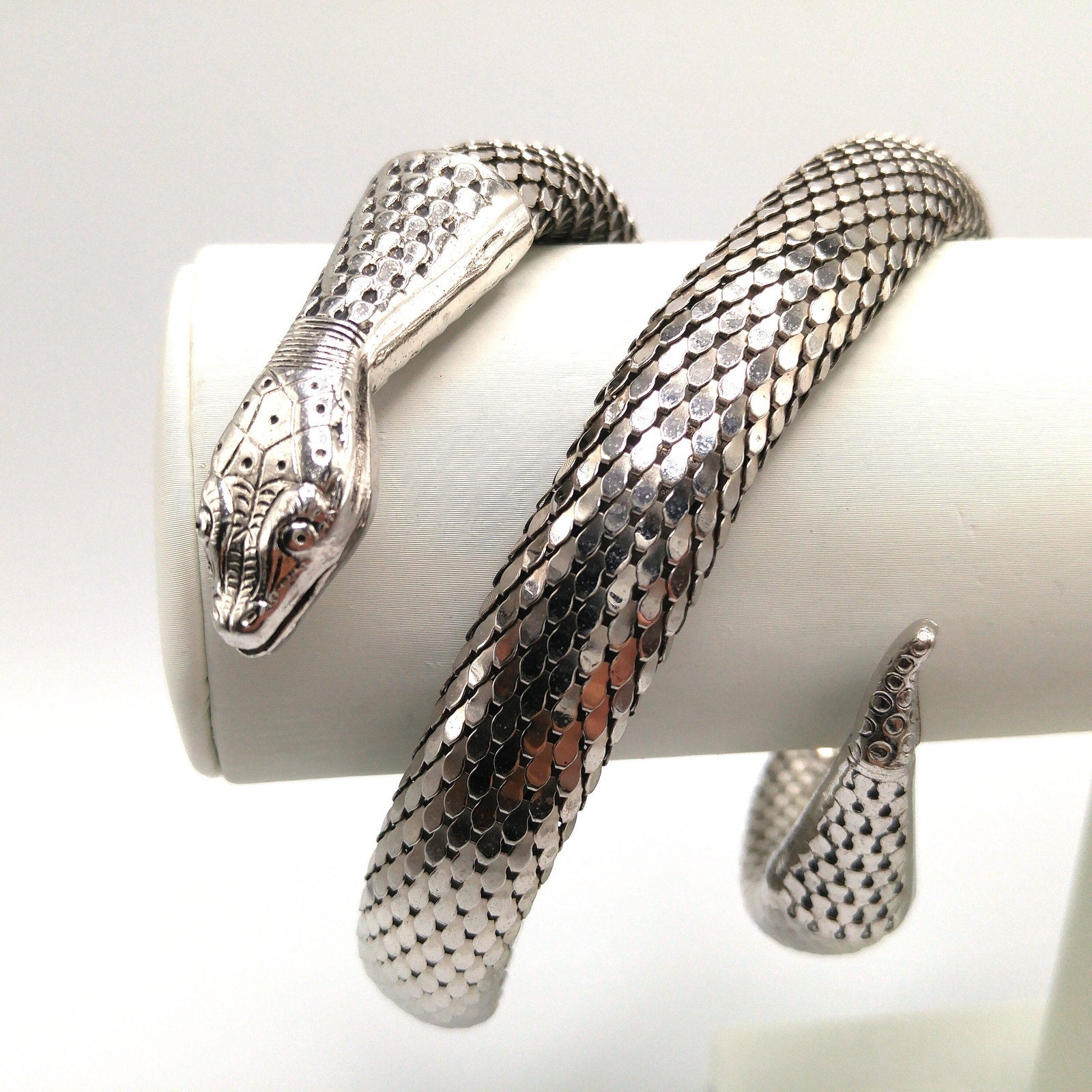 Whiting & Davis, renowned for their mesh handbags and jewelry since the early 20th century, produced high-quality metal designs with intricate latticework, overlapping scales, and heavy rhodium plating. Their serpent designs remain among the most collectible of their creations — bold, fluid, and timeless.