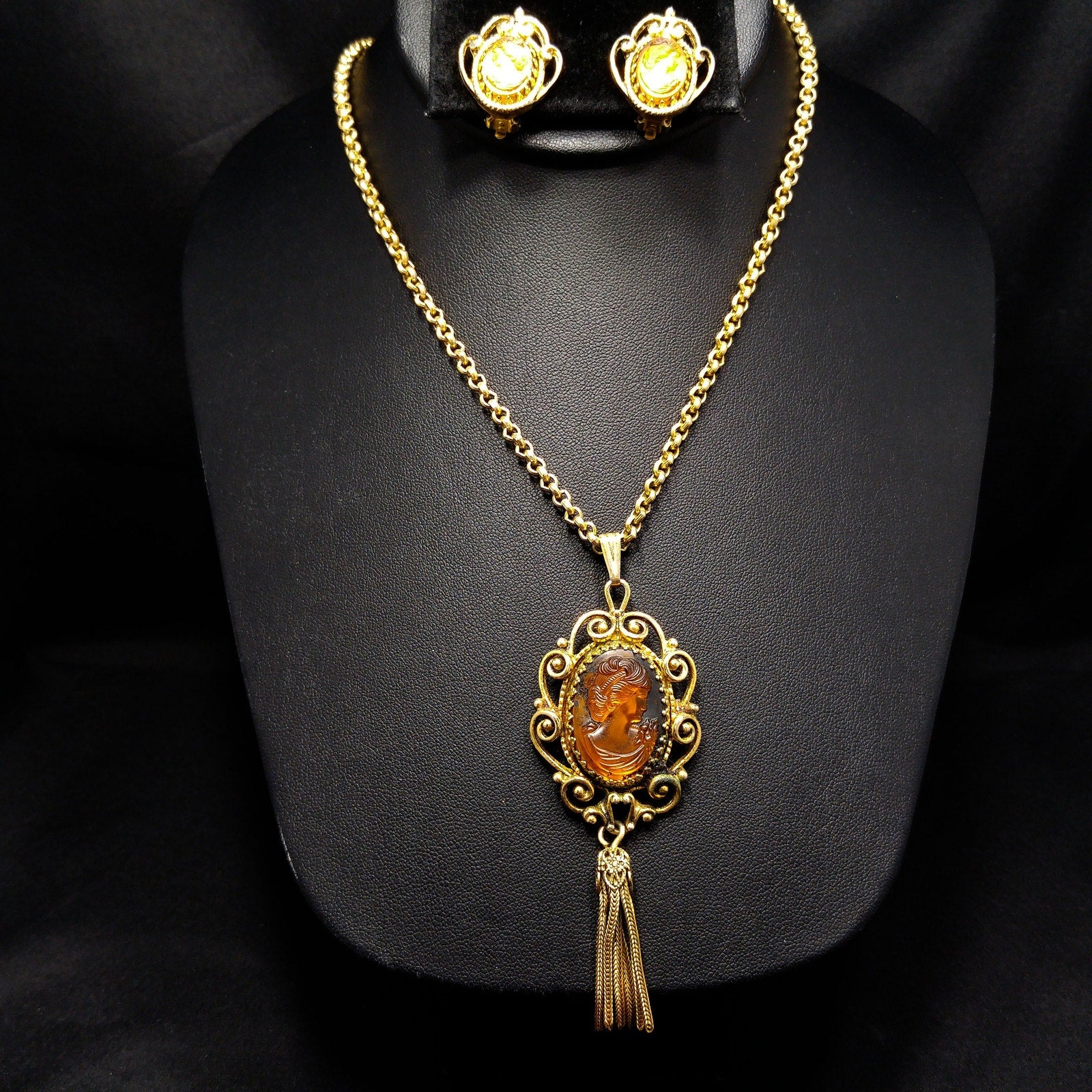 Whiting & Davis Topaz Cameo Necklace & Clip Earrings Set w/ Tassel 1976 Book Piece