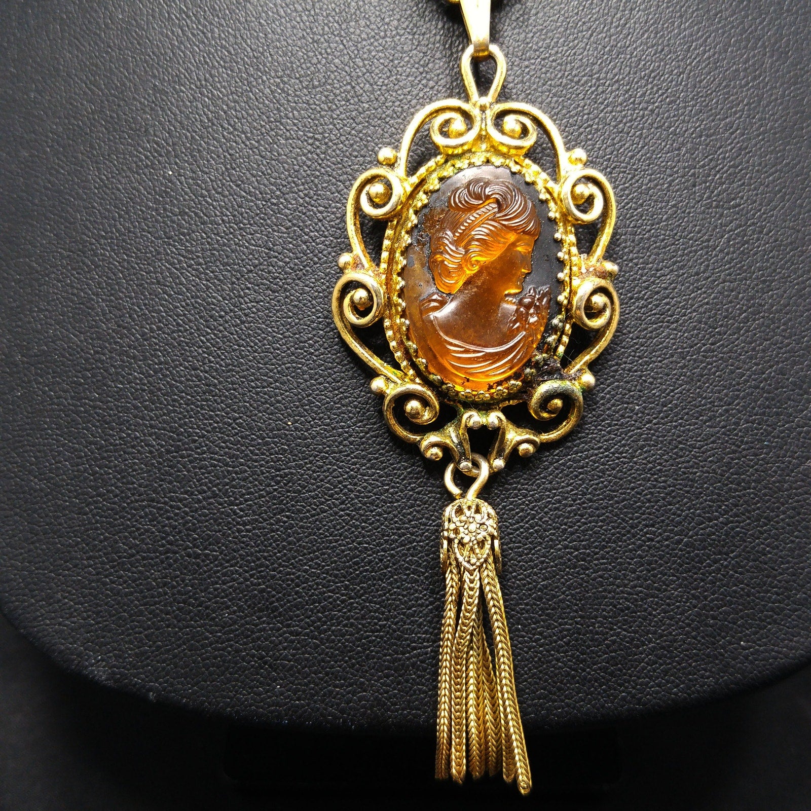*Description: This is a beautiful Whiting & Davis Topaz Cameo necklace and clip on earrings from 1976-1977. This set is a book piece and is listed in "Collecting Costume Jewelry 303" by Julia C. Carroll on page 328 and 329. On page 329, Carroll shares the advertisement for this set within the Cameo Collection. The description within the advertisement states, "Our stunning Topaz and Crystal Cameos, delicately framed - with a classical foxtail tassel accenting the neck..."There are close-ups of the necklace on the precious page. I tested the gold surface metal and it tested as 10K gold plate. This is a beautiful set and would be a great addition to your vintage jewelry collection or make a great vintage gift!