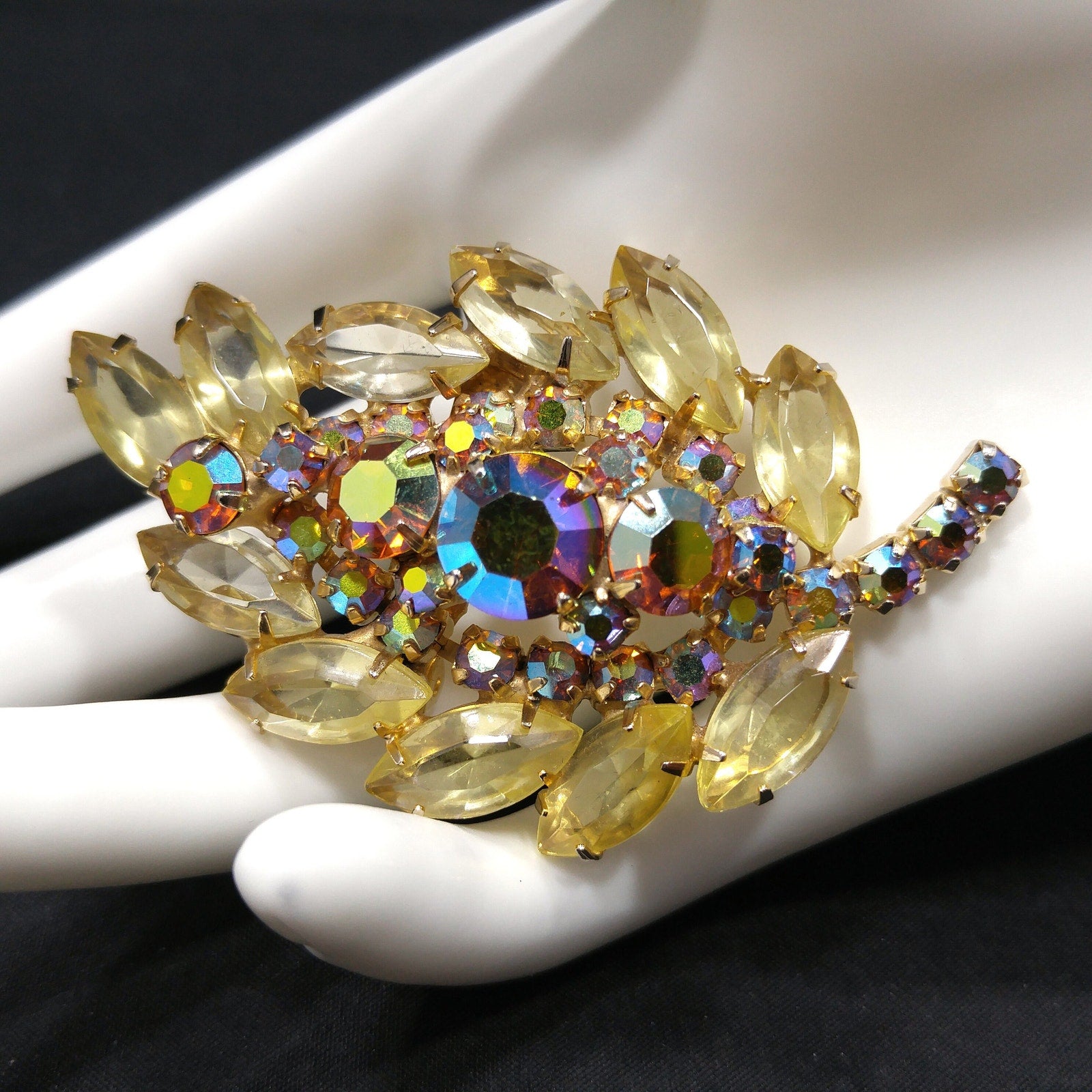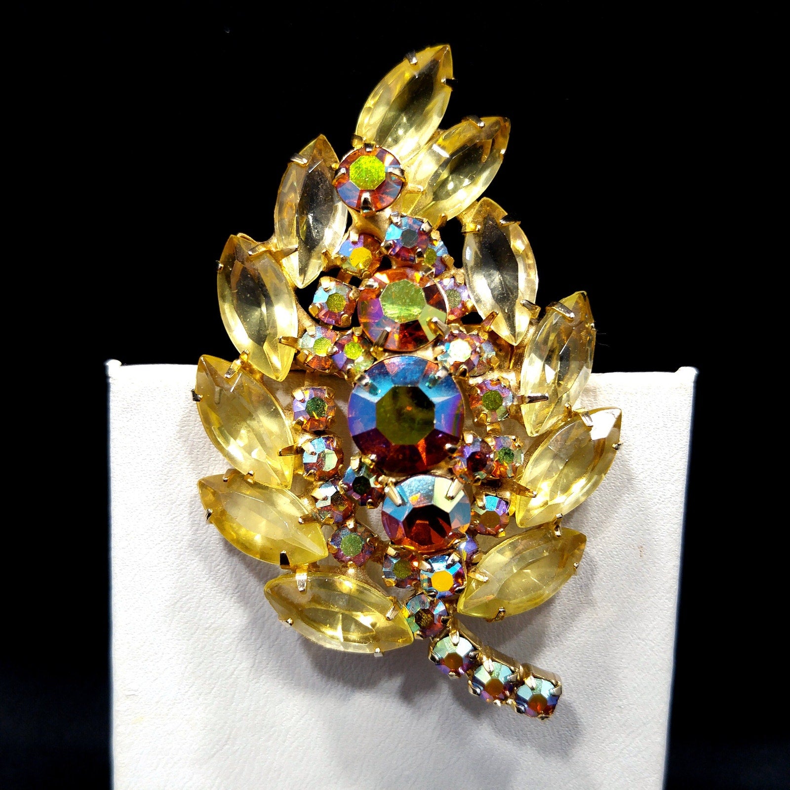 *Description: This is a beautiful yellow rhinestone and topaz aurora borealis rhinestone leaf brooch with a gold plated backing from the 1960s. This would be a great addition to your vintage jewelry collection or make a great vintage gift!