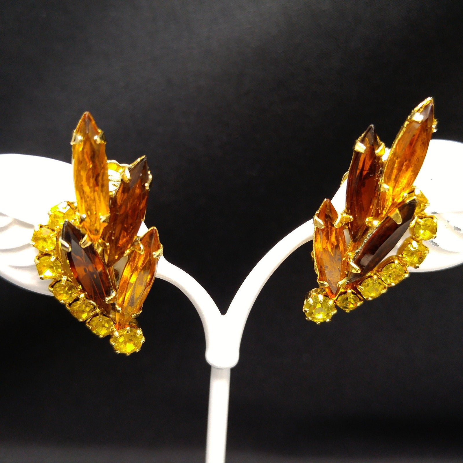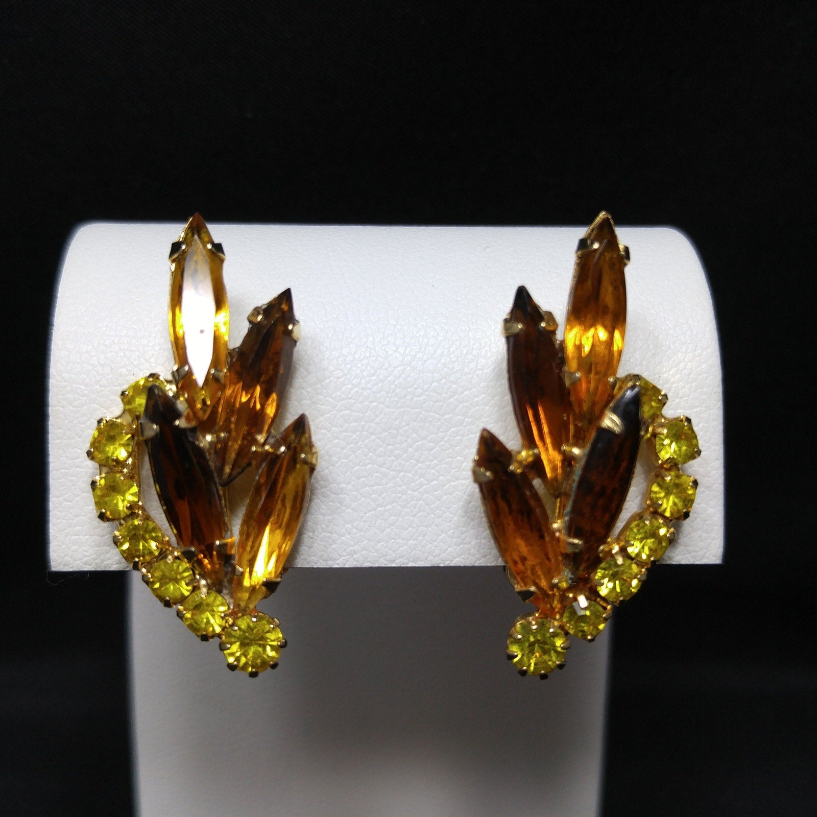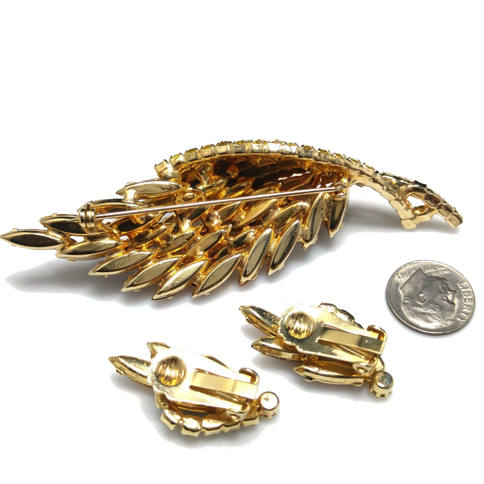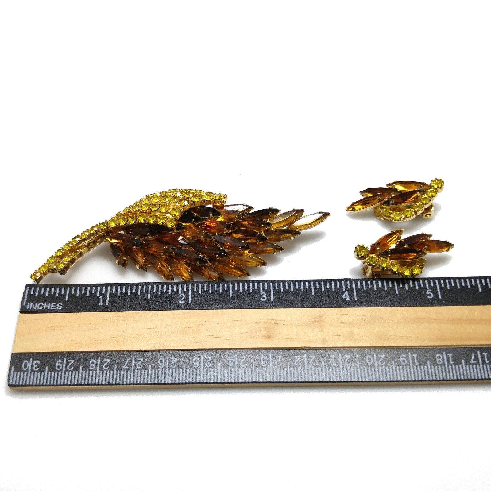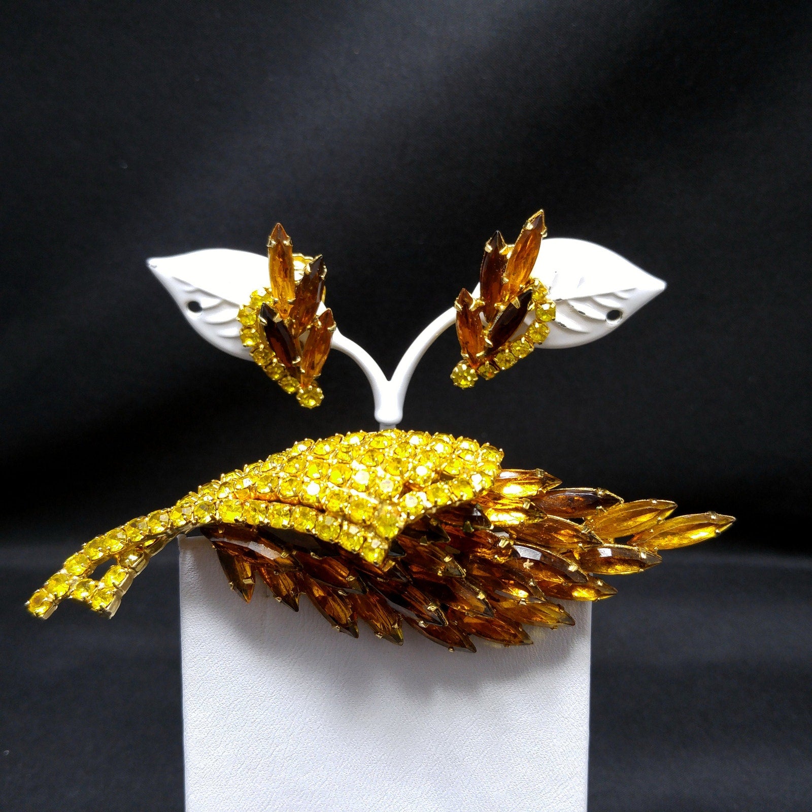 *Description: This is a very unique and beautiful yellow and topaz rhinestone brooch and matching clip on earrings from the 1960s. Each rhinestone is prong set and sits on a gold plated setting. The earrings are clip on earrings. The topaz rhinestone floral spray is capped with a yellow rhinestone top in a wide design of 3 7/8 Inches. This is a great vintage statement brooch and earrings. If you are looking for a unique vintage mid-century jewelry set, this one is perfect for you. This would be a great addition to your vintage jewelry collection or make a great vintage gift!